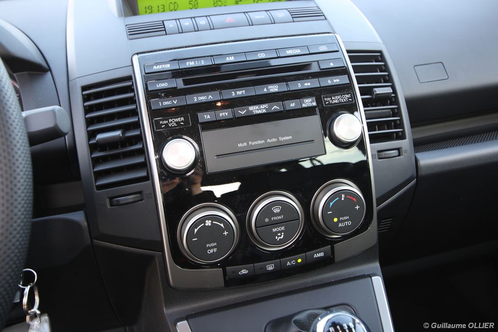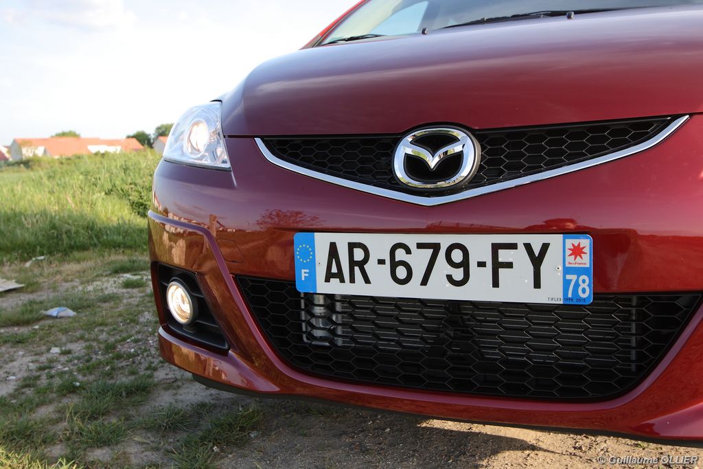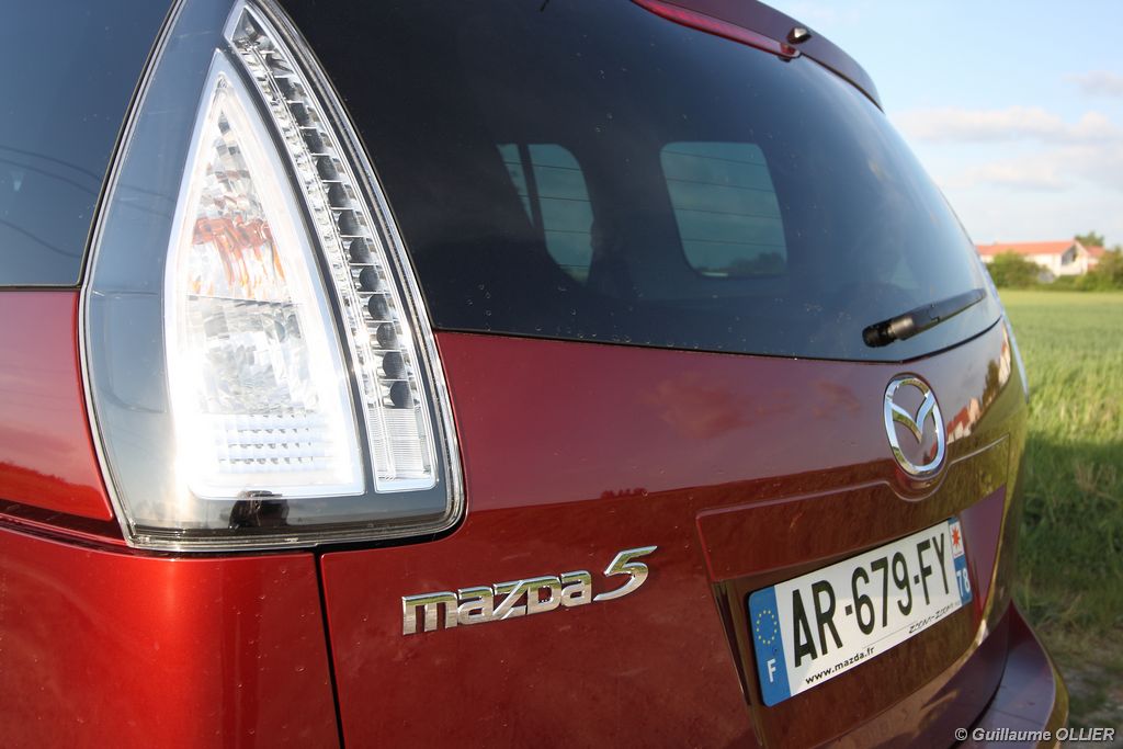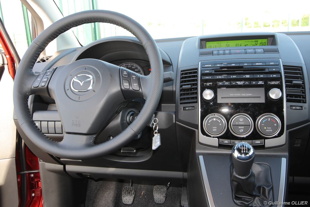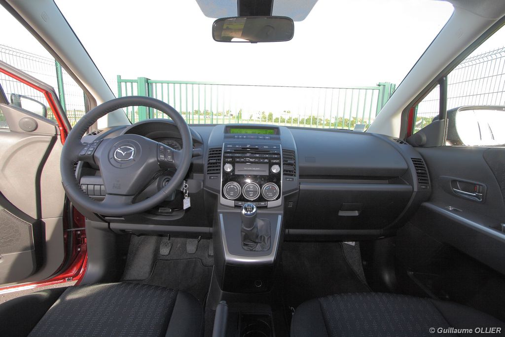 Concevoir un monospace compacte avec un design qui sort de l’ordinaire, tout en lui greffant deux portes coulissantes est un réel défi. L’allure général du Mazda 5 est plutôt dynamique. Cette nouvelle version comporte plusieurs retouches. A l’avant le bouclier évolue en devenant plus agressif et une grille type « nid d’abeille » est intégrée dans la calandre. Pour la partie arrière, seules les feux ont été modifiés par des blocs bicolores avec rampes à LED. Les portes latérales coulissantes sont très bien intégrées, on ne remarque pas forcément les rails. Le profil est galbé et les lignes globalement tirées vers le haut. Les jantes 17 pouces et les vitres arrière teintées donne un petit aspect sportif à l’allure du véhicule. A noter qu’un Pack Sport est disponible au catalogue, incluant une calandre et un bouclier spécifiques, des jupes latérales, et un becquet arrière. Concevoir un monospace compacte avec un design qui sort de l’ordinaire, tout en lui greffant deux portes coulissantes est un réel défi. L’allure général du Mazda 5 est plutôt dynamique. Cette nouvelle version comporte plusieurs retouches. A l’avant le bouclier évolue en devenant plus agressif et une grille type « nid d’abeille » est intégrée dans la calandre. Pour la partie arrière, seules les feux ont été modifiés par des blocs bicolores avec rampes à LED. Les portes latérales coulissantes sont très bien intégrées, on ne remarque pas forcément les rails. Le profil est galbé et les lignes globalement tirées vers le haut. Les jantes 17 pouces et les vitres arrière teintées donne un petit aspect sportif à l’allure du véhicule. A noter qu’un Pack Sport est disponible au catalogue, incluant une calandre et un bouclier spécifiques, des jupes latérales, et un becquet arrière.