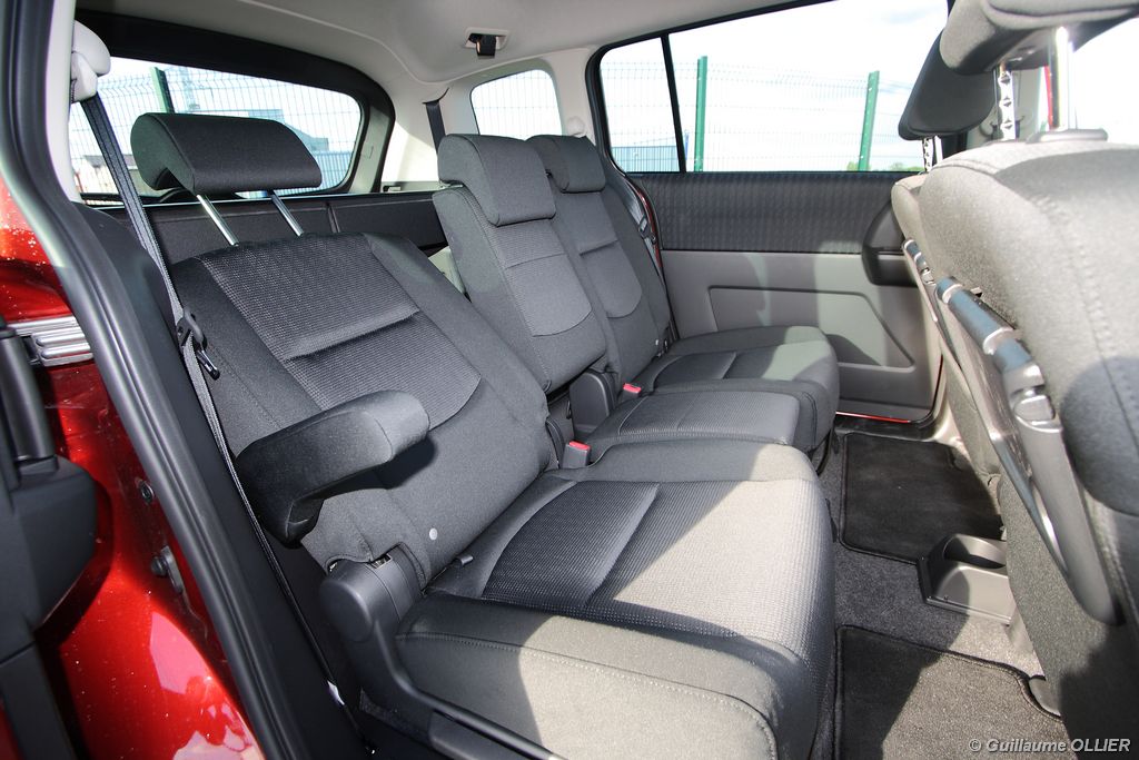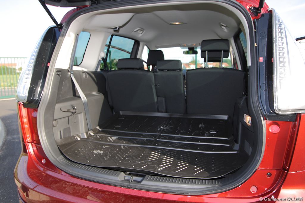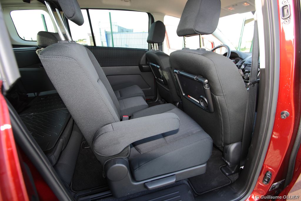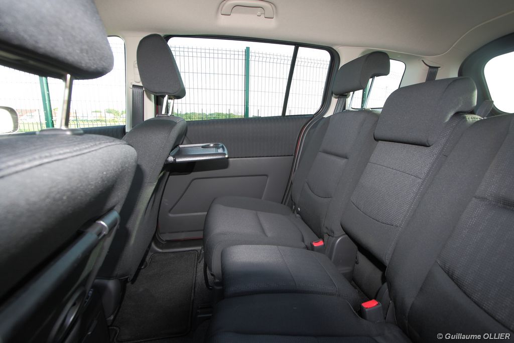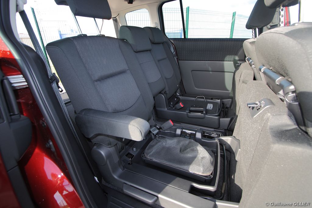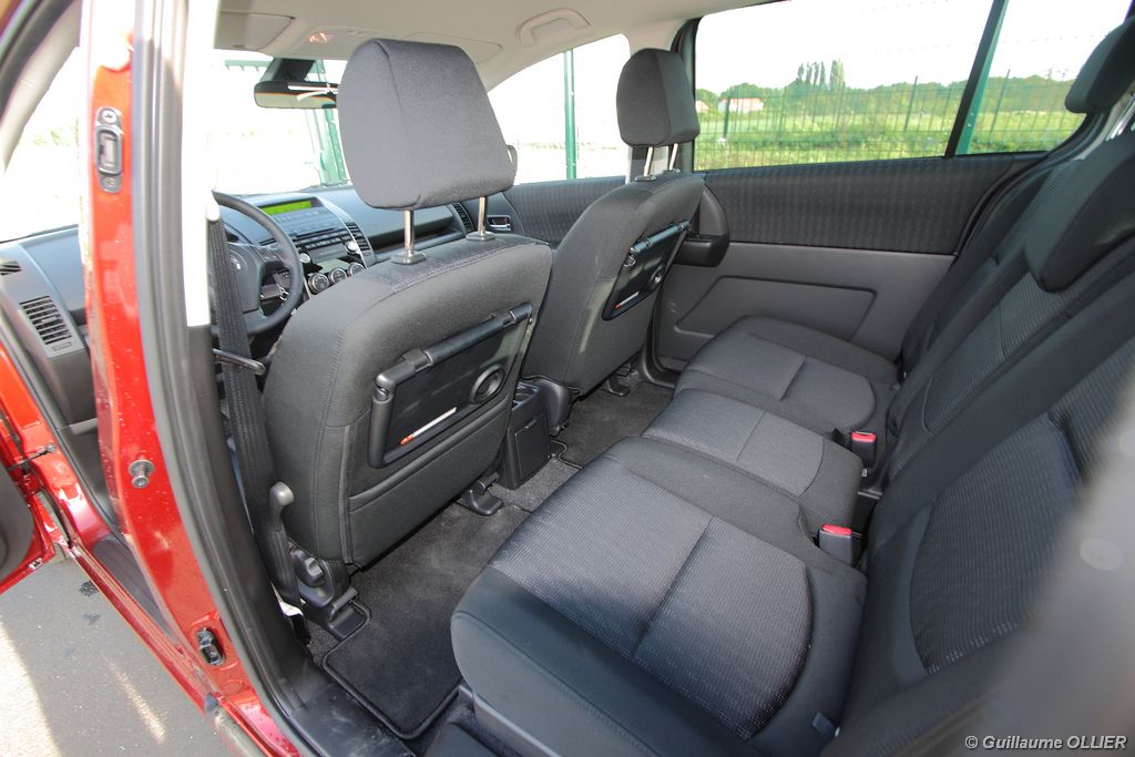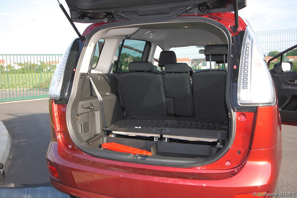 La finition est bonne, notamment pour les assemblages mais l’ensemble manque un peu de fantaisie. Les compteurs par exemple sont très basiques. La position de conduite est agréable, avec un volant cuir réglable en hauteur et en profondeur. Le levier de vitesse tombe parfaitement sous la main. Notre modèle possède la finition « Elégance », la première sur les deux du catalogue. Elle comprend la climatisation automatique, un lecteur de CD/MP3 avec prise Jack compatible iPod, et le régulateur de vitesse. La finition du dessus baptisé « Performance » est doté en plus d’un chargeur CD, du kit mains libres Bluetooth, de deux sièges supplémentaire et des portes arrières coulissantes électriques. Il est également possible d’ajouter le pack GPS pour 3 250 € de plus. Malheureusement ce pack comprend des équipements qui auraient pu être dissocier : GPS, radars de recul, phares au xénon. A l’avant c’est confortable et il y a de l’espace. Seul le conducteur bénéficie d’un accoudoir. Les places arrière sont spacieuses, à l’exception de celle du milieu, ce qui est dommage pour un véhicule dit « monospace ». En contrepartie ce siège centrale dispose d’un aménagement nommé « karakuri », c’est-à-dire qu’il est escamotable. L’assise peut se ranger dans le siège d’à côté, et le dossier sert alors d’accoudoir ou de porte gobelets. Les dossiers peuvent également se régler, tout comme l’axe de profondeur des sièges. Deux personnes peuvent s’installer dans le coffre grâces à deux sièges escamotables au 3ème rang disponibles avec la finition Performance. Le volume de chargement possible s’étend de 112 litres à 1 566 litres en rabattant les sièges de la deuxième rangée.