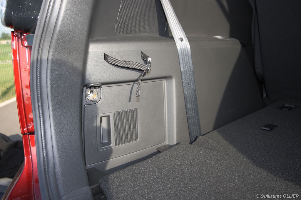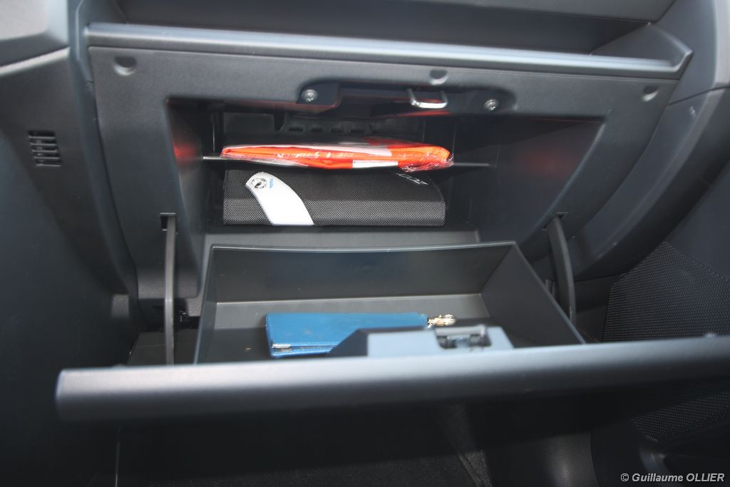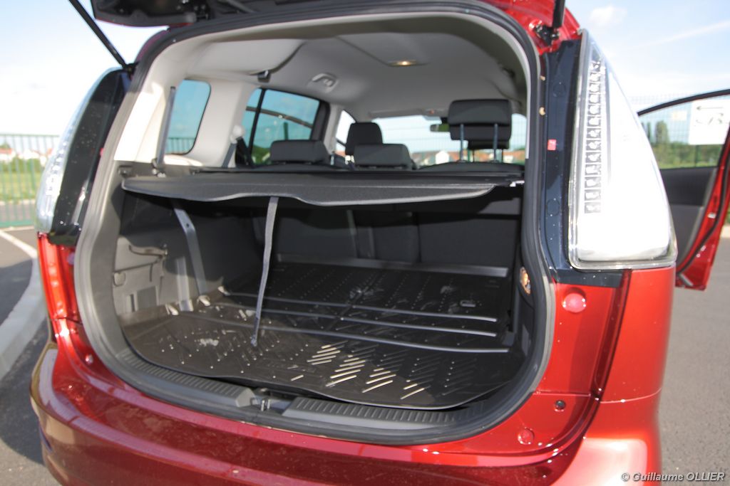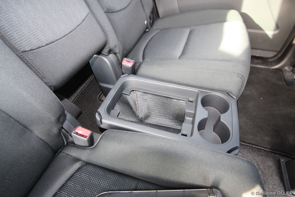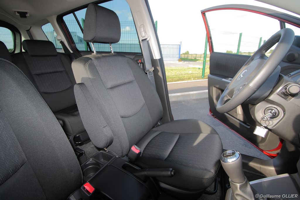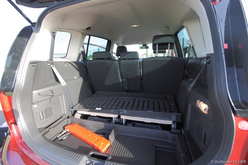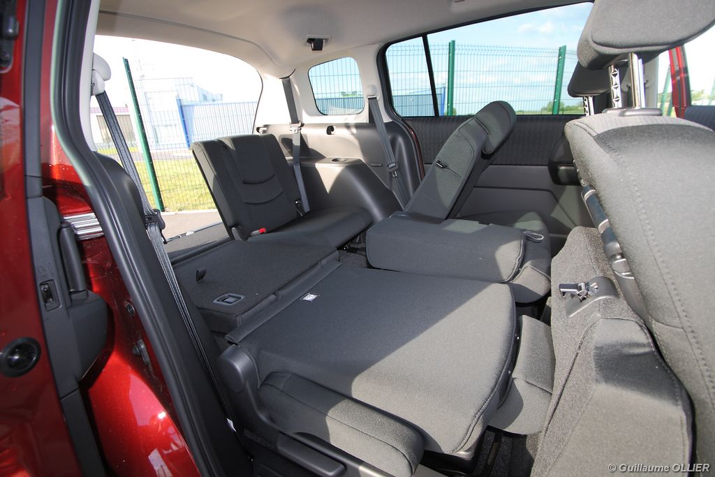 La finition est bonne, notamment pour les assemblages mais l’ensemble manque un peu de fantaisie. Les compteurs par exemple sont très basiques. La position de conduite est agréable, avec un volant cuir réglable en hauteur et en profondeur. Le levier de vitesse tombe parfaitement sous la main. Notre modèle possède la finition « Elégance », la première sur les deux du catalogue. Elle comprend la climatisation automatique, un lecteur de CD/MP3 avec prise Jack compatible iPod, et le régulateur de vitesse. La finition du dessus baptisé « Performance » est doté en plus d’un chargeur CD, du kit mains libres Bluetooth, de deux sièges supplémentaire et des portes arrières coulissantes électriques. Il est également possible d’ajouter le pack GPS pour 3 250 € de plus. Malheureusement ce pack comprend des équipements qui auraient pu être dissocier : GPS, radars de recul, phares au xénon. A l’avant c’est confortable et il y a de l’espace. Seul le conducteur bénéficie d’un accoudoir. Les places arrière sont spacieuses, à l’exception de celle du milieu, ce qui est dommage pour un véhicule dit « monospace ». En contrepartie ce siège centrale dispose d’un aménagement nommé « karakuri », c’est-à-dire qu’il est escamotable. L’assise peut se ranger dans le siège d’à côté, et le dossier sert alors d’accoudoir ou de porte gobelets. Les dossiers peuvent également se régler, tout comme l’axe de profondeur des sièges. Deux personnes peuvent s’installer dans le coffre grâces à deux sièges escamotables au 3ème rang disponibles avec la finition Performance. Le volume de chargement possible s’étend de 112 litres à 1 566 litres en rabattant les sièges de la deuxième rangée.