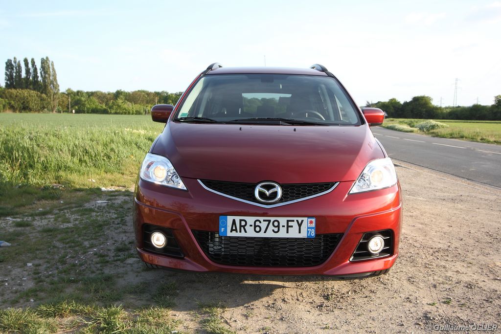 Le 2.0 litres MZR-CD de 110 ch est un moteur quatre cylindres Diesel de dernière génération. Il est associé à un filtre à particules. Très discret à l’intérieur, il n’émet pas de vibrations. La motorisation est suffisante pour déplacer le Mazda 5 qui pèse 1,6 tonnes sur la balance. Nous aurions aimé en revanche que le couple de 310 Nm soit délivré un peu plus tôt, pour éviter au MZR-CD d’être creux à bas régime jusqu’à 2 000 tr/mn. La consommation relevé lors de notre essai était située autour de 7 litres/100 km suivant les types de parcours. Le 2.0 litres est donc assez sobre. Seul bémol il émet 159 g de CO²/km, soit 200 € de malus. La tenue de route de cette Mazda est exemplaire. Le châssis est repris de la Mazda 3, et les trains roulants sont travaillés. Même s’il s’agit d’un véhicule haut sur pattes, il est agréable de rouler avec, même en conduite dynamique. Aucun reproche n’est pas faire à la direction qui s’avère précise, et le freinage endurant.