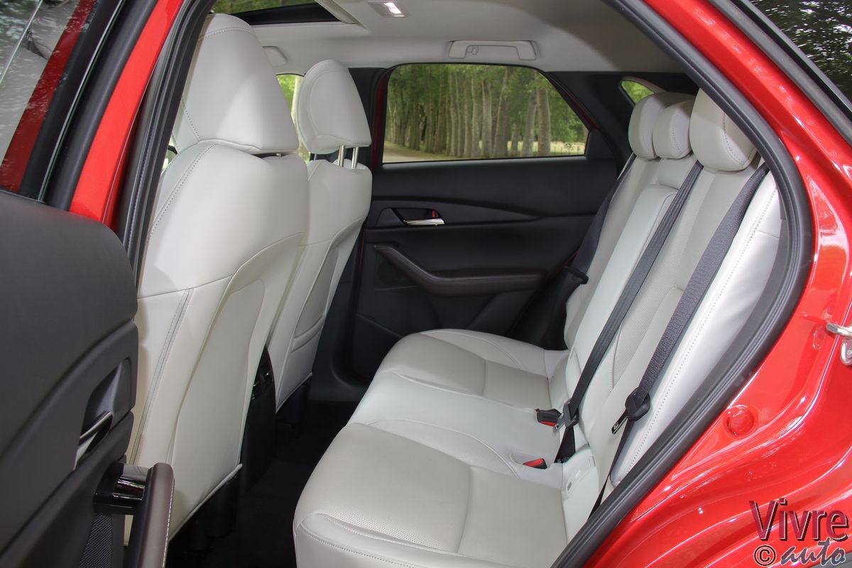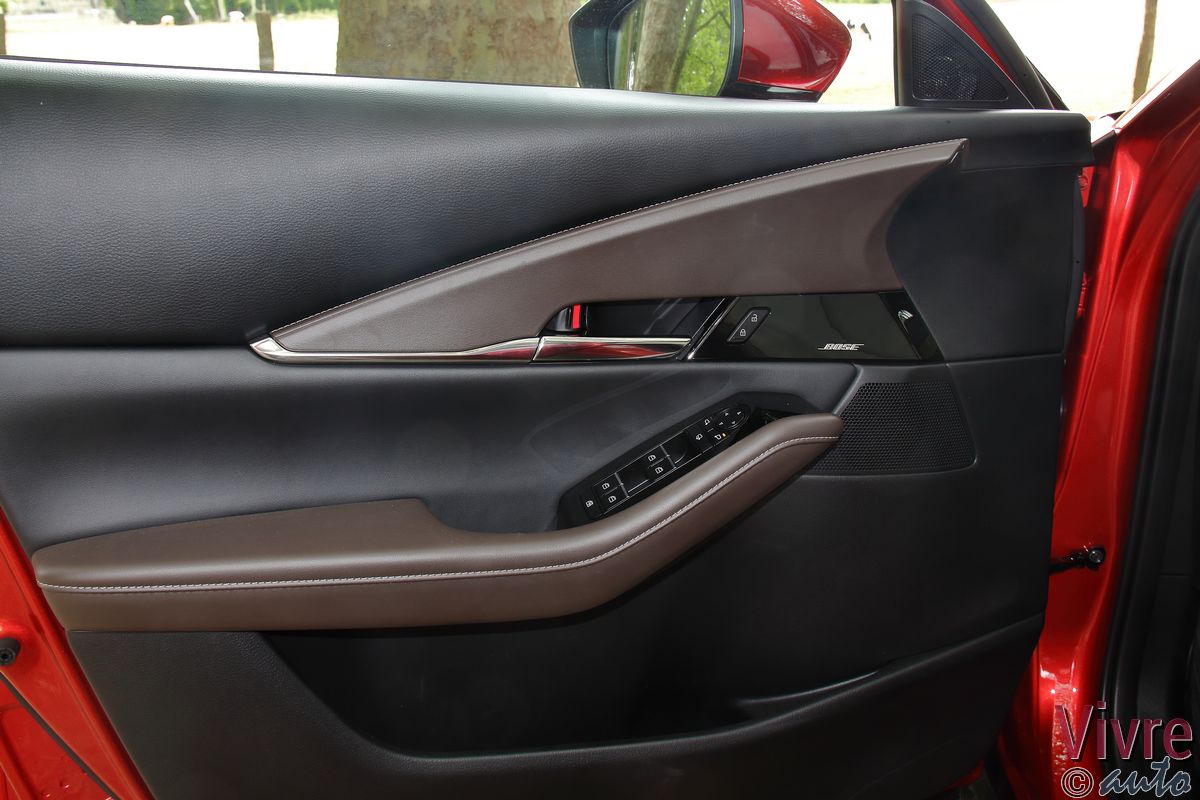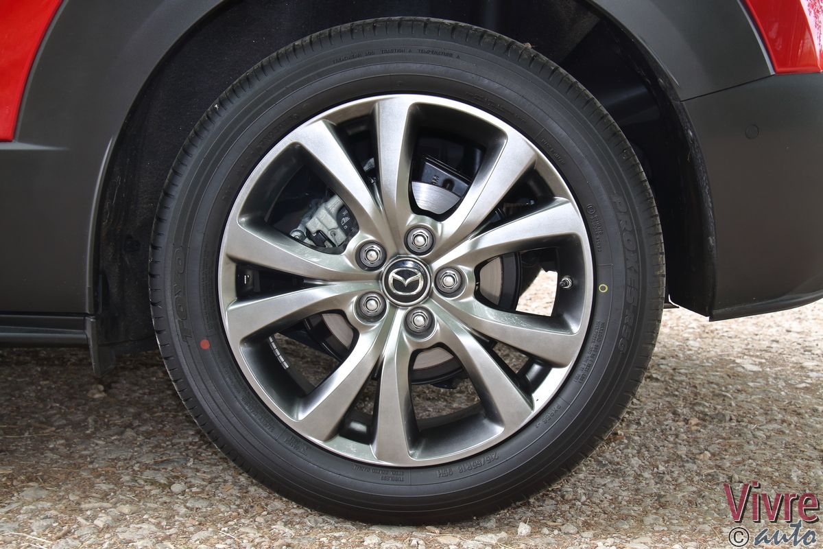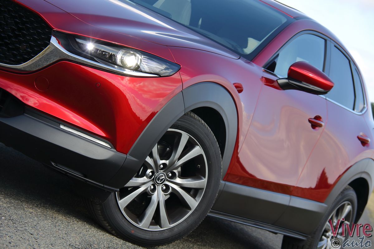 La silhouette est basse, presque celle d’une berline surélevée, ce qui lui donne un dynamisme rare dans la catégorie. Le seul bémol esthétique viendra peut-être de ces généreuses protections d’ailes en plastique brut qui, si elles renforcent le côté baroudeur, cassent un peu la finesse de la peinture Soul Red Crystal. Mais ne boudons pas notre plaisir : le CX-30 est sans doute l’un des plus beaux SUV du moment, capable de faire tourner les têtes sans tomber dans l’agressivité gratuite.