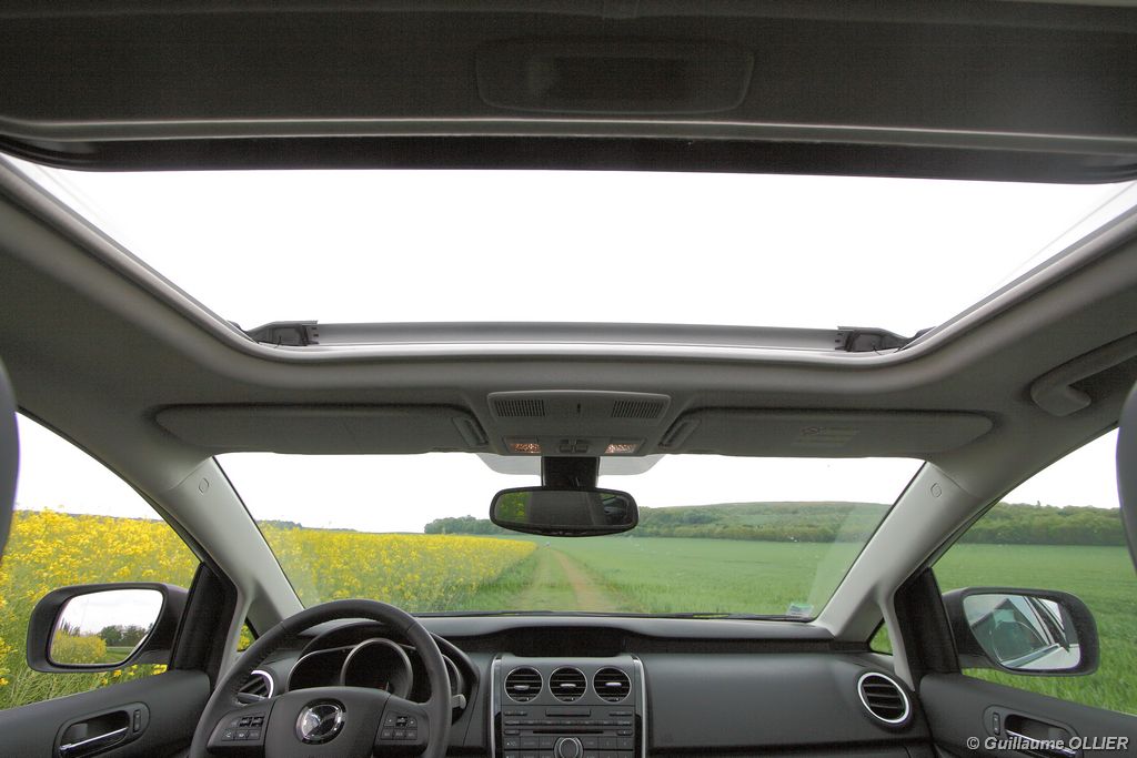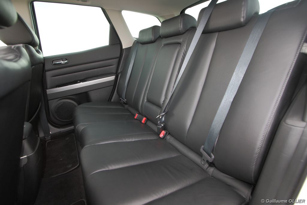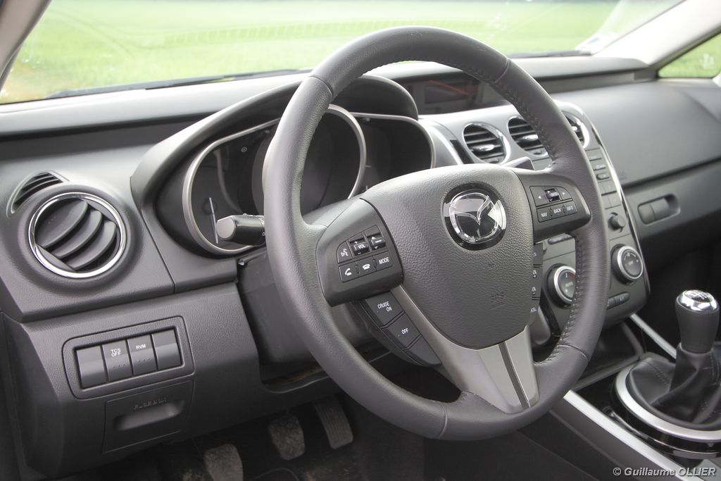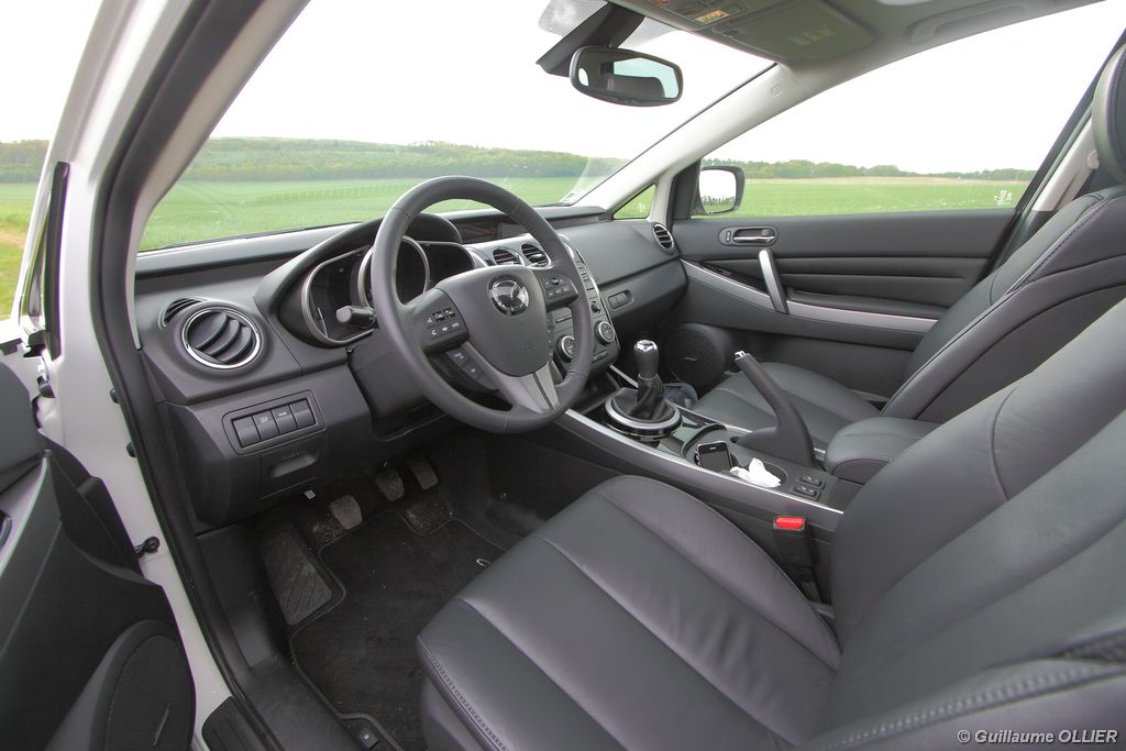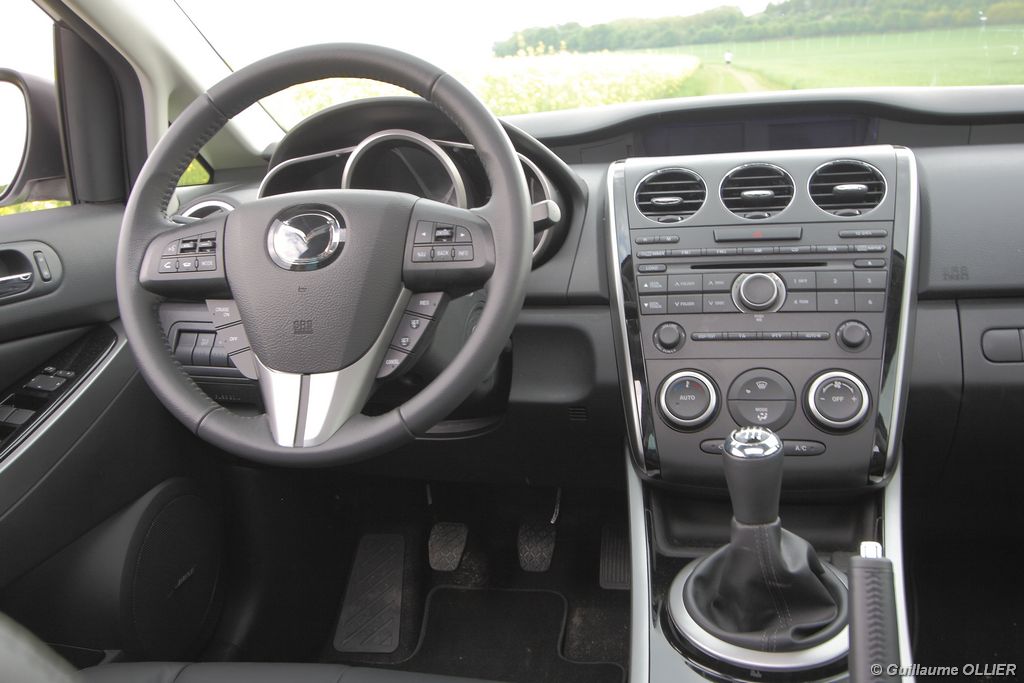 Une fois installé à bord, on remarque une ambiance sérieuse, et une bonne qualité de finition. Les garnissages à micro-perforations de la planche de bord sont de bonne facture même si les plastiques ne sont pas moussés. L’ensemble inspire la robustesse. La console centrale se pare d’un entourage en finition noir laqué et les ouïes de ventilations sont entourés de chrome. Le volant, repris des dernières Mazda 3 et 6 possède une jante fine, ce qui n’est pas gênant. Il est doté des commandes de régulateurs, de navigation, et de kit main libre. Les compteurs de vitesse sont simples, mais bien présentés avec un éclairage circulaire de couleur bleue. L’ergonomie est plutôt bien étudié, le CX-7 dispose d’un ordinateur de bord et d’un écran LCD haute résolution qui regroupe le GPS intégré et la caméra de recul. On déplore en revanche la taille de celuAu chapitre habitabilité, le SUV de Mazda est plutôt confortable et il invite aux longues distances. A l’avant la position de conduite est bonne et les grands gabarits s’y plairont. Les sièges électriques ont une fonction mémoire à trois positions. Seulement disponible en cinq places, le CX-7 ne peut accueillir deux personnes supplémentaire en dépannage, comme c’est le cas pour d’autres marques. Avec un volume de 455 litres, le coffre est dans la moyenne, et peut s’étendre jusqu’à 1 348 litres en rabattant la banquette arrière à l’aide de deux leviers. Le seuil de chargement peut paraître haut pour certains utilisateurs.Les espaces de rangements sont nombreux, sous l’accordoir 4,8 litres de volume est disponible.