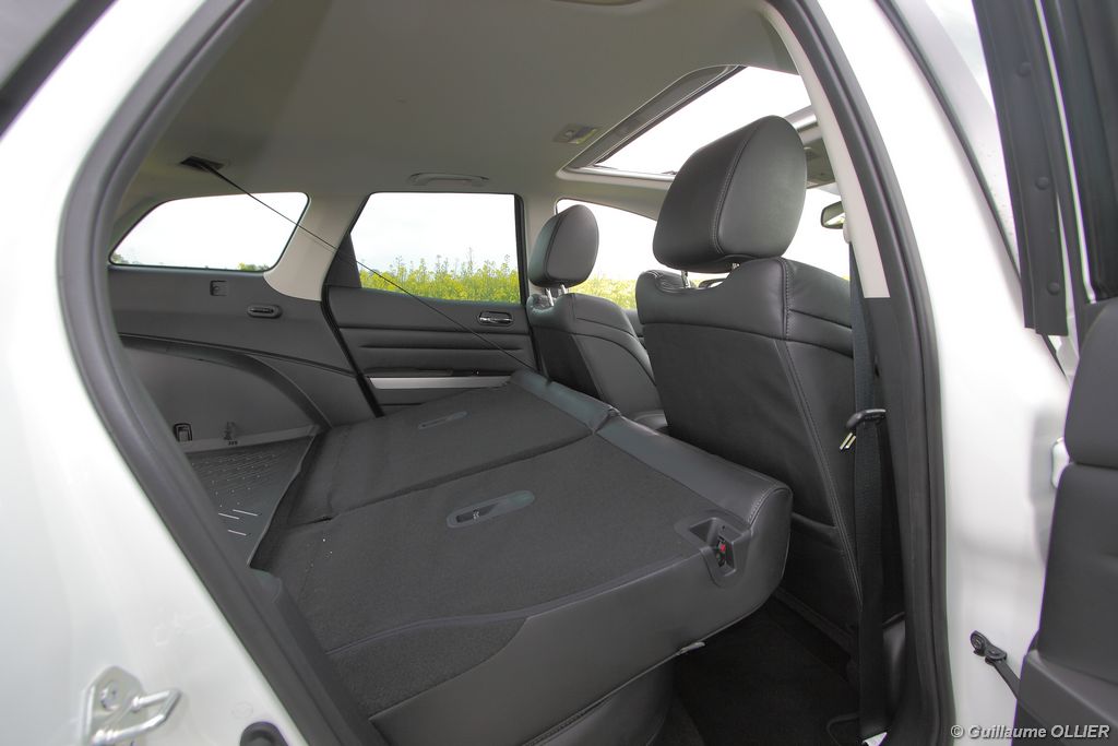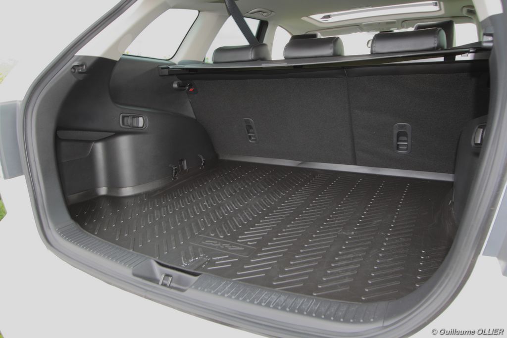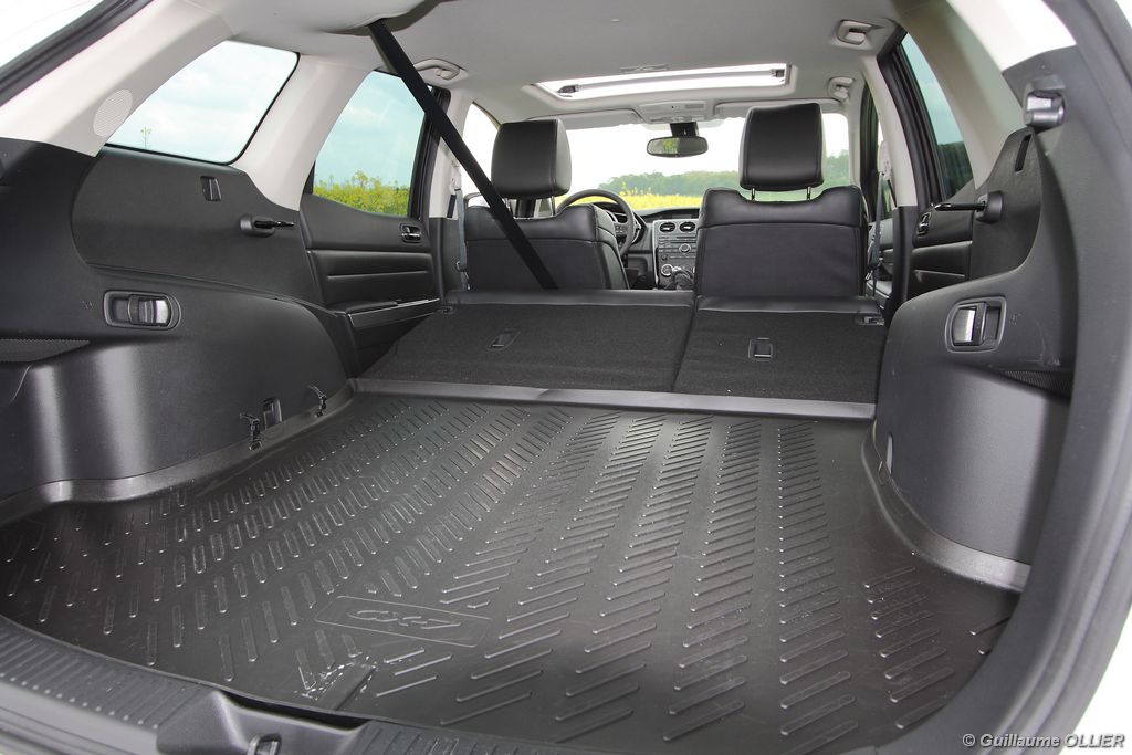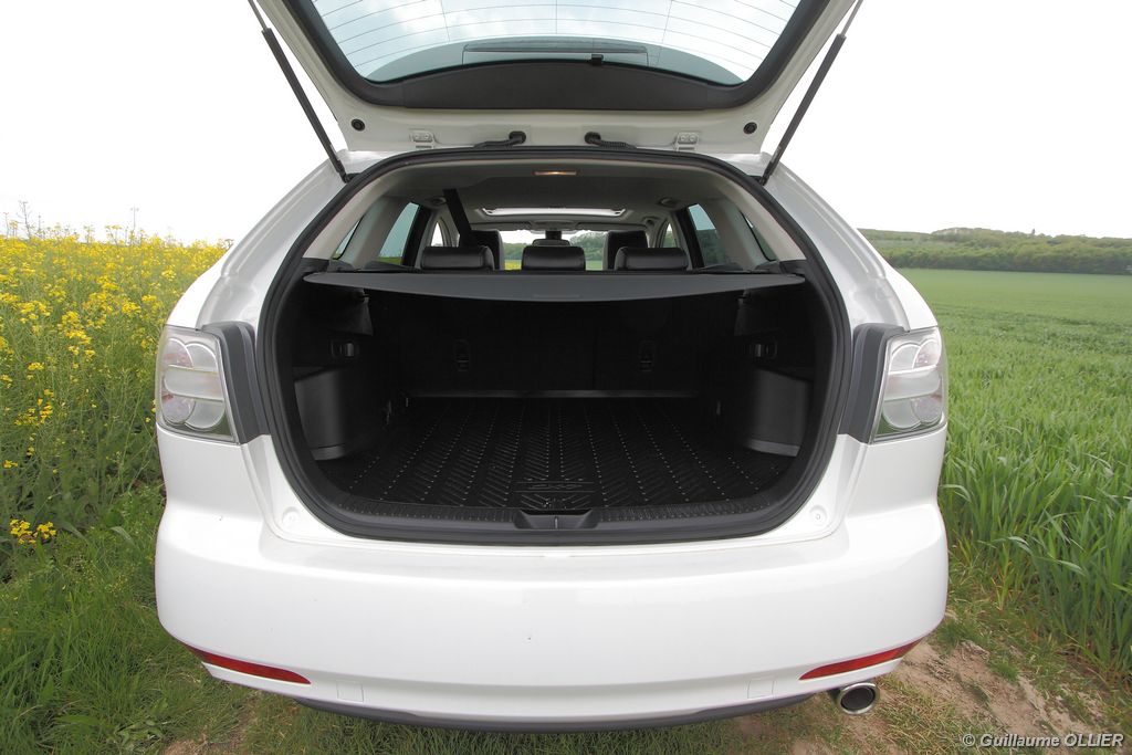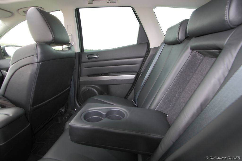 Une fois installé à bord, on remarque une ambiance sérieuse, et une bonne qualité de finition. Les garnissages à micro-perforations de la planche de bord sont de bonne facture même si les plastiques ne sont pas moussés. L’ensemble inspire la robustesse. La console centrale se pare d’un entourage en finition noir laqué et les ouïes de ventilations sont entourés de chrome. Le volant, repris des dernières Mazda 3 et 6 possède une jante fine, ce qui n’est pas gênant. Il est doté des commandes de régulateurs, de navigation, et de kit main libre. Les compteurs de vitesse sont simples, mais bien présentés avec un éclairage circulaire de couleur bleue. L’ergonomie est plutôt bien étudié, le CX-7 dispose d’un ordinateur de bord et d’un écran LCD haute résolution qui regroupe le GPS intégré et la caméra de recul. On déplore en revanche la taille de celuAu chapitre habitabilité, le SUV de Mazda est plutôt confortable et il invite aux longues distances. A l’avant la position de conduite est bonne et les grands gabarits s’y plairont. Les sièges électriques ont une fonction mémoire à trois positions. Seulement disponible en cinq places, le CX-7 ne peut accueillir deux personnes supplémentaire en dépannage, comme c’est le cas pour d’autres marques. Avec un volume de 455 litres, le coffre est dans la moyenne, et peut s’étendre jusqu’à 1 348 litres en rabattant la banquette arrière à l’aide de deux leviers. Le seuil de chargement peut paraître haut pour certains utilisateurs.Les espaces de rangements sont nombreux, sous l’accordoir 4,8 litres de volume est disponible.