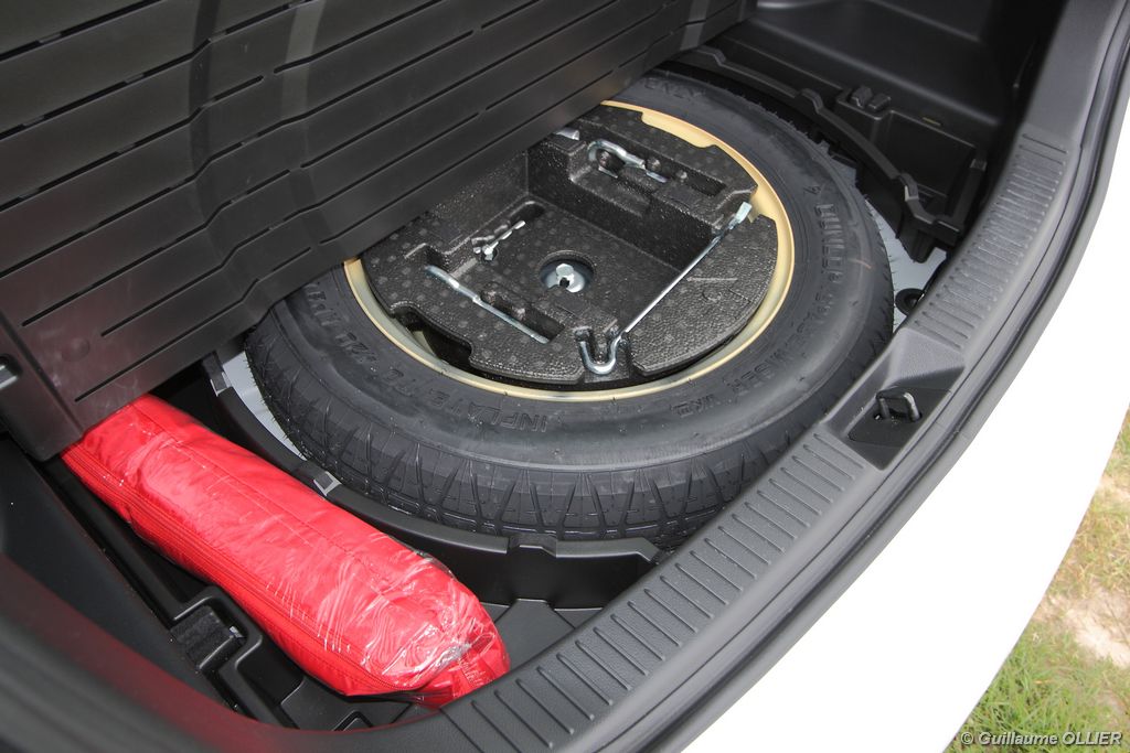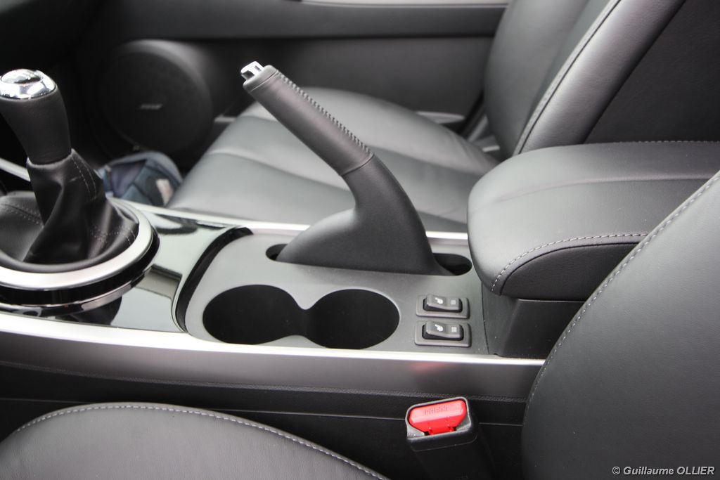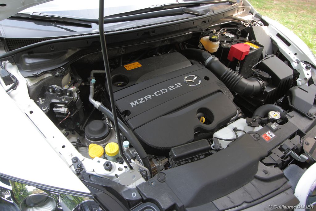 Mazda souligne ici encore son point fort, la richesse des équipements de série. La gamme est d’autant simplifiée puisqu’il n’existe qu’une finition, baptisée Performance. Nous retrouvons donc au programme : une climatisation bizone automatique, une sellerie cuir, des sièges chauffants, un toit ouvrant électrique, un GPS, un kit main libre Bluetooth, le système audio BOSE MP3 avec 9 hauts parleurs, la caméra de recul et les phares avant Xénons. Et bien sûr les éléments de sécurité ABS, répartiteur électronique de freinage (EBD), assistance au freinage d’urgence (EBA), contrôle dynamique de stabilité (DSC), anti patinage électronique (TCS), système de surveillance de la pression des pneus (TPMS) et le fameux RVM autrement dit le système d’alerte véhicule en approche qui s’avère efficace sur route. La navigation est simple et efficace et la caméra de recul très pratique. Il est étonnant par ailleurs de ne pas avoir mis de radar de stationnement avant, surtout avec un véhicule de ce gabarit. Enfin le lecteur multimédia permet la connexion d’une prise Jack, ou encore le streaming Bluetooth. Il manque toutefois la possibilité de connecter un lecteur audio sur une prise USB. La qualité de son est au rendez-vous avec le kit BOSE.