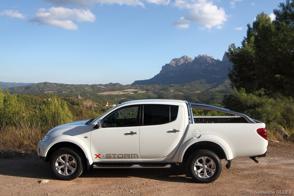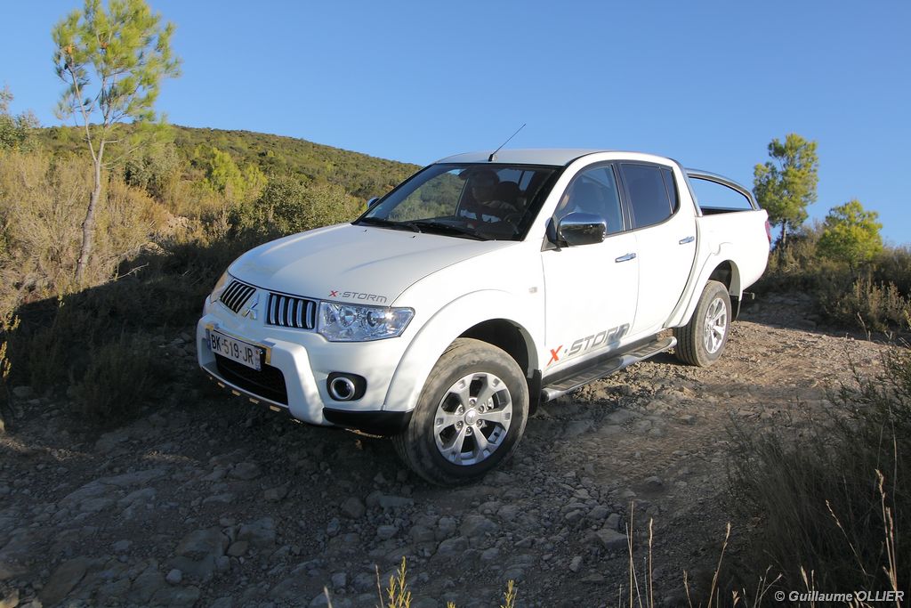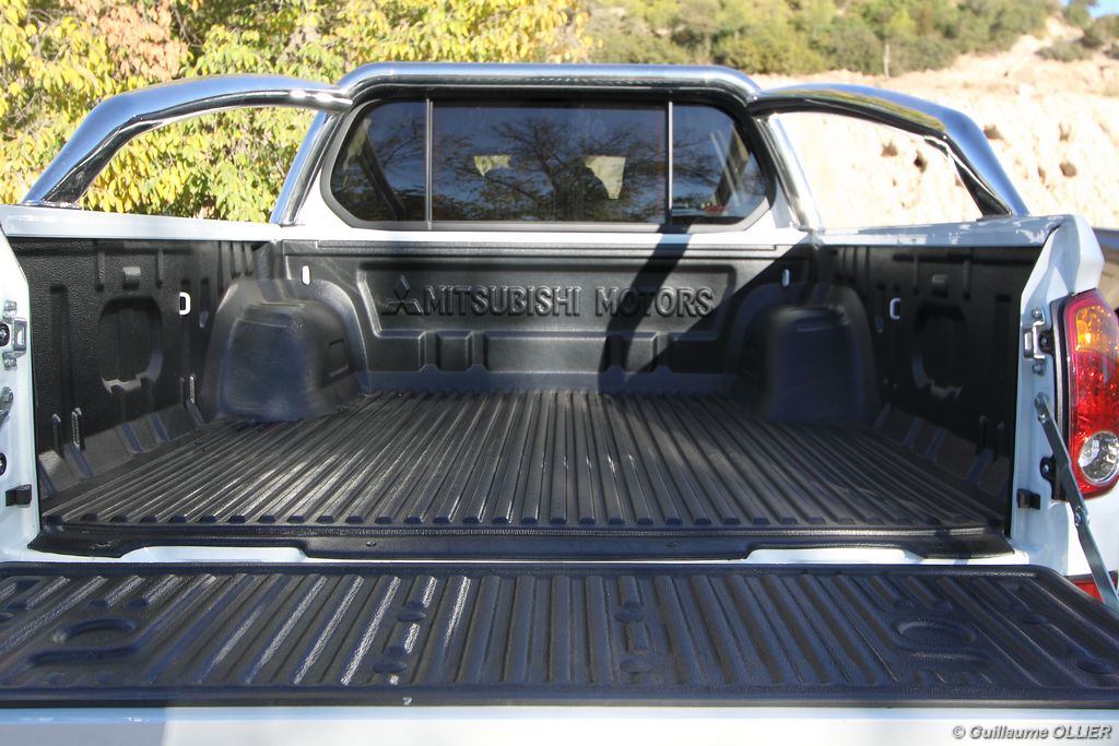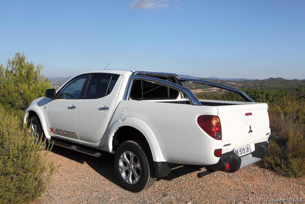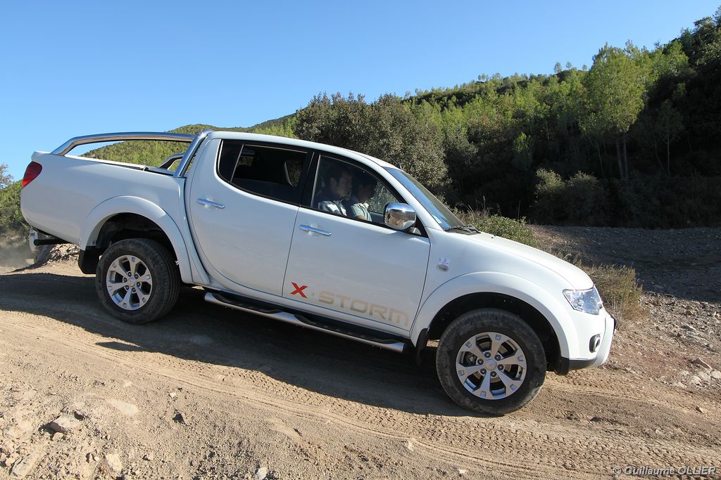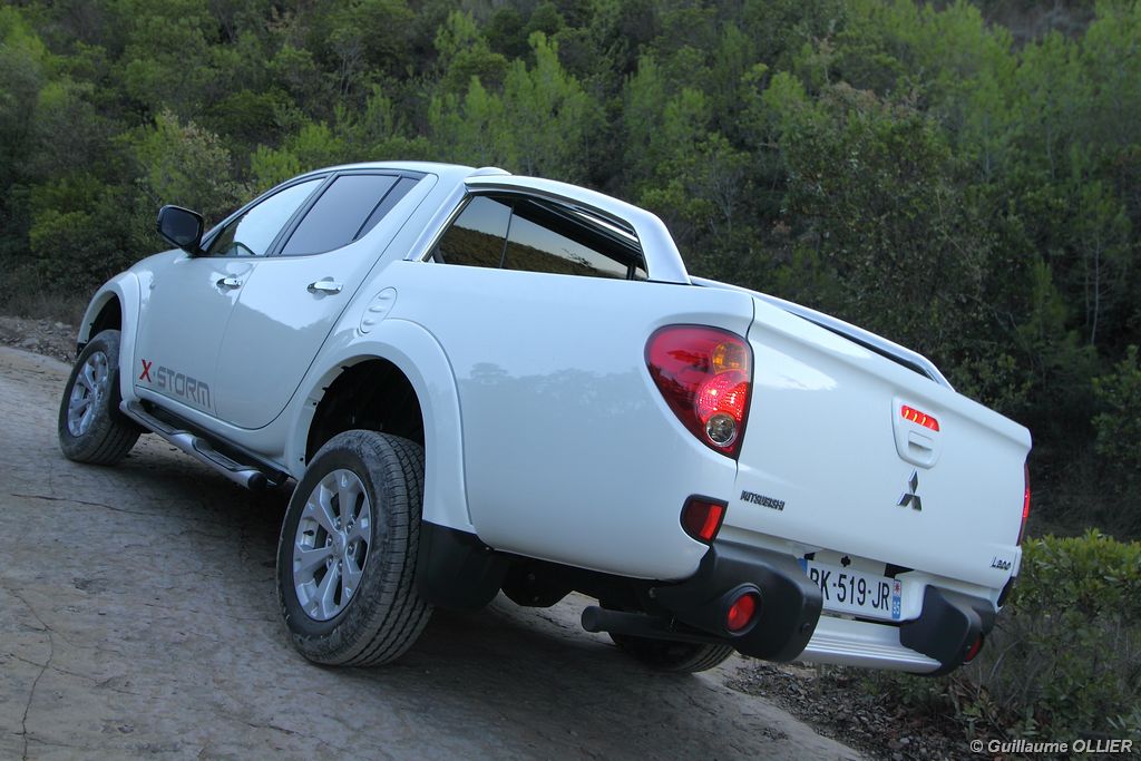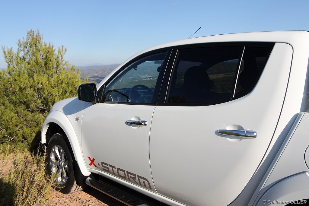 L200 XStorm est produit en Thaïlande. La finition et les assemblages sont bons, l’intérieur reste tout de même très typé « utilitaire », mais robuste. L’ergonomie est bien étudiée pour ce qui est des commandes de base, pour le reste l’écran tactile oblige le conducteur à quitter la route des yeux… Les équipements sont complets, climatisation automatique, allumage automatique des feux, détecteur de pluie, régulateur de vitesse, radio CD compatible MP3 avec prise Jack, GPS, Bluetooth, radars de recul… et même une lunette arrière rétractable électriquement pour le confort des passagers arrière ! Au chapitre habitabilité, justement, on ne pourra pas reprocher au L200 de manquer d’espace. La hauteur sous le plafond est importante, et les occupants ont de la place pour les coudes et les jambes. Côté rangement, il y a de quoi faire. Sous le siège passager, dans les portières avant et arrière avec porte-bouteille, porte-gobelets à l’avant, aumônières au dos des sièges, porte-lunette, et divers compartiments.
