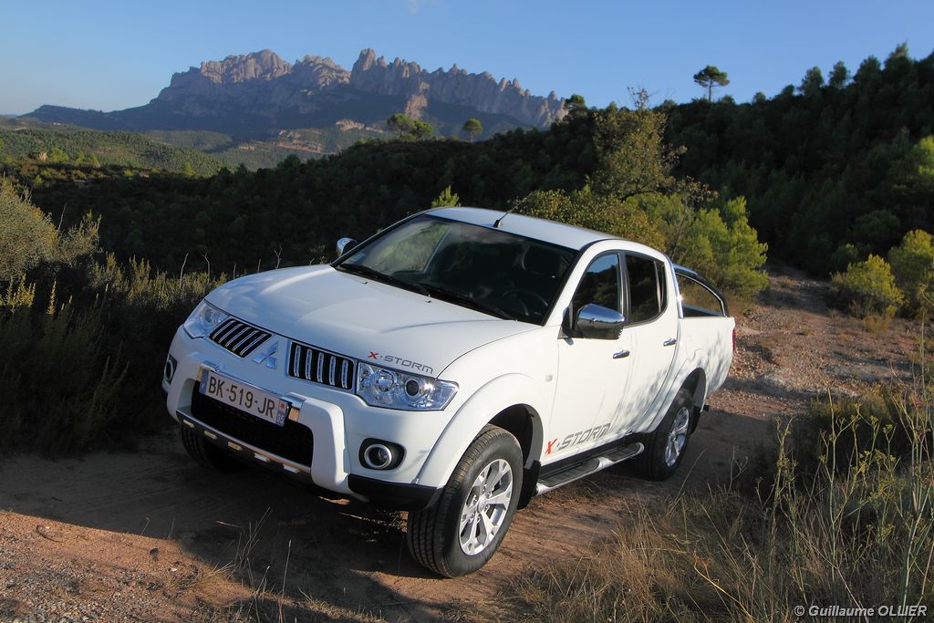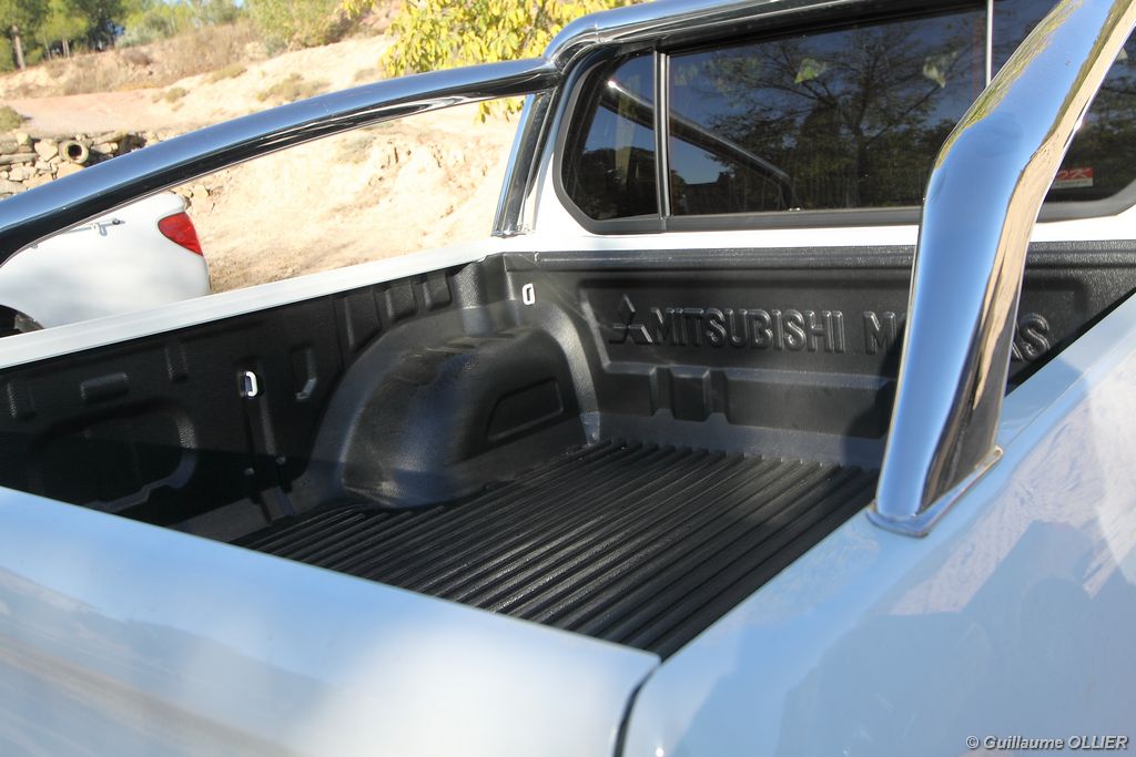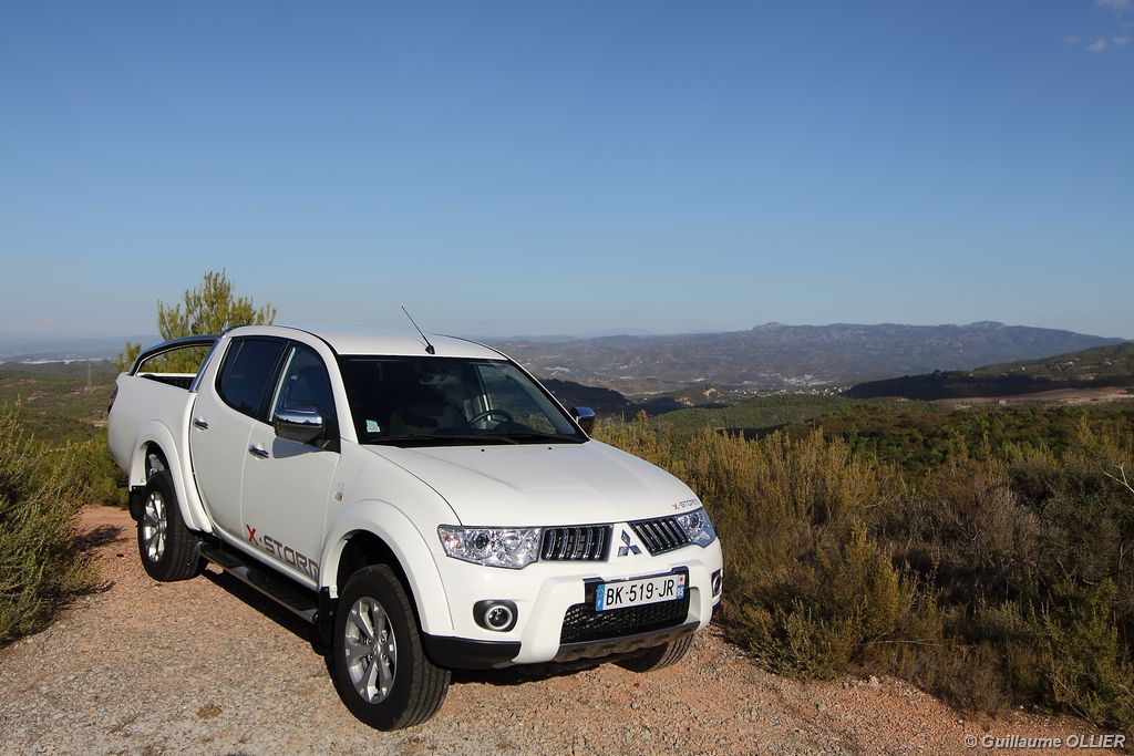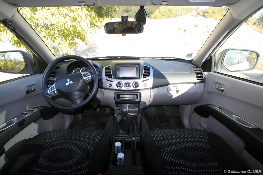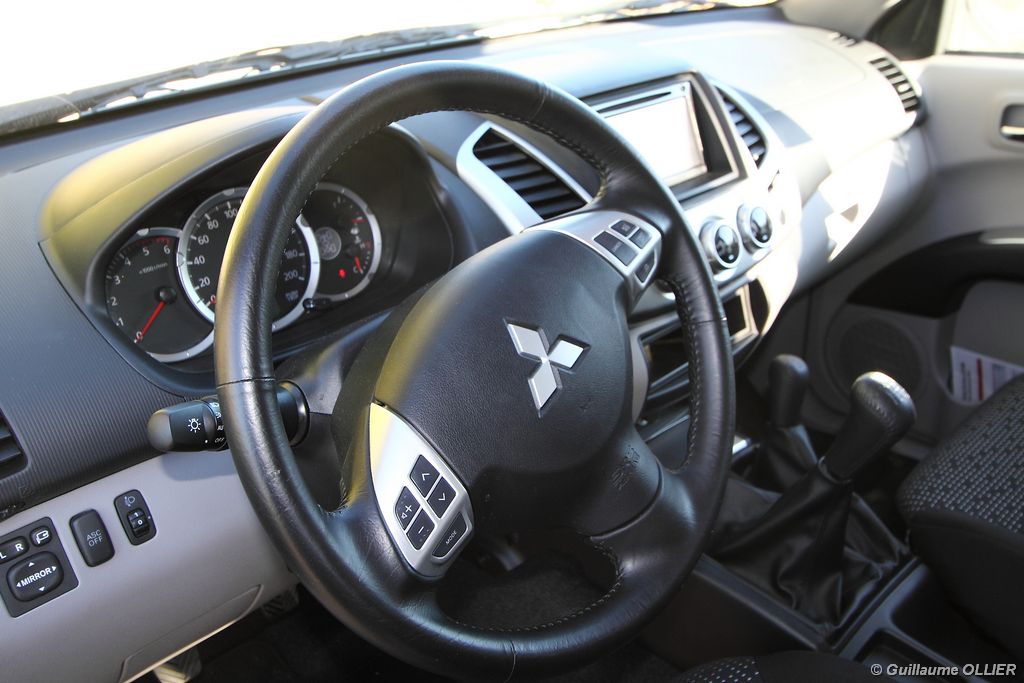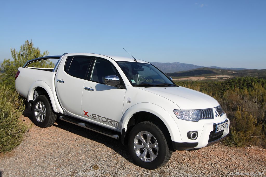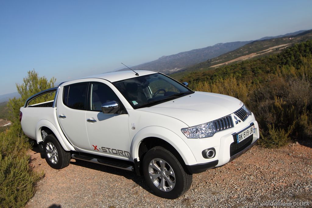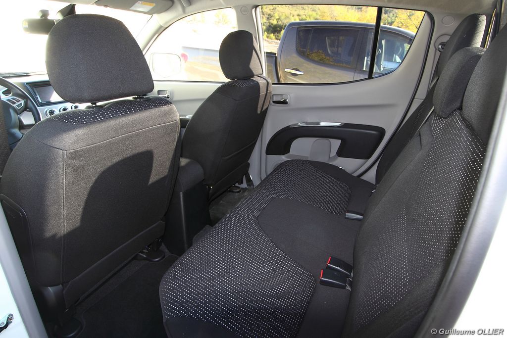L200 XStorm est produit en Thaïlande. La finition et les assemblages sont bons, l’intérieur reste tout de même très typé « utilitaire », mais robuste. L’ergonomie est bien étudiée pour ce qui est des commandes de base, pour le reste l’écran tactile oblige le conducteur à quitter la route des yeux… Les équipements sont complets, climatisation automatique, allumage automatique des feux, détecteur de pluie, régulateur de vitesse, radio CD compatible MP3 avec prise Jack, GPS, Bluetooth, radars de recul… et même une lunette arrière rétractable électriquement pour le confort des passagers arrière ! Au chapitre habitabilité, justement, on ne pourra pas reprocher au L200 de manquer d’espace. La hauteur sous le plafond est importante, et les occupants ont de la place pour les coudes et les jambes. Côté rangement, il y a de quoi faire. Sous le siège passager, dans les portières avant et arrière avec porte-bouteille, porte-gobelets à l’avant, aumônières au dos des sièges, porte-lunette, et divers compartiments.