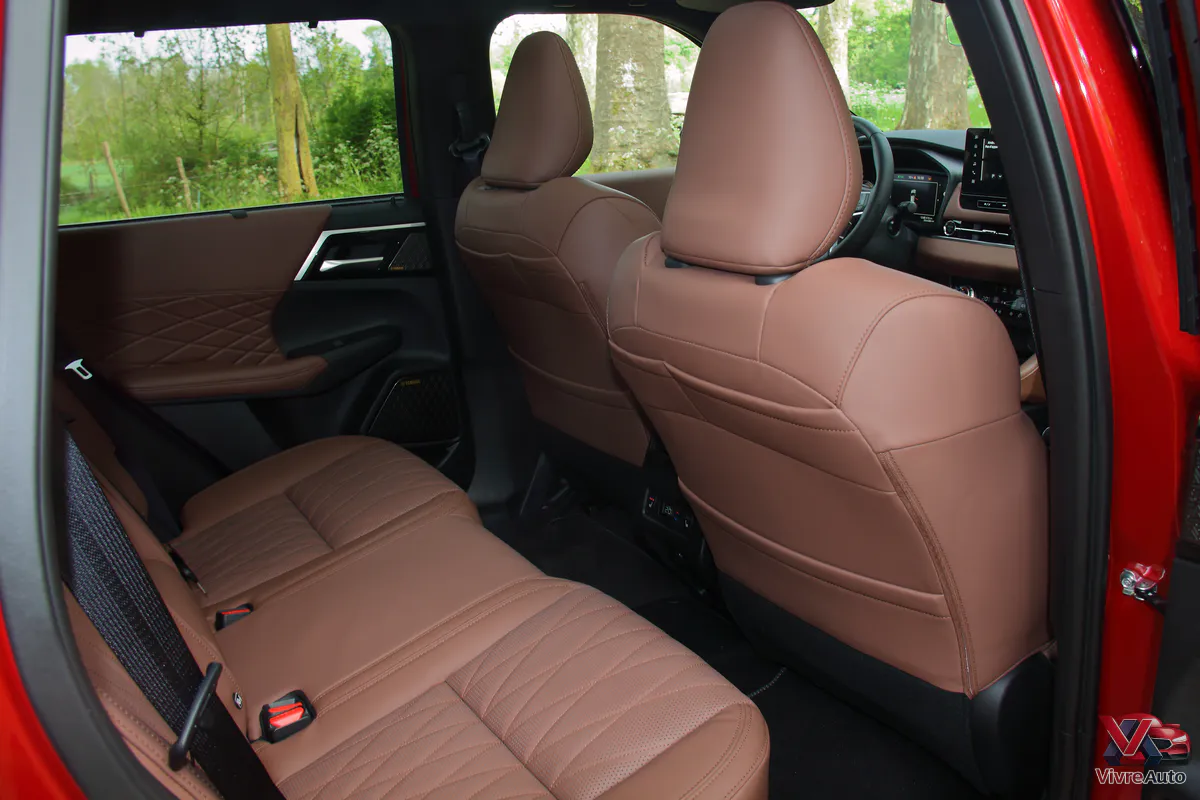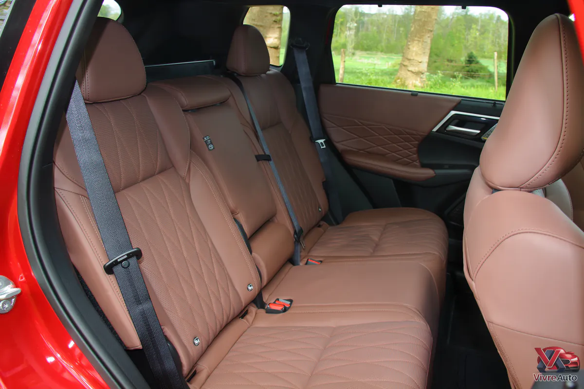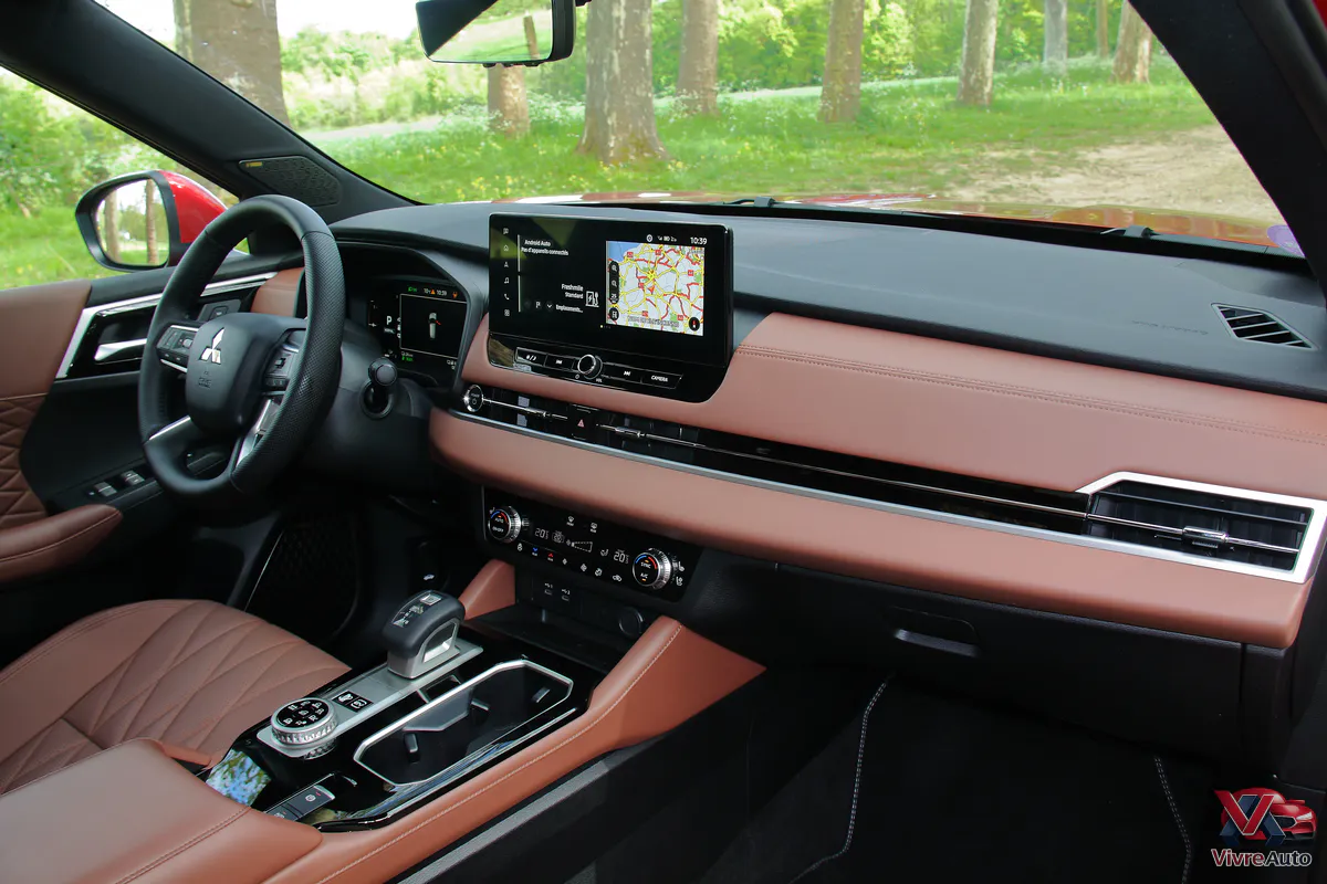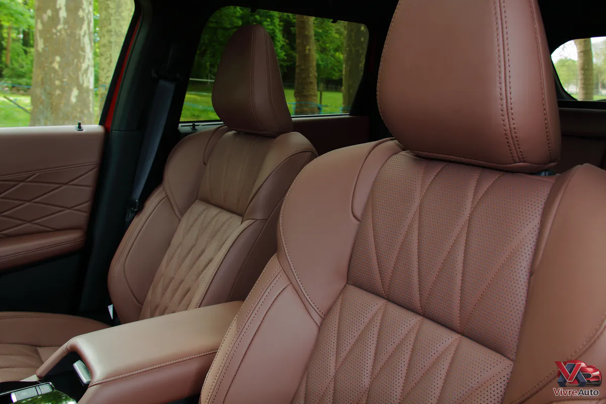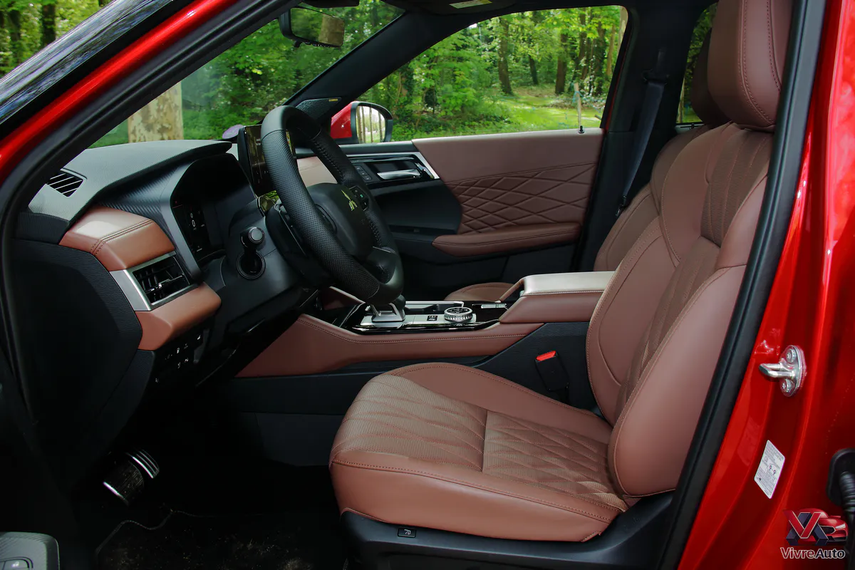 Oubliez l’austérité des anciens modèles. L’intérieur est une véritable révélation. Mitsubishi a appliqué les principes de l’Omotenashi (l’hospitalité japonaise) pour créer un habitacle aux airs de sanctuaire. Sur notre finition Instyle+, le cuir semi-aniline avec ses surpiqûres en diamant est flatteur à l’œil et au toucher (et l’odeur de cuir neuf est bien présente !).
