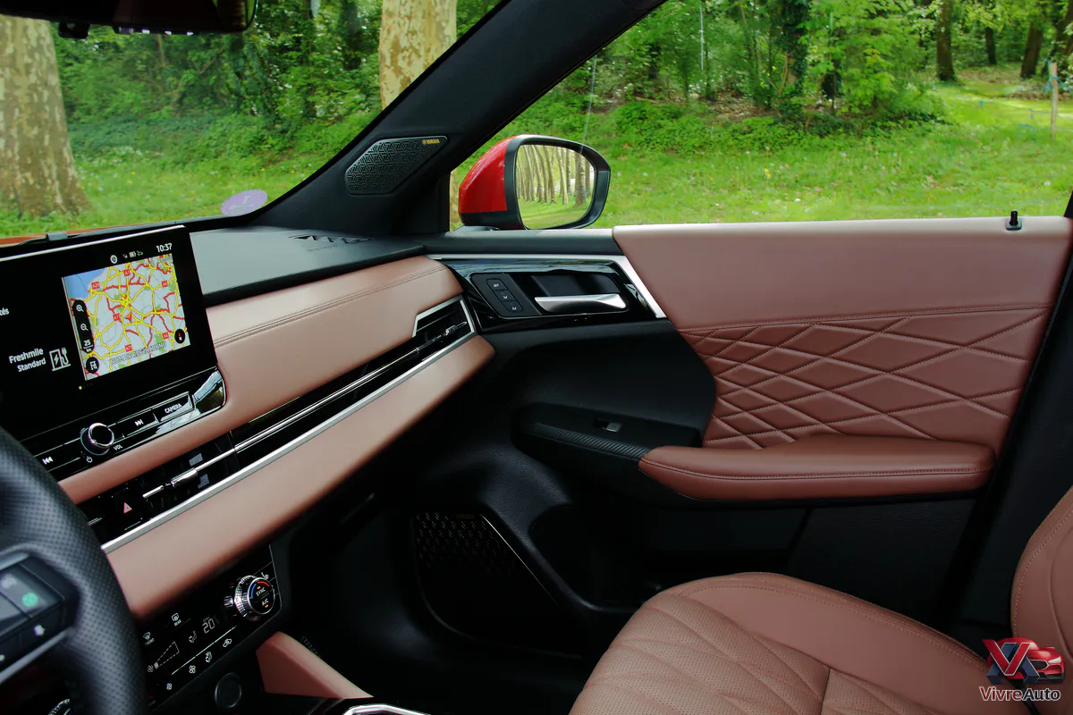 L’ergonomie est l’un des points forts. Partageant sa plateforme avec le Nissan X-Trail, l’Outlander en reprend les meilleurs éléments : un double écran de 12,3 pouces fluide et surtout, le maintien de nombreux boutons physiques. Climatisation, réglages audio, modes de conduite : tout tombe sous la main sans avoir à naviguer dans des menus complexes. On notera toutefois quelques plastiques durs en partie basse et sur le haut des contre-portes arrière, mais rien de rédhibitoire face à la qualité globale des assemblages.