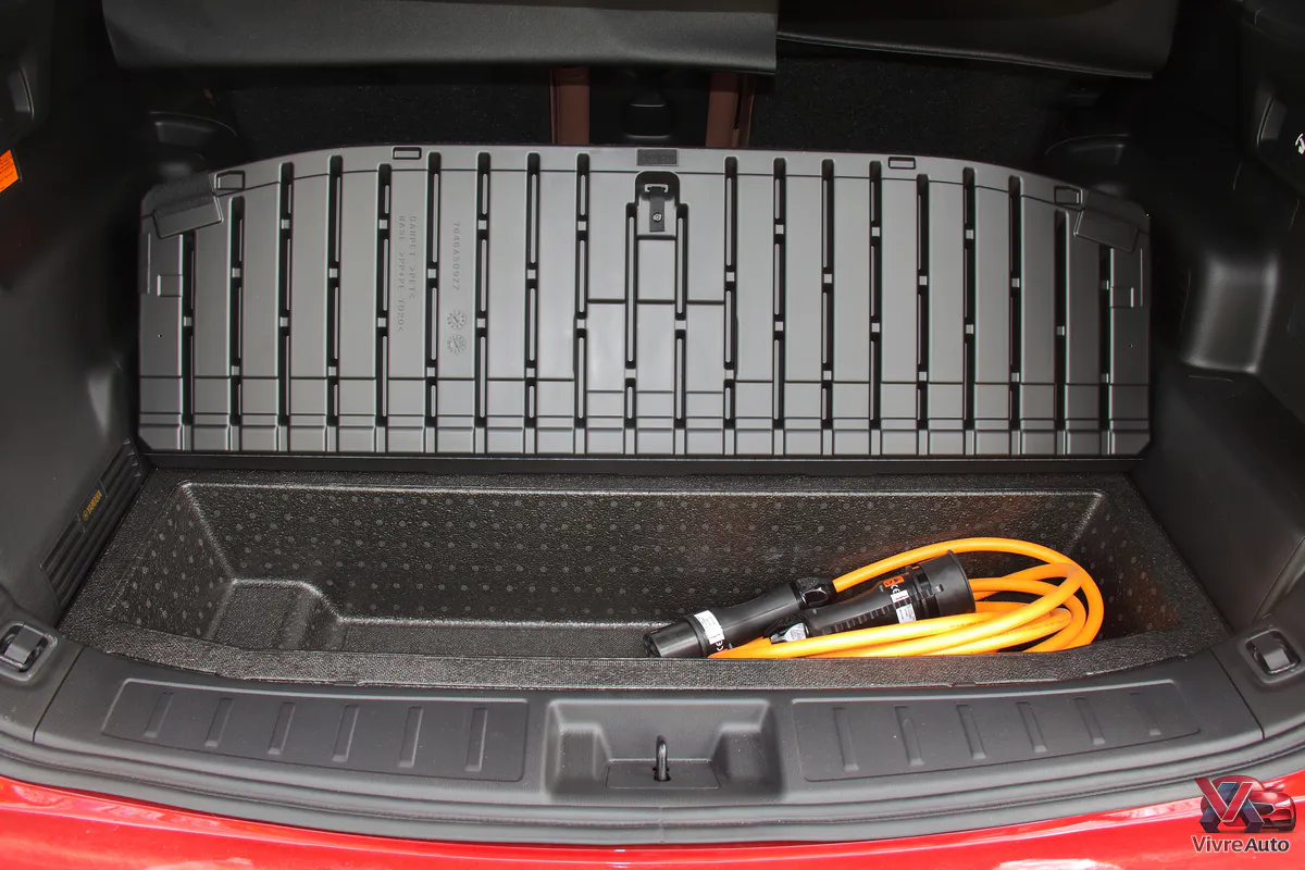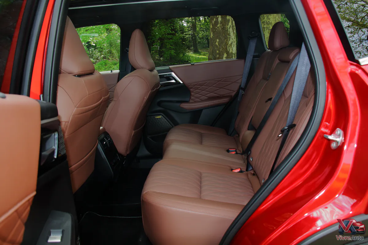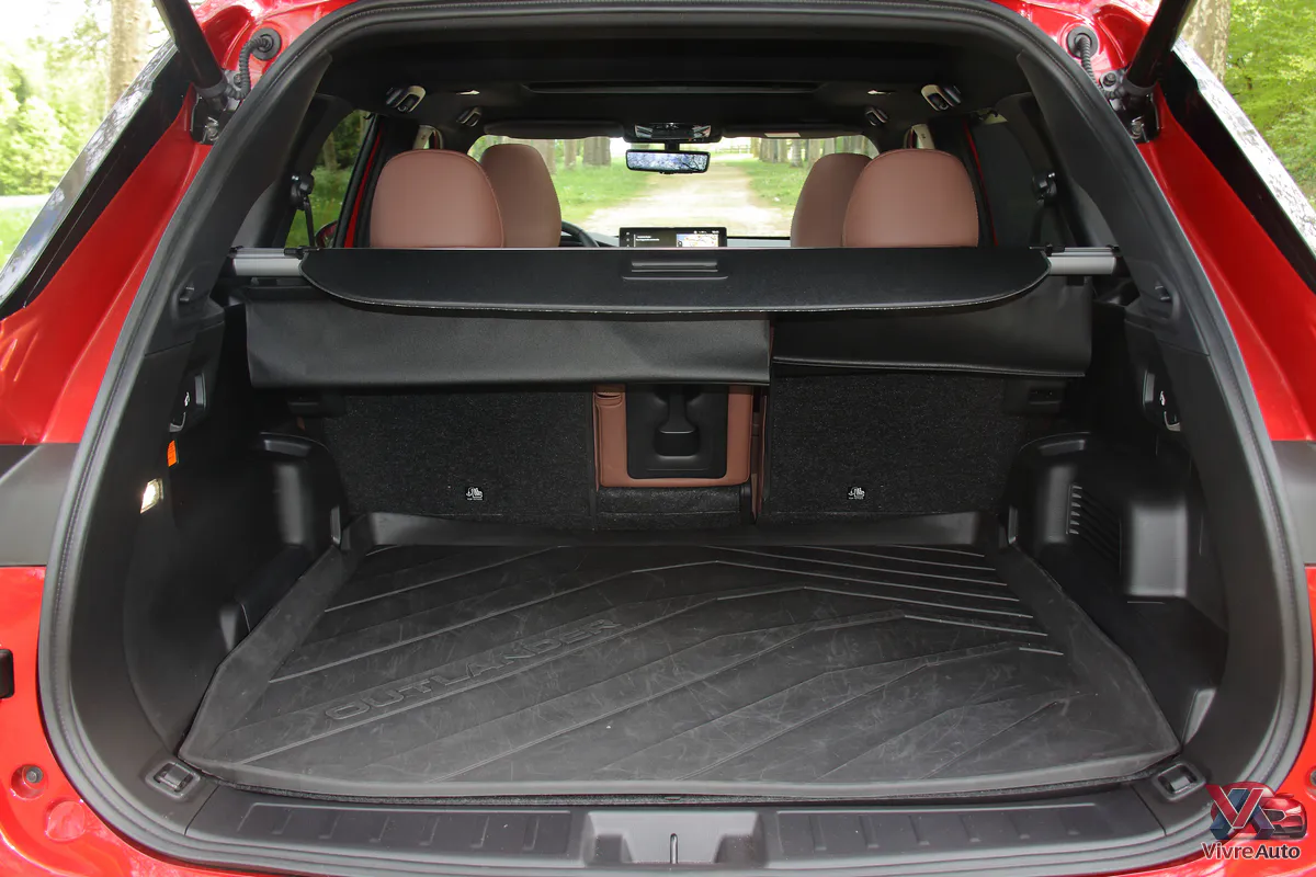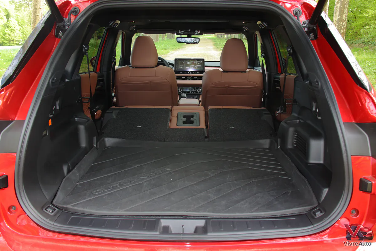 En France, l’Outlander fait l’impasse sur la version 7 places pour privilégier le confort et le volume. On profite ainsi d’un espace royal à l’arrière. Le coffre, quant à lui, affiche 498 litres (dont 26 L sous le plancher, parfaits pour ranger les câbles de recharge). C’est correct, mais un peu moins que certains concurrents comme le Honda CR-V ou le Mazda CX-60.