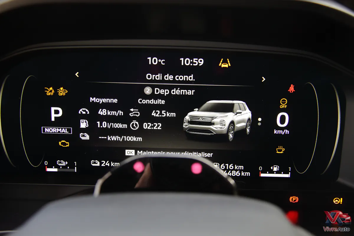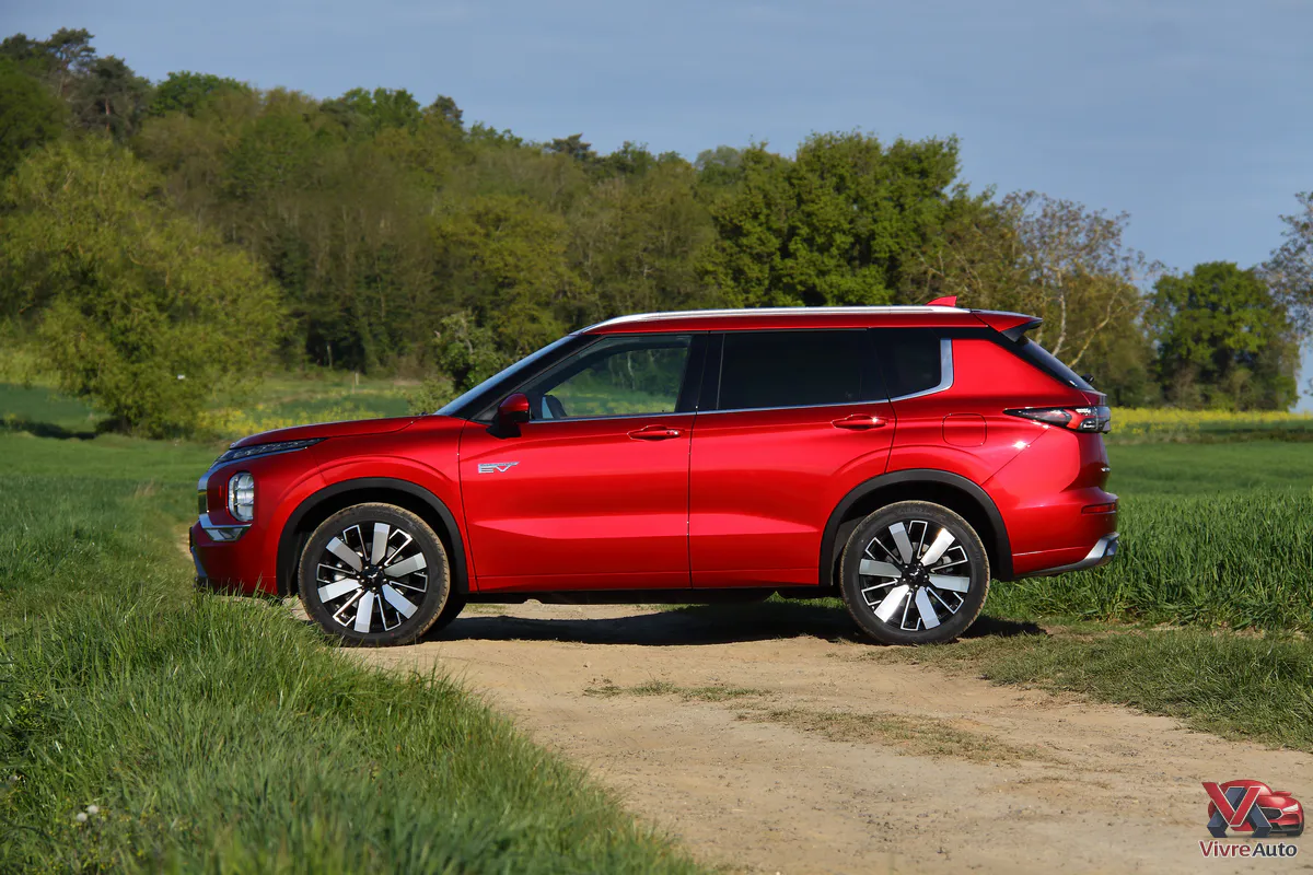Avec une batterie de 22,7 kWh (brute), l’Outlander annonce 85 km d’autonomie électrique. Dans la réalité, nous avons parcouru 70 km en usage mixte et environ 60 km sur autoroute, ce qui est excellent pour un véhicule de ce poids. Une fois la batterie vide, le moteur thermique prend le relais. Avec son réservoir de 55 litres, l’appétit se stabilise autour de 8 L/100 km en mixte, mais peut grimper à 10 L sur autoroute.