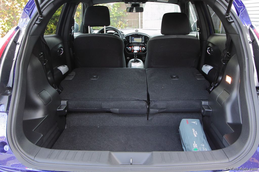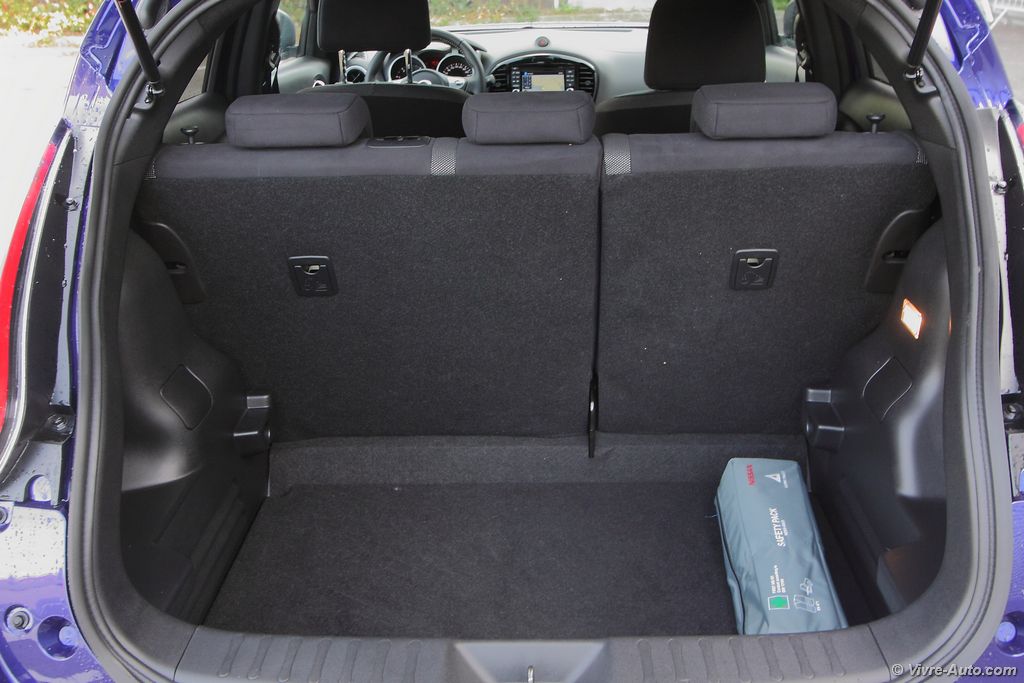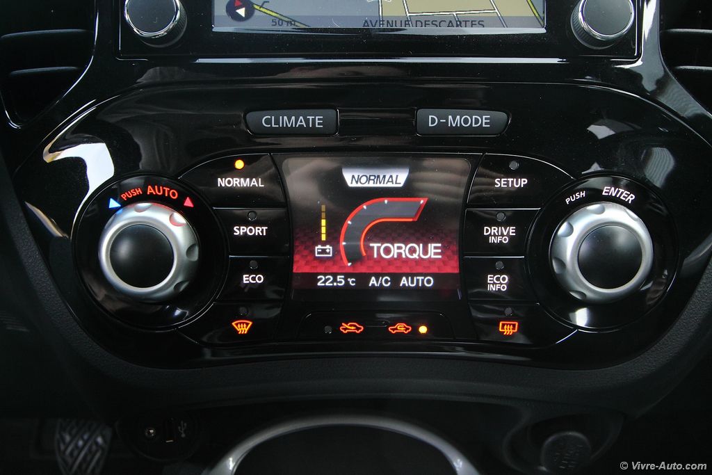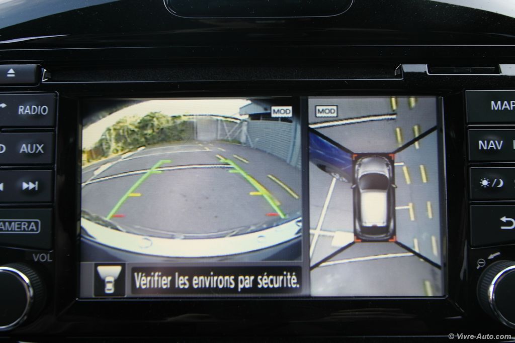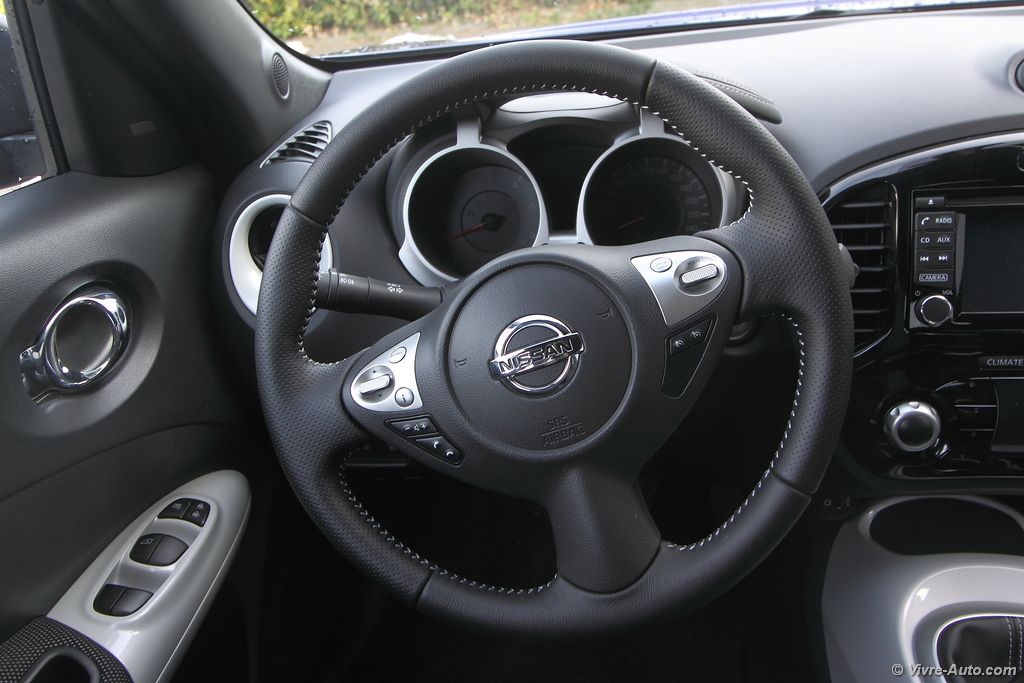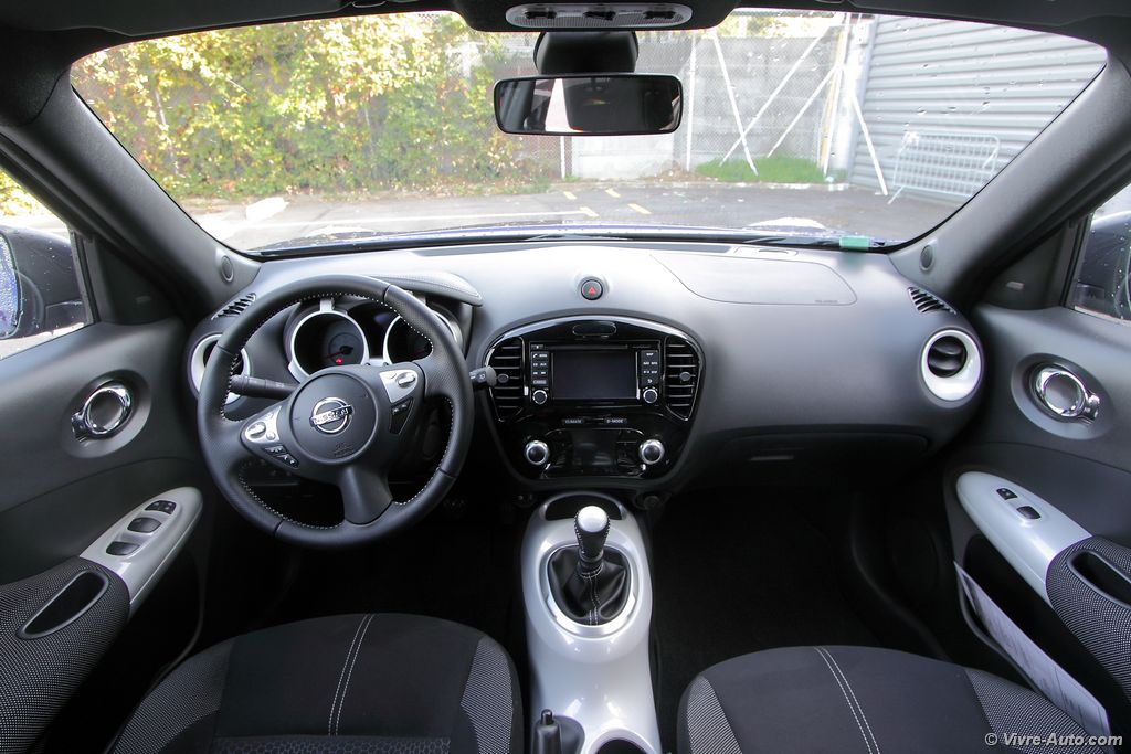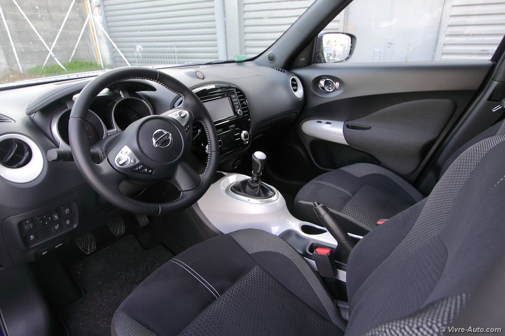 A bord, l’habitacle original est conservé avec toujours des éléments inspirés de la moto. A l’instar de la console centrale en forme de réservoir de moto ou encore la visière qui coiffe le tableau de bord. La personnalisation intervient également sur la console centrale, les surpiqûres des sièges et les contre-portes. Le Juke conserve ses défauts, des plastiques durs et surtout, un volant qui n’est toujours pas réglable en profondeur… Le catalogue enrichit son offre d’équipements. A commencer par le système multimédia Nissan Connect, plus moderne, il propose maintenant la connexion à votre smartphone et donne accès à plusieurs applications (réseaux sociaux, divertissement…), comme Google Online Search, qui vous aide à trouver votre destination selon plusieurs points d’intérêts. Pour la musique, il est possible désormais d’utiliser la fonction streaming Bluetooth. Le tout est pilotable sur l’écran tactile de 5,8 pouces, plus grand qu’avant mais petit face à la concurrence. La sécurité est accentuée avec de nouveaux systèmes, comme la détection des angles morts, ou d’objets en mouvement. Pour les manœuvres, au total quatre caméras vous facilitent la tâche avec une vision 360° (AVM-Vision 360), mention spéciale pour la vue sur la roue avant droite,