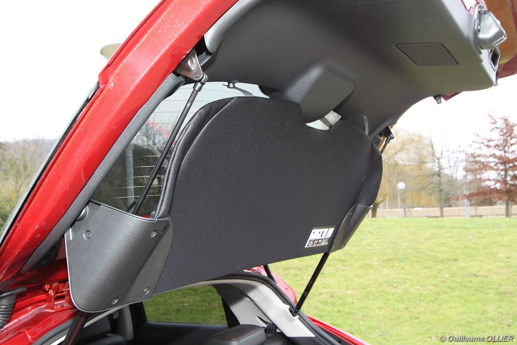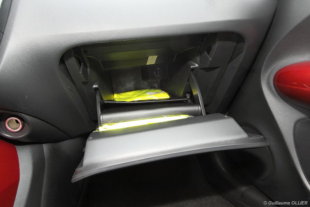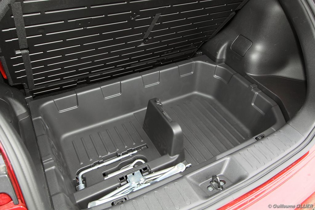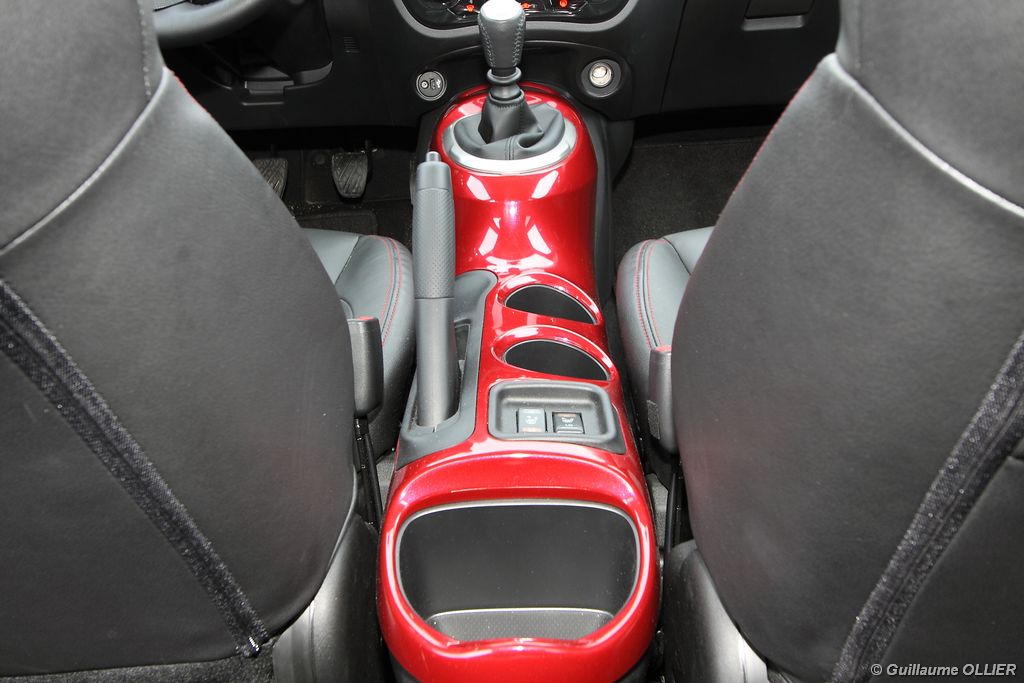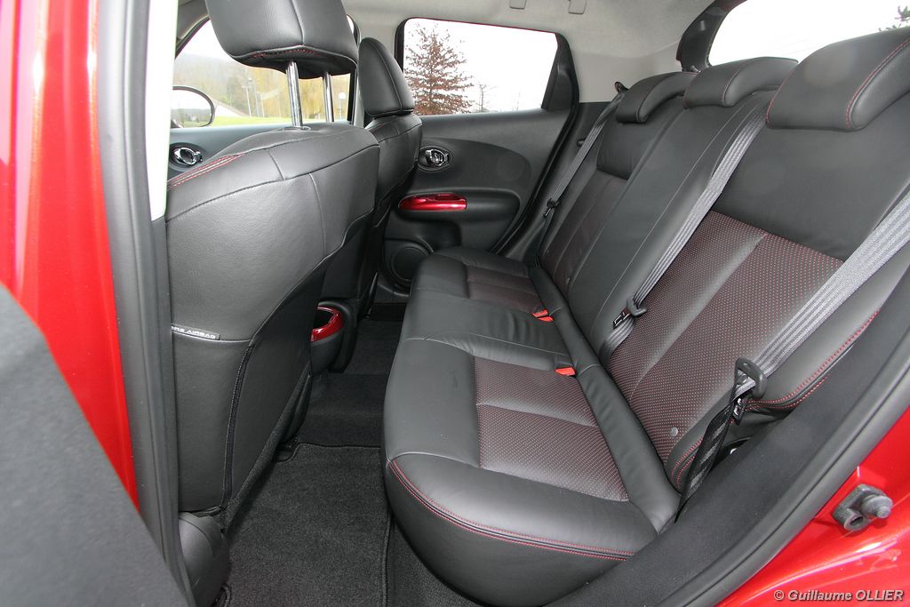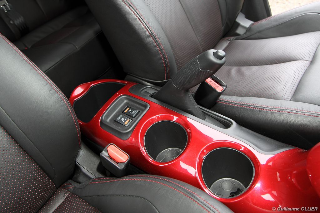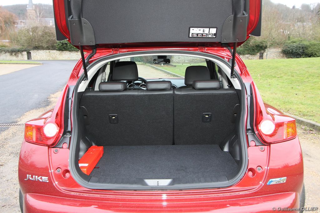 vivre-auto-nissan-juke-2011-dci-110-essai-24Comme pour l’extérieur Nissan a joué la carte de l’originalité en allant même jusqu’à intégrer des éléments de… moto ! C’est le cas pour la console centrale qui reprend la forme d’un réservoir de moto ou encore la visière qui coiffe les compteurs. Les assemblages sont bons mais les plastiques restent ordinaires. L’ensemble respire la modernité avec des éléments en aluminium brossé ou vernis. Une fois au poste de conduite, on remarque qu’on est assis haut et cela profite à la visibilité. On regrette que le volant ne soit pas réglable en profondeur. La commande boîte est bien placée et les sièges offrent un bon maintien latéral. L’ergonomie est bonne, seul reproche pour les véhicules équipés du système Intelligent Key, le bouton de démarrage est caché derrière le volant, et dans l’obscurité il n’est pas éclairé. Nous avons aimé le nouveau module de commande situé en dessous de l’écran GPS. Baptisé Nissan Dynamic Control System, il regroupe toutes les informations du véhicule, la climatisation, les différents modes de conduites… L’habitabilité du Juke est très réduite, à l’arrière l’accès aux places est difficile et deux adultes s’installeront, pas plus ! Le design a pris le dessus sur l’espace intérieur, c’est net. Le coffre n’offre que 251 litres de volume de chargement, c’est plutôt faible dans la catégorie. On retrouve tout de même des espaces de rangements pratiques, comme les deux fonds de coffre inférieurs. Le cache bagage est astucieusement accroché au hayon. On peut obtenir un plancher plat en rabattant la banquette 1/3-2/3 pour un volume atteignant 830 litres.