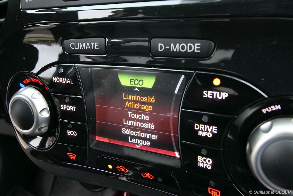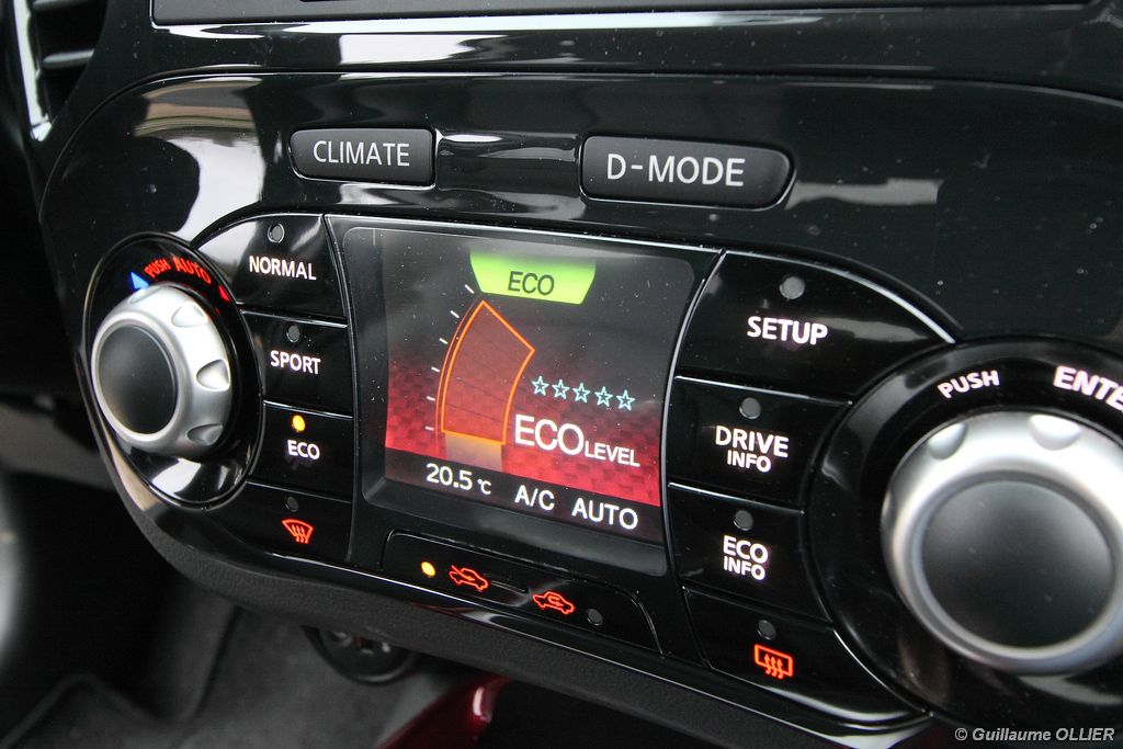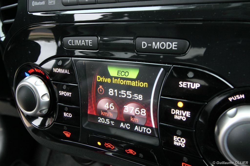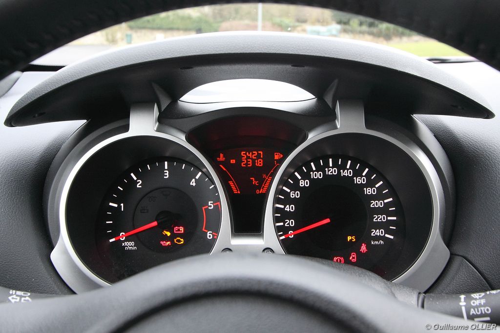 vivre-auto-nissan-juke-2011-dci-110-essai-44Malgré un Cx médiocre de 0.35, le Juke 1.5 dCi 110 brille pour sa sobriété ! Sur route nous avons réalisé une moyenne de 4,6 l/100 km, et en agglomération 5,1 l/100 km, un très bon point ! Le mode « Eco » ne nous a pas vraiment satisfaits. En effectuant le même parcours plusieurs fois, nous avons constaté une hausse de la consommation d’environ 0,5 l/100 km avec le mode en marche ! Même si le Juke équipé du dCi 110 échappe au malus, les rejets de CO² restent supérieurs à la moyenne de la catégorie. Au niveau de la gamme, trois finitions sont proposées. Les tarifs débutent à 18 540€ avec le Juke Visia, qui comprend climatisation manuelle, système audio avec prise Jack, vitres électriques. Pour 1 450€ de plus la finition Acenta propose le régulateur de vitesse, la climatisation automatique, la prise USB, et le Bluetooth. Et enfin, notre modèle Tekna dispose en plus du GPS avec caméra de recul, du démarrage sans clé, de la sellerie cuir et sièges chauffants à l’avant, et des phares et essuie-glace automatique pour 22 290€. Autant dire que ces tarifs sont clairement au dessus de la concurrence, et proche au final d’un Qashqai. Notons que l’ESP est offert de série sur toute la gamme. Enfin, le Juke est disponible aussi en quatre roues motrices, mais malheureusement réservé au moteur turbo 190 ch…