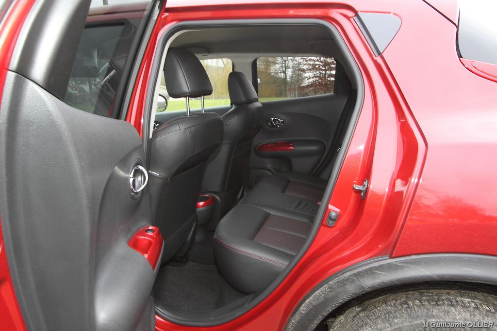 vivre-auto-nissan-juke-2011-dci-110-essai-32Le Nissan Juke doit son design au concept Qazana présenté au salon de Genève 2009. Les designers se sont inspirés des voitures de rallye et des motos pour dessiner cette citadine. Le profil rappelle le style des coupés avec le vitrage latéral étroit et les poignées de portes arrière invisibles. Avec une garde au sol surélevée et sa ceinture de caisse haute l’esprit SUV se dégage également. A l’avant les projecteurs qui accueillent les feux de position et les clignotants sont très fins et disposés sur la moitié supérieure du capot. Les feux de route et de croisements sont montés à hauteur de la calandre et épousent une forme circulaire. Les feux arrière en boomerang rappellent un peu ceux de la 370Z. Neuf teintes sont proposées, dont trois nuances propres au Juke : Force Red, Haptic Bleue et Machine Brown. Cette citadine mesure 4,14 mètres, soit 11 cm de plus qu’une Renault Clio, mais qu’en est-il de l’espace intérieur ?