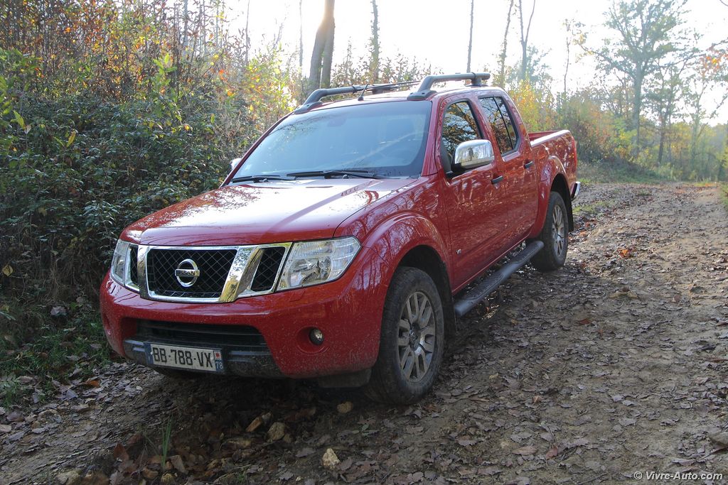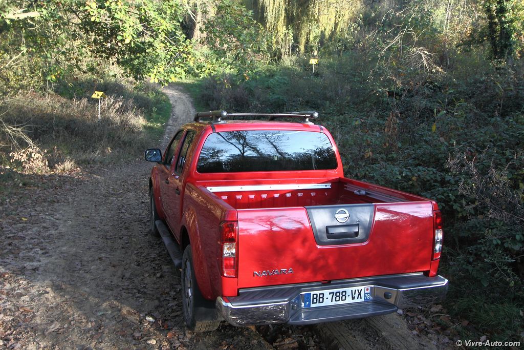 Nous prenons la route muni d’un casque de chef de chantier. Premier constat, hormis à froid, le six cylindres 3,0l de 231 ch se montre particulièrement silencieux ! Les deux tonnes de l’engin sont déplacés sans problème. Le couple généreux de 550 Nm disponible dès 1.750 tr/mn est un vrai régal. La boîte automatique à sept rapports fonctionne bien on lui reprochera juste un léger manque de réactivité. Malgré ses ressorts à lame à l’arrière, le Navara se montre curieusement confortable. Les longs trajets ne sont donc pas un frein. Annoncé en consommation mixte à 9,5 l/100 km nous n’en sommes pas loin avec nos 10 l/100 km. Mais nos trajets comprenait beaucoup de routes. En ville la moyenne grimpera d’environ trois litres. Logique au vu de la puissance et du poids. Concentrons-nous maintenant sur sa fonction principal. Côté chargement, notre version double cabine et sa benne de 1,50 mètre de long peut charger jusqu’à 900 kg. Ouverte ici, elle peut aussi recevoir un hard-top. A la base en simple propulsion, le Navara dispose de deux mode tout-terrain, manipulable depuis une commande sur la console centrale. Le premier 4H réparti le couple équitablement entre l’avant et l’arrière quand le second 4 Low enclenche les