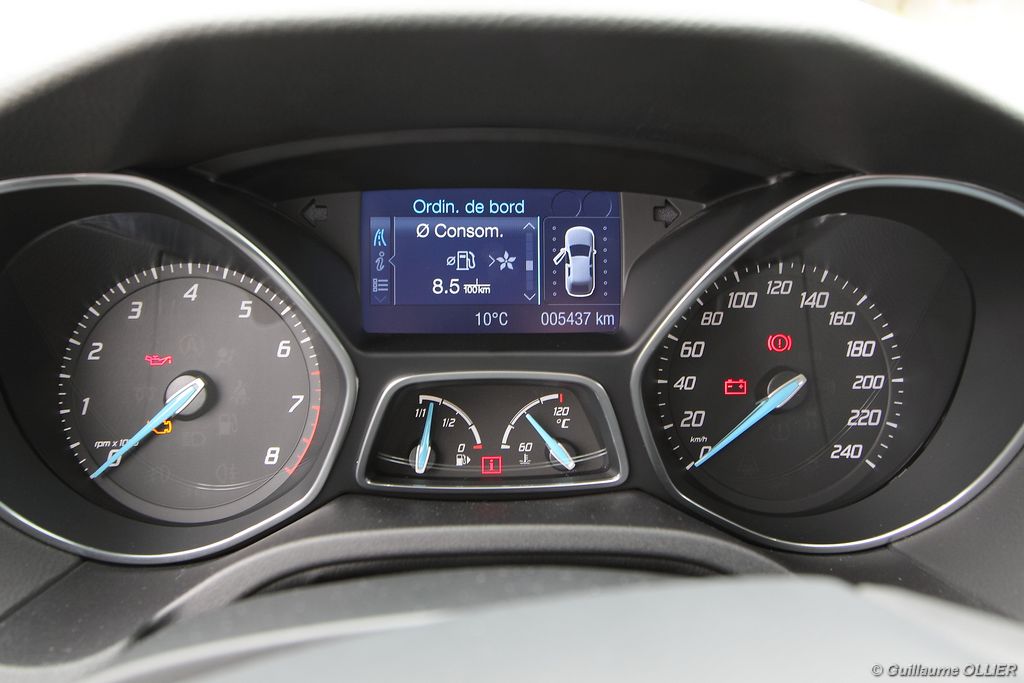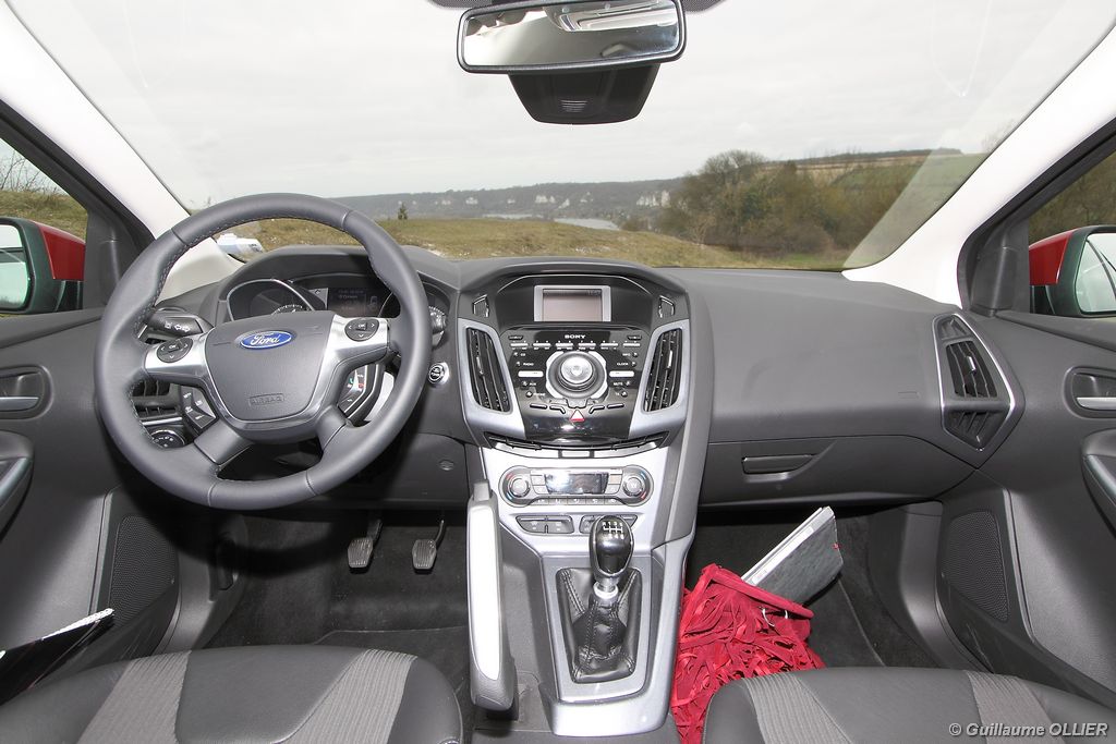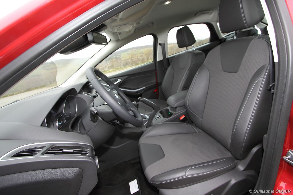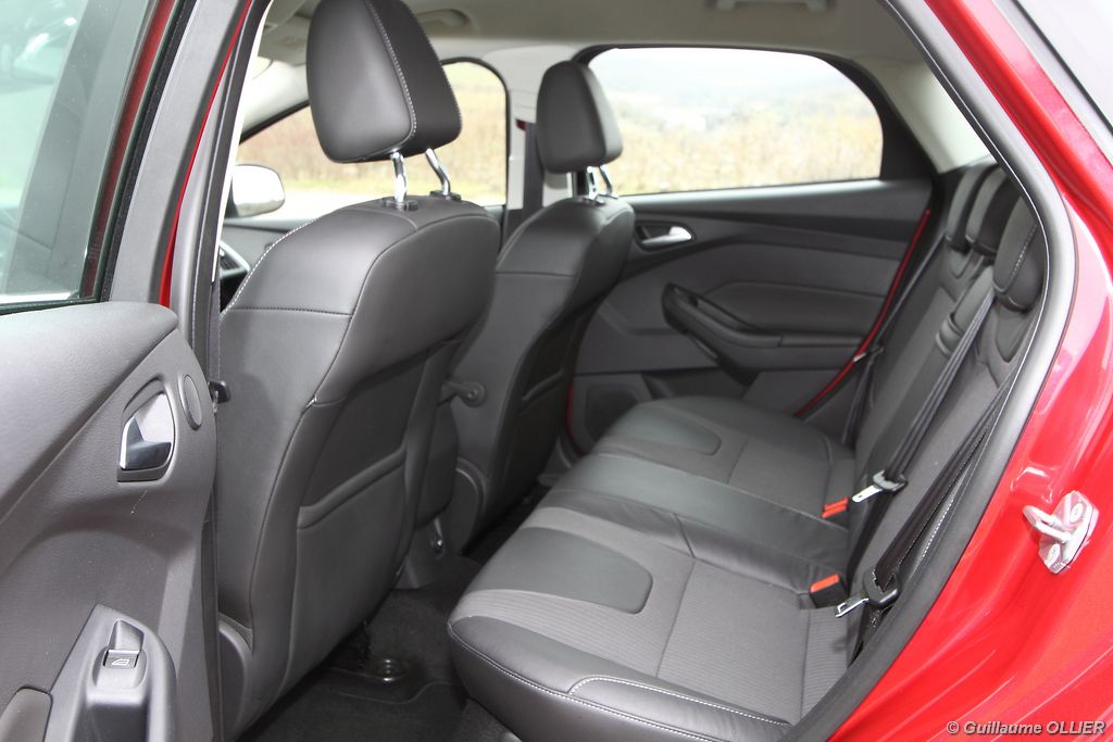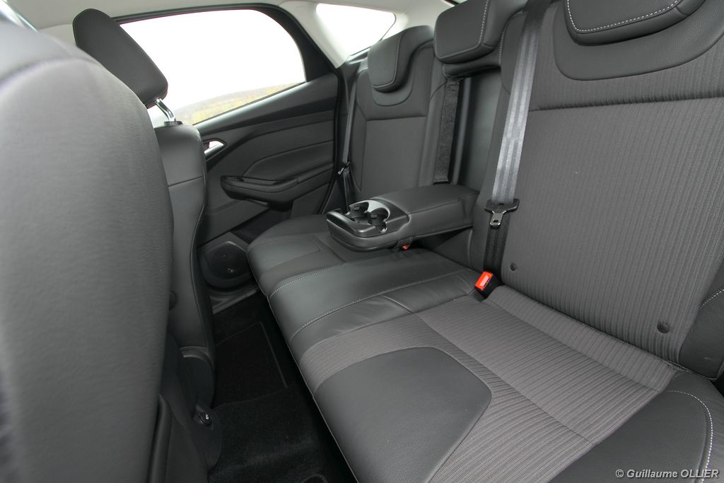 L’intérieur est remis au goût du jour, très moderne avec son style cockpit. On retrouve plusieurs inserts chromés ou laqués pour la partie audio de la console centrale. La finition est en net progression par rapport à la génération précédente, mais ne peut rivaliser face à une Golf. En revanche la planche de bord est moins classique. La position de conduite est bonne, et les différents réglages du siège et du volant conviendront à tout le monde. Le levier de vitesse tombe aisément sous la main. L’ éclairage d’ambiance est à LED. Et lorsque vous empruntez un tunnel le plafonnier s’allume avec une couleur bleue, la même teinte que les aiguilles des compteurs ! Ces derniers sont très lisibles, tout comme l’écran central couleur pilotable depuis les commandes au volant. On déplore une ergonomie moyenne pour la partie multimédia (synchronisation Bluetooth, radio…). Il vous faudra du temps avant de vous habituer au fonctionnement, et ne pas vous perdre parmi les nombreux boutons… Au chapitre de l’habitabilité, la Focus n’est pas la championne de sa catégorie. Même si les places arrière sont convenables, on peut s’attendre à mieux. Le coffre n’offre que 277 litres de volume (avec roue de secours) quand la concurrence s’approche des 400 litres.