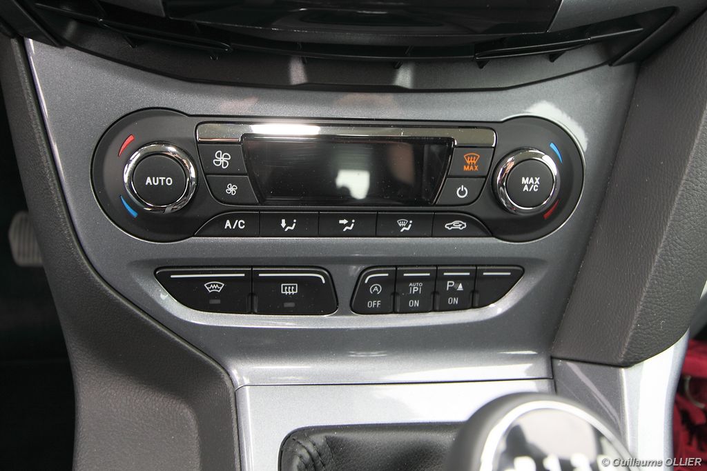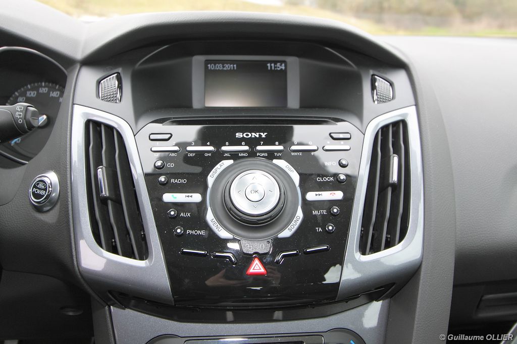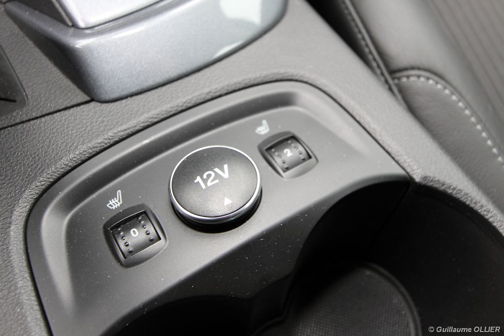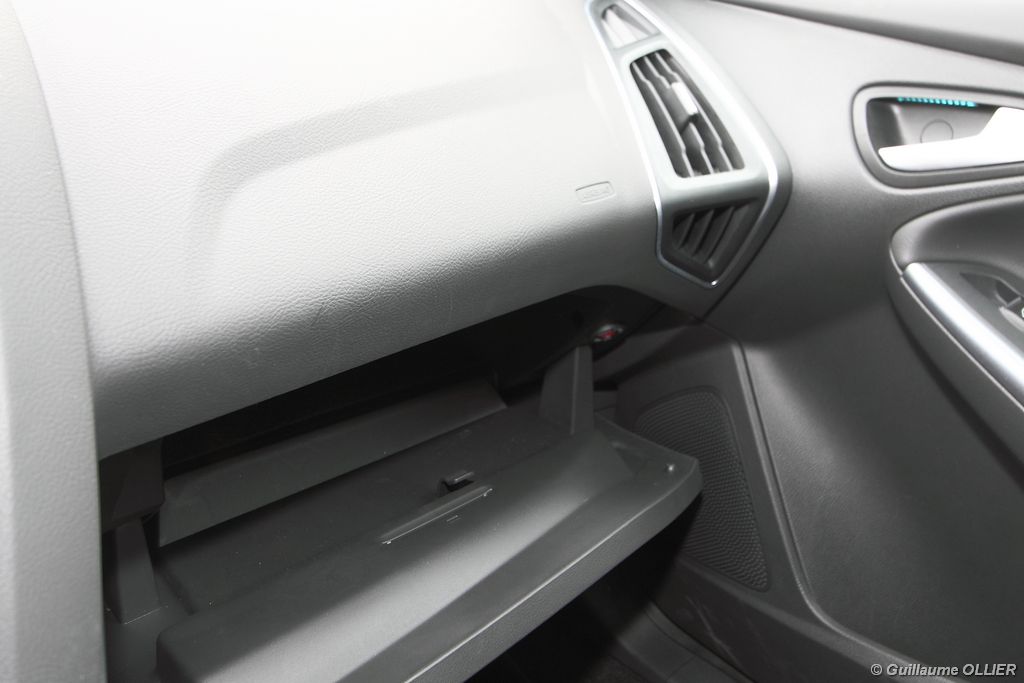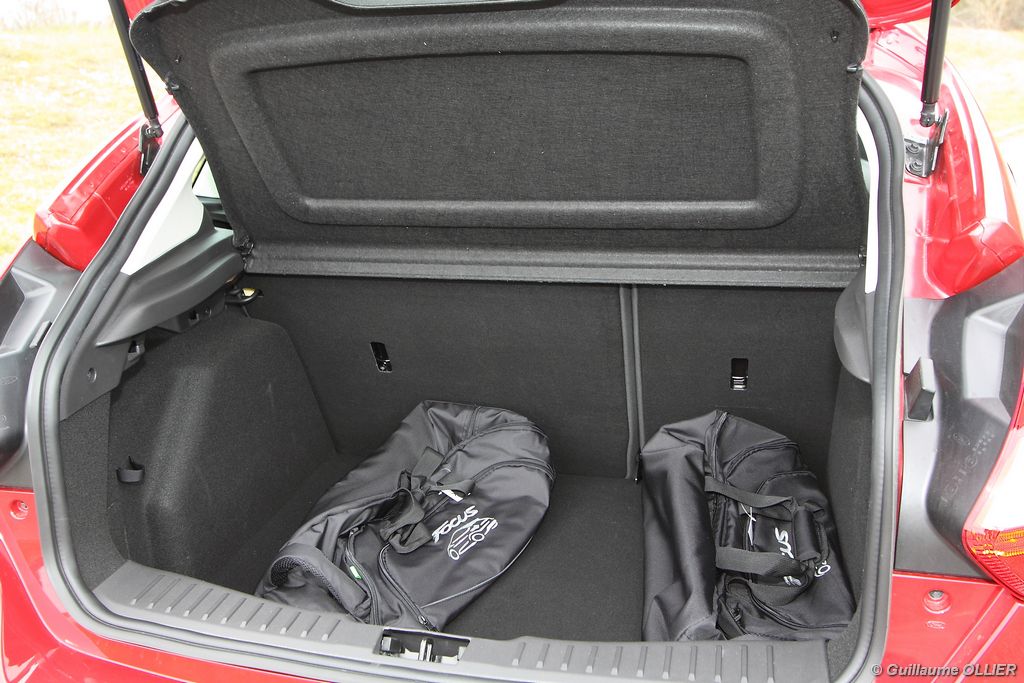 L’intérieur est remis au goût du jour, très moderne avec son style cockpit. On retrouve plusieurs inserts chromés ou laqués pour la partie audio de la console centrale. La finition est en net progression par rapport à la génération précédente, mais ne peut rivaliser face à une Golf. En revanche la planche de bord est moins classique. La position de conduite est bonne, et les différents réglages du siège et du volant conviendront à tout le monde. Le levier de vitesse tombe aisément sous la main. L’ éclairage d’ambiance est à LED. Et lorsque vous empruntez un tunnel le plafonnier s’allume avec une couleur bleue, la même teinte que les aiguilles des compteurs ! Ces derniers sont très lisibles, tout comme l’écran central couleur pilotable depuis les commandes au volant. On déplore une ergonomie moyenne pour la partie multimédia (synchronisation Bluetooth, radio…). Il vous faudra du temps avant de vous habituer au fonctionnement, et ne pas vous perdre parmi les nombreux boutons… Au chapitre de l’habitabilité, la Focus n’est pas la championne de sa catégorie. Même si les places arrière sont convenables, on peut s’attendre à mieux. Le coffre n’offre que 277 litres de volume (avec roue de secours) quand la concurrence s’approche des 400 litres.