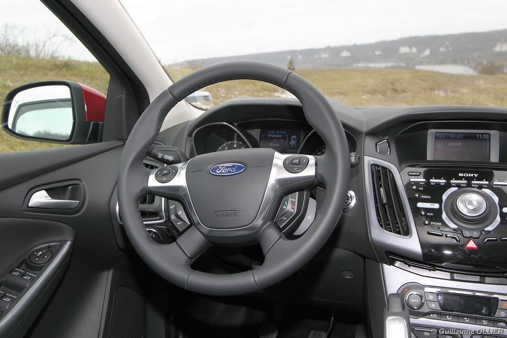 La nouvelle Ford Focus est proposée avec quatre motorisations essences (105, 125, 150 et 180 ch) et quatre Diesel (95, 115 ,140 et 163 ch), un large choix. Nous avons pu essayer le 2.0 SCTi 180 et le TDCi 163, les moteurs les plus puissants. Le 1.6 SCTi 180 est un moteur turbo essence, il est extrêmement linéaire et disponible à bas régime avec son couple de 240 Nm présent dès 1 600 tr/mn. Pour profiter des 182 ch il faut dépasser les 4 000 tr/mn, là où la sonorité n’est pas déplaisante. On retiendra sa polyvalence, à la fois souple en conduite normale, il sait se montrer dynamique quand il faut. La boîte de vitesses manuelle est quant à elle agréable. Le 2.0 TDCi 163 s’est montré discret, très réactif et disponible. La puissance maximale est atteinte à 3 750 tr/mn, son couple de 340 Nm est disponible dès 2 000 tr/mn. Très souple et vif à la fois, il est très plaisant à conduire. La transmission à double embrayage PowerShift accentue le confort de conduite, les rapports s’enchaînent en douceur sans pour autant augmenter le budget carburant. Nous avons réalisé une moyenne de 6,5 l/100 km avec un parcours essentiellement routier avec le TDCi 163 contre 8,5 l/100 km pour le SCTi 180. Ce dernier était doté en plus du système Auto-Start-Stop. Si l’insonorisation est très bien travaillée pour les deux motorisations, sur autoroute les bruits d’air sont bien trop présents. La Focus s’est montrée très agile durant notre essai, son bon comportement routier n’est plus à prouver. De plus elle reste confortable du moins avec la monte de 17 pouces. Enfin la direction à assistance électrique est précise.