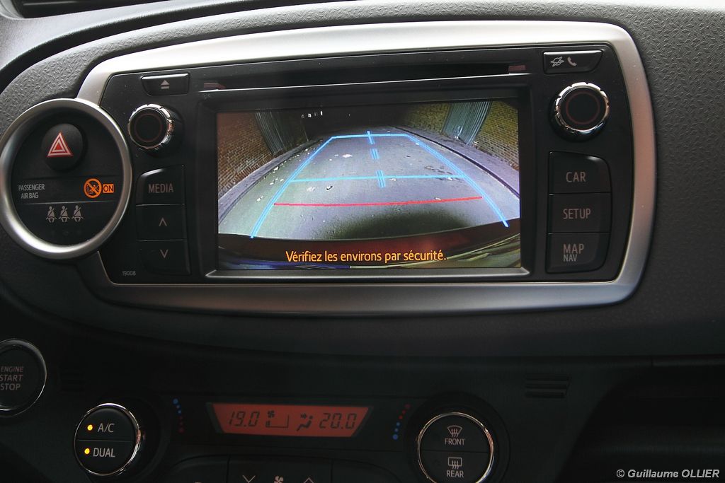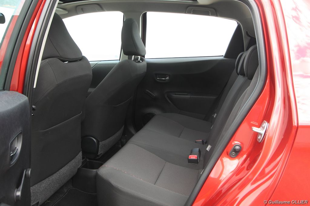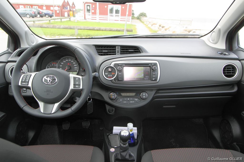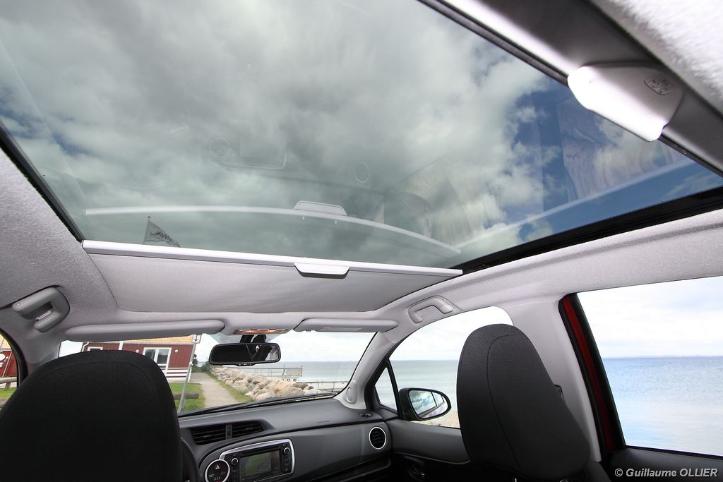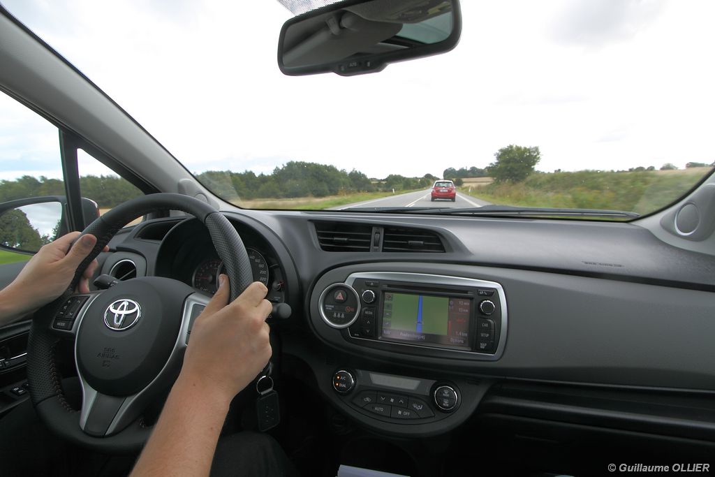 Lorsque l’on monte à bord, on remarque au premier coup d’œil que le volant est plus incliné. Le tableau de bord n’est plus au milieu de la planche de bord mais centré au volant. L’aspect général est plutôt soigné, mais les plastiques durs sont toujours au rendez-vous malgré la présence de quelques parties moussées. vivre-auto-toyota-yaris-2011-essai-24L’assemblage est toujours de bonne facture. Facturé 450€, le toit en verre panoramique renforce encore plus la bonne ambiance générale. Les compteurs sont bien lisibles, et l’ergonomie est dans l’ensemble bien étudiée, toutes les commandes tombent aisément sous la main. Le volant trois branches gainé de cuir surpiqué est agréable au toucher, et réglable en hauteur et en profondeur. La position de conduite est bonne, on regrette juste un léger manque de maintien latéral. Le gros point fort c’est l’écran tactile de 6,1 pouces intégré à la planche de bord, et livré de série sur toutes les finitions ! Très réactif, il permet de commander l’autoradio, et l’ordinateur de bord. Ce dernier se montre relativement complet, avec de multiples informations sur le véhicule, dont des statistiques sur la consommation de carburant sous forme de graphique. La qualité du son est bonne et dès le deuxième niveau de finition vous pouvez écouter vos musiques via le port USB compatible iPod, ou même en streaming Bluetooth. Lorsque vous enclenchez la marche arrière, une caméra de recul vous guide dans votre manœuvre, un équipement encore rare sur les citadines. La devise de Toyota pour cette nouvelle voiture est la suivante : compacte à l’extérieur mais spacieuse à l’intérieur. Vérifions. Avec un empattement allongé de 50 mm, l’aménagement de l’espace est amélioré. Les passagers arrière gagnent ainsi en confort avec un espace aux genoux augmenté de 30 mm et une assise longue de 865 mm, la meilleure mesure de la catégorie. Le coffre offre un volume de chargement de 286 litres ce qui reste dans la moyenne de la catégorie. A noter que la banquette arrière n’est plus coulissante, comme c’était le cas sur les anciennes générations. La cause ? Pouvoir stocker les batteries de la future version hybride dont la commercialisation interviendra l’année prochaine. Enfin, nous avons trouvé que les espaces de rangement avaient diminué. Bacs de portières minuscules, une seule boîte à gants contre deux précédemment, et bien trop petite. La sécurité et le nouveau système multimédia doivent y être pour quelque chose…