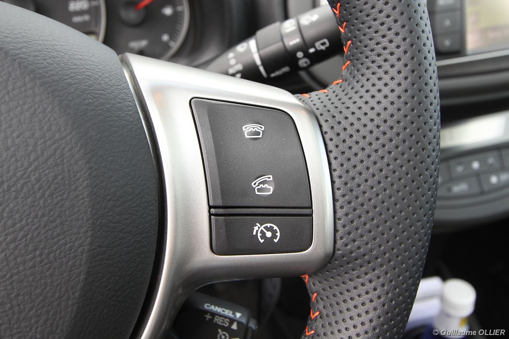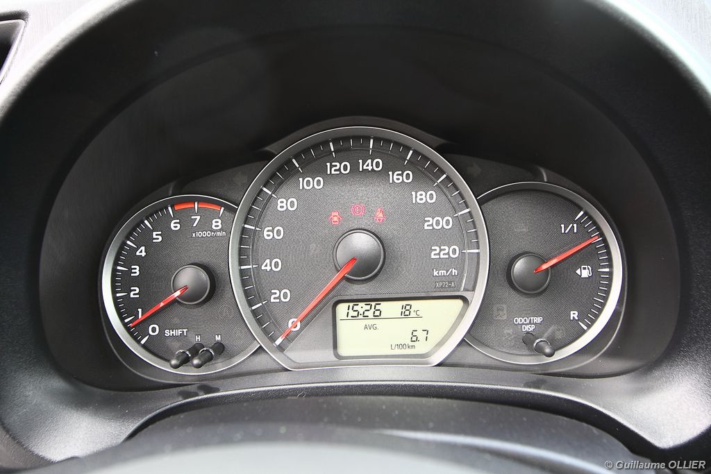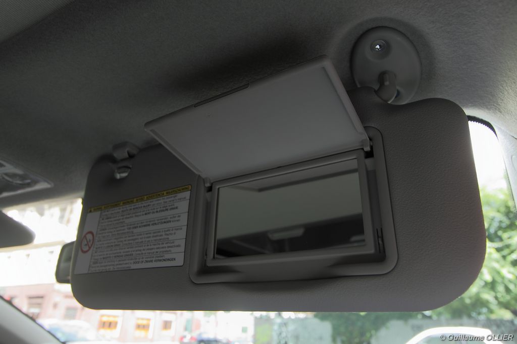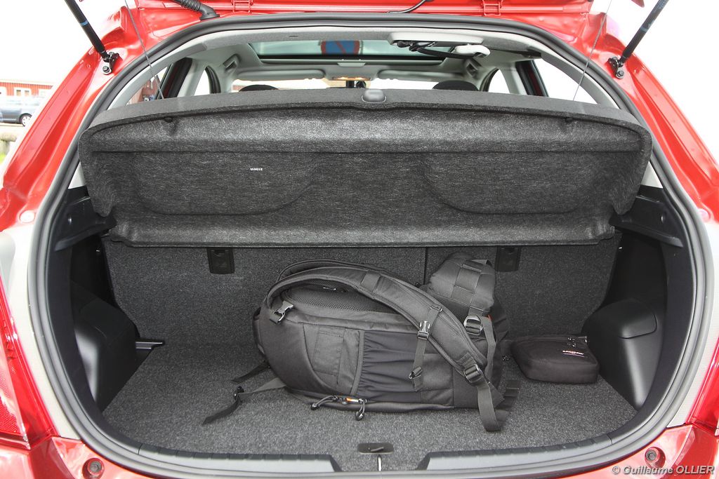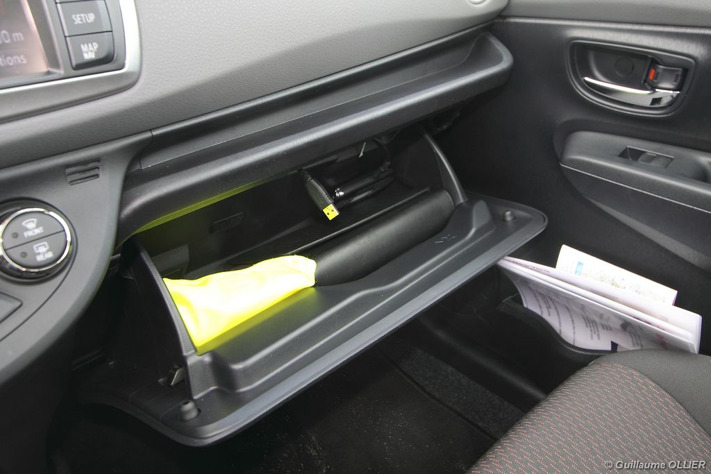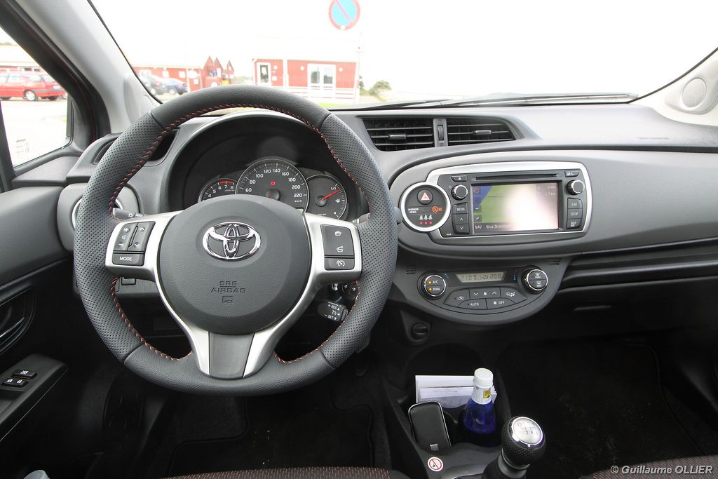 Lorsque l’on monte à bord, on remarque au premier coup d’œil que le volant est plus incliné. Le tableau de bord n’est plus au milieu de la planche de bord mais centré au volant. L’aspect général est plutôt soigné, mais les plastiques durs sont toujours au rendez-vous malgré la présence de quelques parties moussées. vivre-auto-toyota-yaris-2011-essai-24L’assemblage est toujours de bonne facture. Facturé 450€, le toit en verre panoramique renforce encore plus la bonne ambiance générale. Les compteurs sont bien lisibles, et l’ergonomie est dans l’ensemble bien étudiée, toutes les commandes tombent aisément sous la main. Le volant trois branches gainé de cuir surpiqué est agréable au toucher, et réglable en hauteur et en profondeur. La position de conduite est bonne, on regrette juste un léger manque de maintien latéral. Le gros point fort c’est l’écran tactile de 6,1 pouces intégré à la planche de bord, et livré de série sur toutes les finitions ! Très réactif, il permet de commander l’autoradio, et l’ordinateur de bord. Ce dernier se montre relativement complet, avec de multiples informations sur le véhicule, dont des statistiques sur la consommation de carburant sous forme de graphique. La qualité du son est bonne et dès le deuxième niveau de finition vous pouvez écouter vos musiques via le port USB compatible iPod, ou même en streaming Bluetooth. Lorsque vous enclenchez la marche arrière, une caméra de recul vous guide dans votre manœuvre, un équipement encore rare sur les citadines. La devise de Toyota pour cette nouvelle voiture est la suivante : compacte à l’extérieur mais spacieuse à l’intérieur. Vérifions. Avec un empattement allongé de 50 mm, l’aménagement de l’espace est amélioré. Les passagers arrière gagnent ainsi en confort avec un espace aux genoux augmenté de 30 mm et une assise longue de 865 mm, la meilleure mesure de la catégorie. Le coffre offre un volume de chargement de 286 litres ce qui reste dans la moyenne de la catégorie. A noter que la banquette arrière n’est plus coulissante, comme c’était le cas sur les anciennes générations. La cause ? Pouvoir stocker les batteries de la future version hybride dont la commercialisation interviendra l’année prochaine. Enfin, nous avons trouvé que les espaces de rangement avaient diminué. Bacs de portières minuscules, une seule boîte à gants contre deux précédemment, et bien trop petite. La sécurité et le nouveau système multimédia doivent y être pour quelque chose…