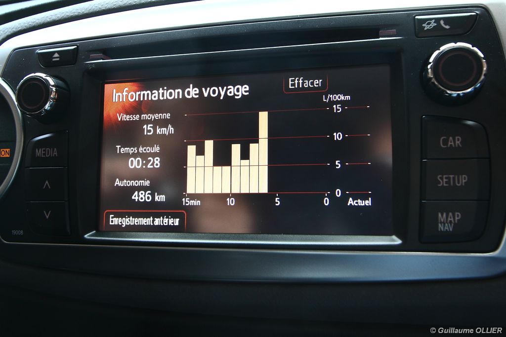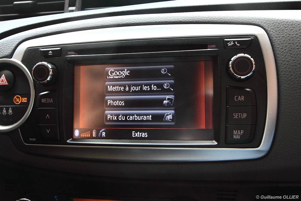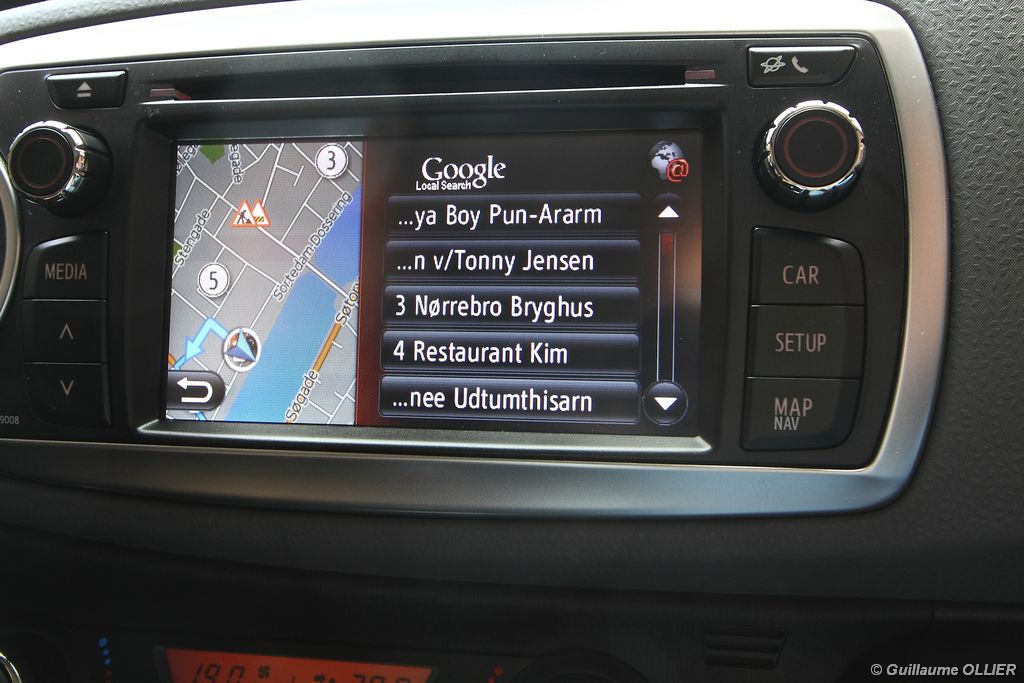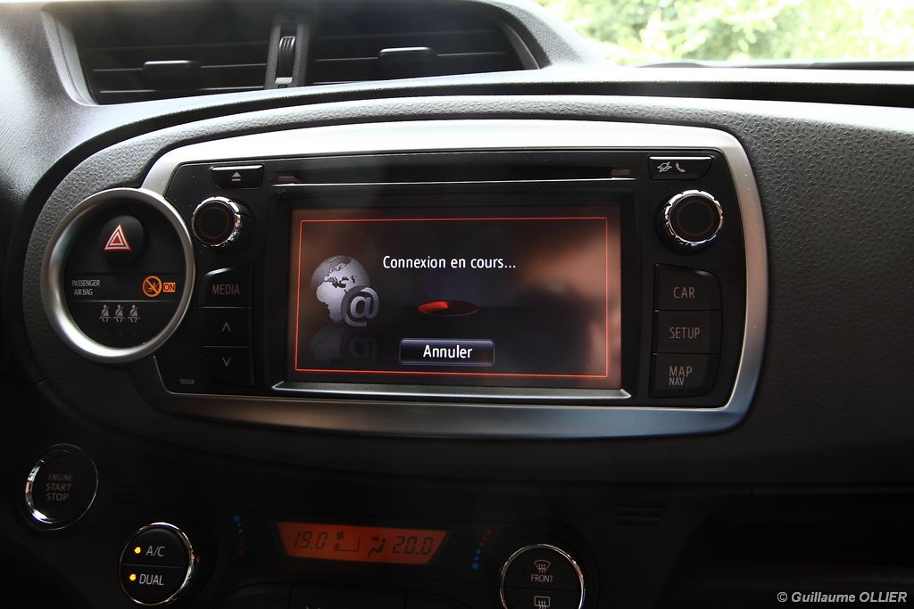 vivre-auto-toyota-yaris-2011-essai-44La nouvelle Toyota Yaris embarque un nouveau système multimédia inédit. Baptisé Touch&Go, cet équipement utilise l’écran tactile et regroupe un GPS Europe, et l’accès à internet via un téléphone mobile. C’est plutôt inédit pour une citadine ! Tout d’abord, le GPS se commande très facilement et présente un affichage de qualité. Il indique les limitations de vitesse, avertit les dépassements, et prévient de la présence des radars fixes. Nous n’avons pas de reproche particulier à lui faire et nous vous le conseillons grandement ! Ensuite, le système est capable d’utiliser votre téléphone pour se connecter à Internet et vous apporter diverses informations. Tout d’abord la recherche locale Google, elle consiste à vous indiquer sur le GPS un ou plusieurs lieux autour de vous à partir d’un mot. Par exemple si vous tapez le nom d’une chaine de magasin, vous obtiendrez l’itinéraire vers le magasin le plus proche. Des applications sont également téléchargeables comme la météo, les prix des carburants, la disponibilité des places de parking ou même Facebook… Pour utiliser cette fonction, en plus de l’accès à internet dans votre forfait, l’option usage modem doit être activée ce qui nécessite un coût supplémentaire. Toyota est par ailleurs en cours de négociation auprès des opérateurs pour faire baisser les tarifs des options pour moins de 5€ par mois. Le Touch&Go est facturé seulement 600€, une modeste somme. Le TomTom de Renault est ainsi détrôné (610€ pour la cartographie Europe) ! De plus, pour les six premiers mois du lancement de sa nouvelle citadine, le constructeur offre l’option aux clients.