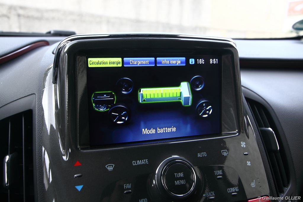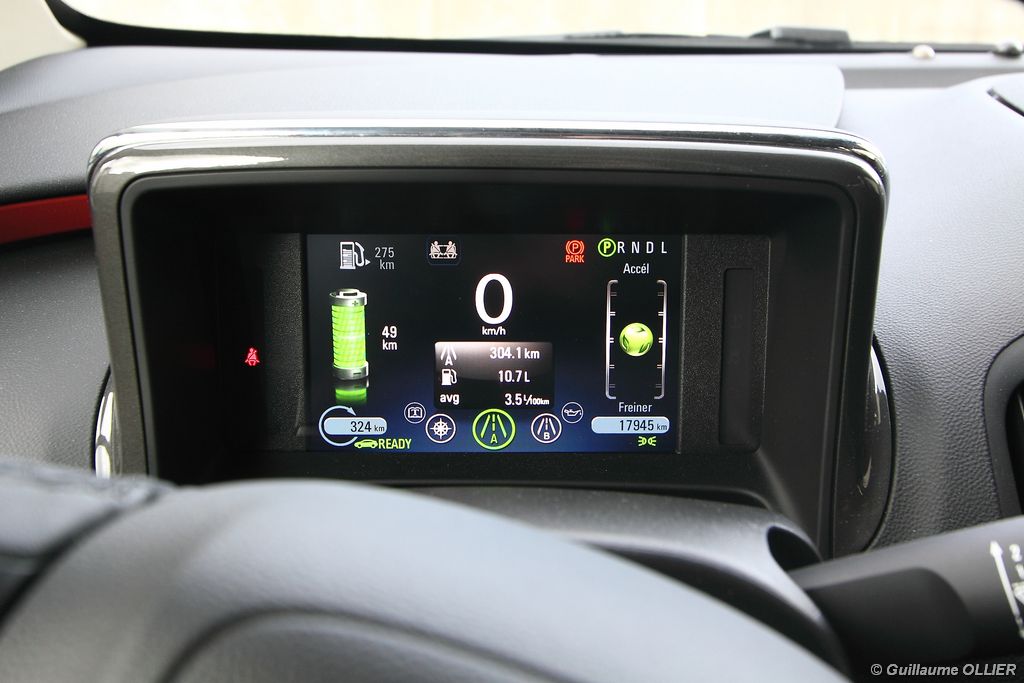 Ces chiffres sont-ils vraiment la réalité ? Et bien oui. Sur plusieurs parcours d’environ 70 km, nous avons obtenu une moyenne de 50 km avant que le moteur thermique s’enclenche. Son fonctionnement représentait un peu plus d’un quart du parcours, soit une consommation total d’essence de 2 litres. Notre meilleure performance fut 67 km en tout électrique. Le réservoir de 35 litres permet ainsi de réaliser environ 400 km supplémentaires. Notons également qu’à l’inverse d’une voiture thermique classique, l’Opel Ampera utilisera plus d’énergie sur route que dans les bouchons ou en ville, de quoi satisfaire beaucoup d’automobilistes. L’ordinateur de bord regroupe toutes les informations nécessaires à la durée de la batterie et à l’énergie utilisée.
