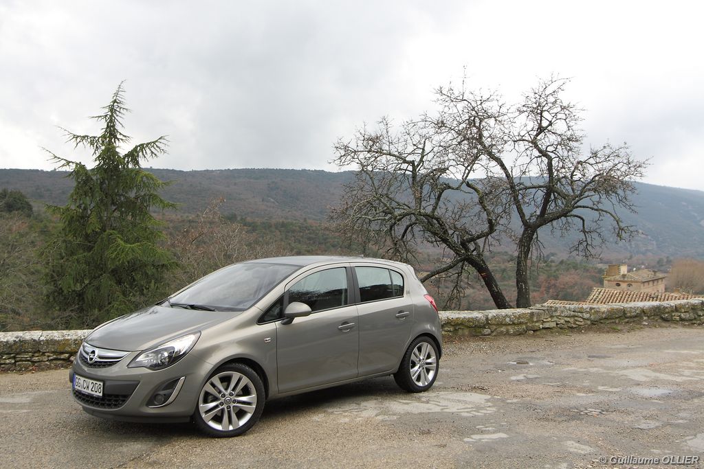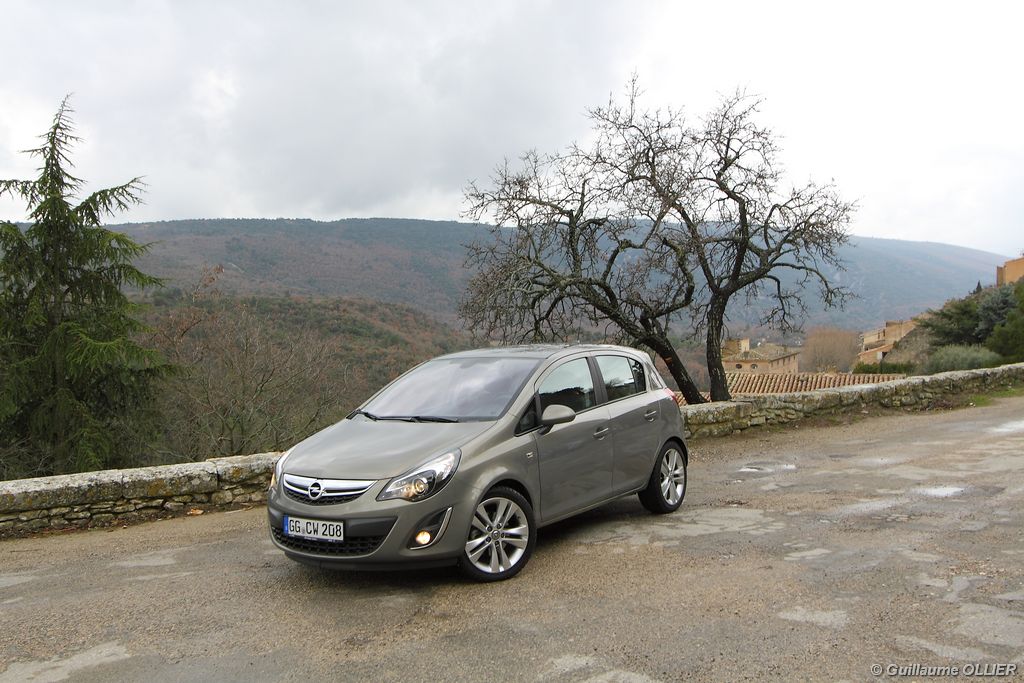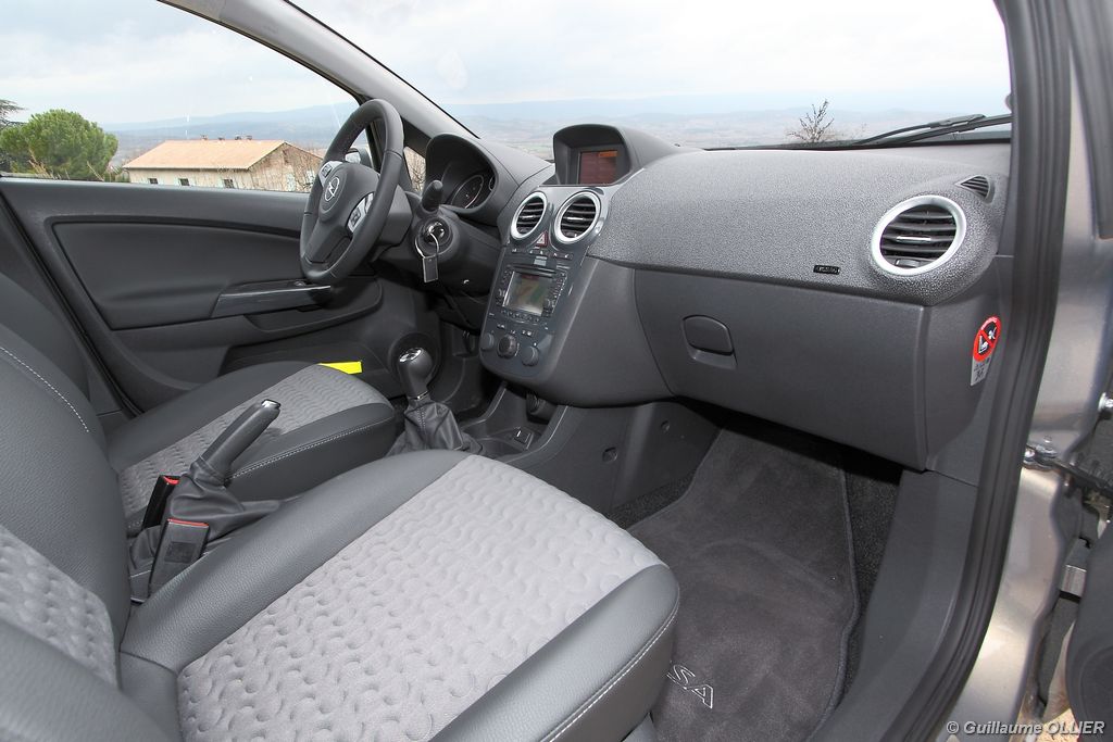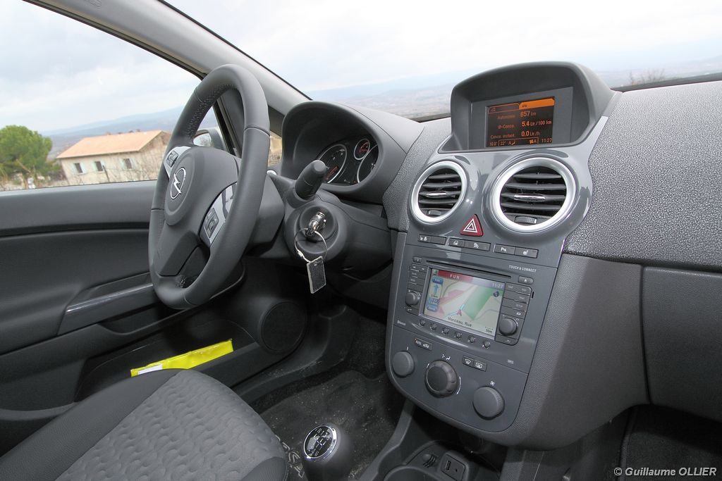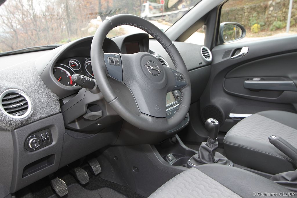 La gamme de motorisations disponibles sur la Corsa comprend 4 moteurs essence de 65 à 192 ch, et 3 moteurs Diesel de 75 à 130 ch. Nous avons essayé le 1.3 CDTi 95 ch puisqu’il est dorénavant équipé d’un système Start/Stop réduisant de 8,7% la consommation. Opel annonce ainsi une consommation mixte de 3,5l/100 km pour des rejets de CO² de 94 g. Confortable et agréable en ville, ce moteur convient parfaitement à la Corsa. Le système Stop/Start qui coupe le moteur à l’arrêt s’est montré discret et rapide. On regrette que le moteur soit relativement bruyant. La transmission s’effectue avec une boîte manuelle à 5 vitesses, en usage urbain rien à redire mais sur route c’est totalement différent, où les rapports très longs ne facilitent en rien les phases d’accélération. L’année dernière la Corsa s’est vue doter d’un nouveau châssis et d’une direction améliorée. Nous apprécions toujours la tenue de route et la direction qui se montre précise. Un bon point pour une citadine.