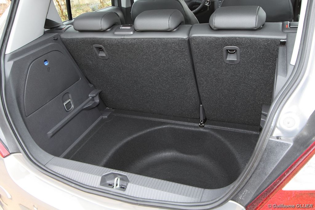 Personnalisable à l’extérieur, c’est également le cas pour l’intérieur. Suivant les finitions, la partie supérieure de la planche de bord peut être Anthracite, Rouge, Bleue ou Noire. De même pour la console centrale d’aspect chrome, blanc, gris laqué, ou noir piano. La finition reste dans la moyenne de la catégorie mais en dessous de celle des françaises. Le volant trois branches est gainé de cuir, il peut se régler en hauteur et en profondeur. L’ergonomie est bonne dans l’ensemble, toutefois la commande de clignotants ne dispose pas de cran, ce qui peut être déplaisant pour certains. Les équipements proposés sont très nombreux et pour certains indisponibles chez les citadines concurrentes, volant chauffant, phares directionnels adaptatifs, toit panoramique en verre ouvrant, assistance au démarrage en côte, porte-vélos FlexFix… Notons l’arrivée d’un nouveau système multimédia baptisé « Touch & Connect », facturé seulement 690€ (de série sur Cosmo), il comprend un système de navigation avec écran tactile, le kit Bluetooth, les connexions USB et iPod. Il se montre très intuitif mais nous avons été déçus de l’emplacement de l’écran, qui s’avère être bien trop bas. Quel dommage de devoir quitter la route des yeux ! D’autant plus qu’un large écran multifonction qui ne regroupe que très peu d’informations est situé en haut de la console centrale. Aux places arrière l’espace alloué est correct, et un adulte peut s’y installer sans problème. Le coffre offre une capacité de 285 litres de chargement, ce qui est dans la moyenne, une Peugeot 207 offre 270 litres.