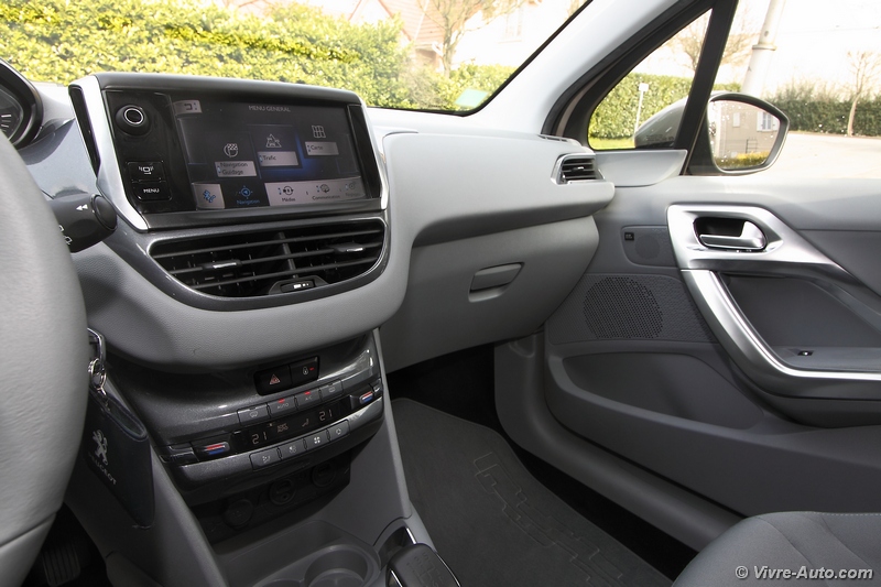 Le volant en cuir, plus petit, est maniable et très agréable à prendre en main. Les combinés perchés en hauteur peuvent gêner certains selon leur position de conduite, la partie haute du volant cachant ces derniers. La planche de bord est munie d’un écran tactile de 7 pouces qui regroupe les différentes commandes du véhicule à part la climatisation qui dispose toujours de sa propre console. Cet équipement, de série dès le deuxième niveau de finition évite la profusion de boutons sur la console centrale. Son utilisation est simple mais l’ergonomie aurait pu être plus aboutie encore. Pour 500€ de plus, vous pouvez ajouter le GPS, la firme Sochalienne propose enfin l’équivalent du fameux Tomtom de Renault.