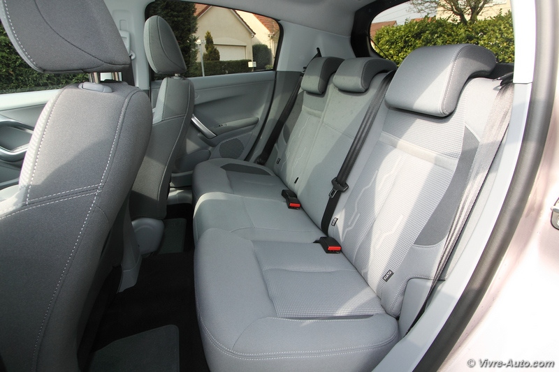 Les sièges offrent un bon maintien, et sont ni trop mous, ni trop durs. Avec un empattement similaire à la 207, l’habitabilité arrière devrait être semblable, seulement cette fois-ci, les passagers arrière apprécieront l’espace creusé derrière les sièges avant, et gagneront 5 cm pour les genoux. De plus leur assise est surélevée, ce qui leur offre une meilleure vision de la route.