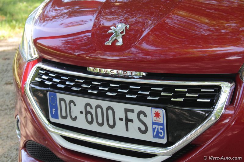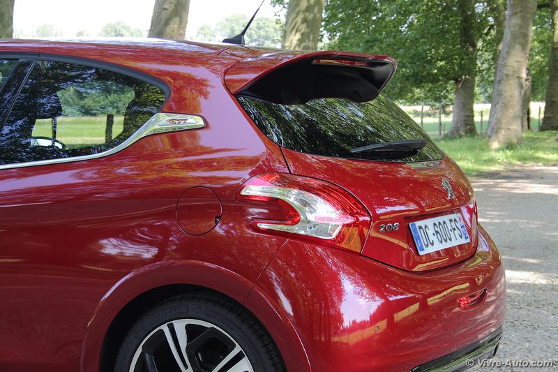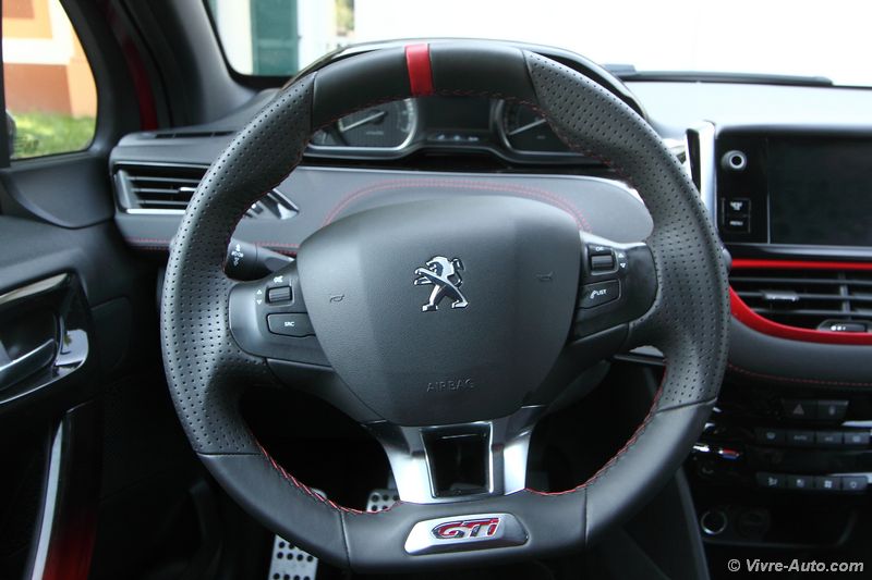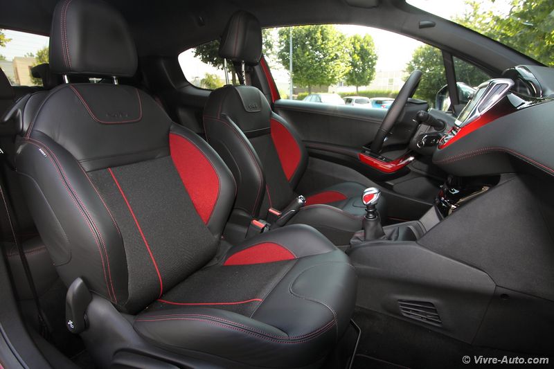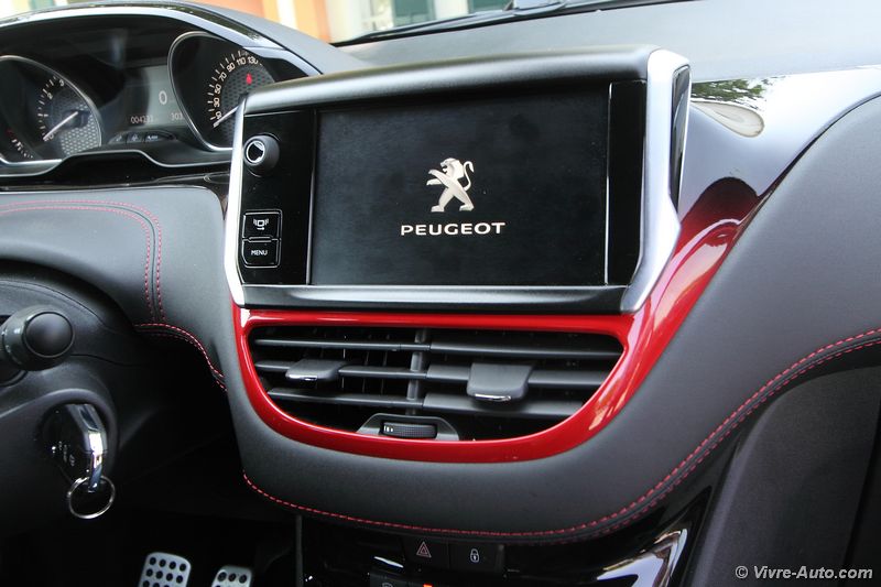 A bord de la 208 GTi, le rouge est aussi mis en avant. A la fois sur les renforts des sièges baquets, les surpiqûres (siège, volant, soufflet, planche de bord) et sous forme de peinture dégradée de noir sur les éléments en plastique des portières et de l’entourage de l’écran multimédia. Les compte-tours, surélevés, sont dotés d’un fond en aluminium brossé dessiné d’un motif en damier noir brillant et le jonc chromé qui les encadre est rétroéclairé par des LED rouges. Le volant compacte de la 208 est ici très bien mis en valeur, en cuir pleine fleur noir, il se compose d’un trait noir en son point milieu et d’un badge GTi à la base du méplat. Le pommeau du levier de vitesse et le pédalier sont en aluminium. Que penser de cet intérieur ? Et bien on l’aime, il est très chic et les divers éléments comme les magnifiques sièges cuir/tissus accentuent le côté sportif sans trop en faire. On soulignera également que la qualité des matériaux employés ainsi que les finitions sont de très bonne facture et supérieurs aux principales rivales : Renault Clio R.S. et Ford Fiesta ST. L’accès aux places arrière est bien sûr plus difficile en raison de la configuration trois portes, mais l’espace offert est correct pour la catégorie. Et pour le chargement, le volume du coffre reste inchangé soit 285 litres.