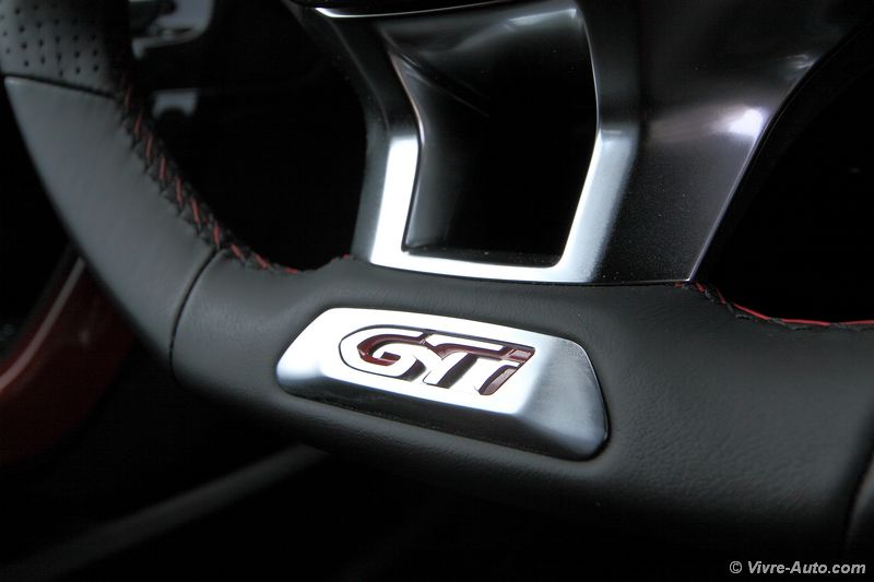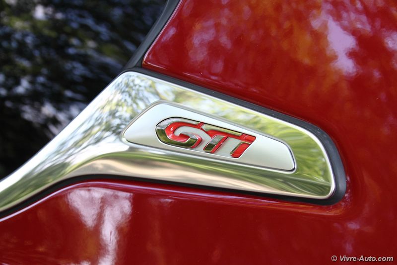 élargies, 1 cm à l’avant et et 2 cm à l’arrière, une suspension affermie et une assiette plus basse. Sous le capot, les ingénieurs ont greffés le quatre cylindres essence 1.6 THP suralimenté, il développe 200 ch et surtout un couple confortable de 275 Nm. Le 0 à 100 km/h est abattu en 6,8 secondes soit 0.1 secondes de moins que la Clio R.S. Dès les premiers tours de roues on apprécie la grande souplesse offerte par la mécanique permettant des passages de vitesse à des régimes moyens suivi de bonnes reprises. En régime plus soutenu, la cavalerie déploie sa puissance tout en restant linéaire. Cette GTi est tout simplement très polyvalente ! Et que dire sur la tenue de route ! Le châssis est littéralement collé à la route, le petit volant offre une direction très directe, sécurisante et communicative. Même lorsque l’ESP est totalement déconnecté, son agilité est remarquable. On n’observe aucune perte de motricité ni de