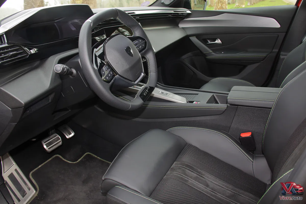 Peugeot n’a pas jugé nécessaire de révolutionner un habitacle déjà très moderne. Toutefois, précisons que contrairement aux récents 3008 et 5008, la 308 n’hérite pas encore du dernier i-Cockpit panoramique incurvé. On reste sur une configuration classique de 10 pouces (volant bas pour voir les compteurs), reste une référence en termes de design. Cette version GT s’offre une sellerie inédite avec des surpiqûres vertes du plus bel effet. Les matériaux sont moussés, les assemblages impeccables : on flirte clairement avec le monde du premium.