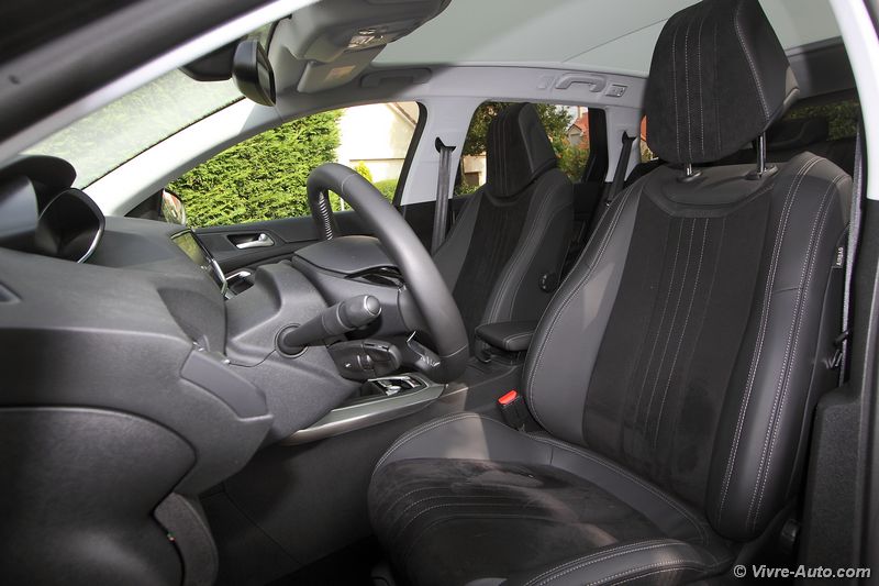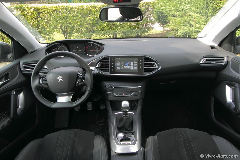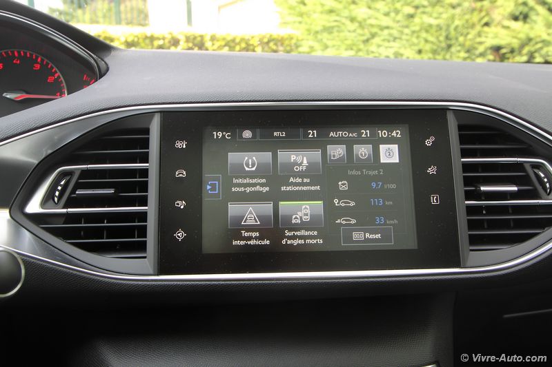 Pour le reste, l’intérieur est identique à la berline avec le minuscule volant très agréable, et les compte-tours surélevés inaugurés sur la 208. Pour ceux qui n’ont pas encore remarqué, la 308 dispose d’une particularité un peu déconcertante au début, le compte-tours est inversé pour être symétrique au compteur de vitesse. Même constat que chez la citadine, suivant le gabarit du conducteur, la jante du volant peut gêner la vue. Autre particularité, la planche de bord très épurée ne comprend qu’une rangée de bouton, l’ensemble des commandes étant regroupés sur un écran tactile multifonction de presque 9,7 pouces (climatisation, réglages, téléphone, système audio, GPS…). Certaines personnes adorent, d’autres trouvent cela moins pratique. En tout cas, la qualité de fabrication et les matériaux employés sont de très bonnes factures. Au chapitre des équipements c’est très complet avec notamment l’assistance au démarrage en côte, l’accès et le démarrage sans clé, le frein de parking électrique, la surveillance des angles morts et un régulateur adaptatif. Enfin, au vu de la taille du break, une caméra de recul ainsi qu’un système d’aide au stationnement qui évalue la taille des places de parking et gère automatiquement les manœuvres sont un plus.