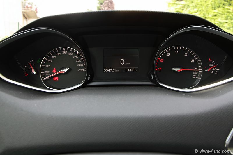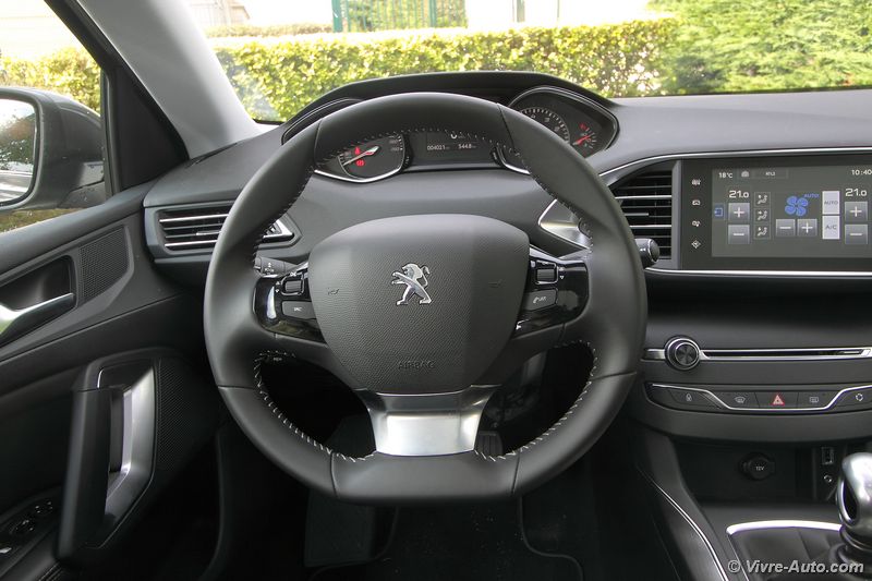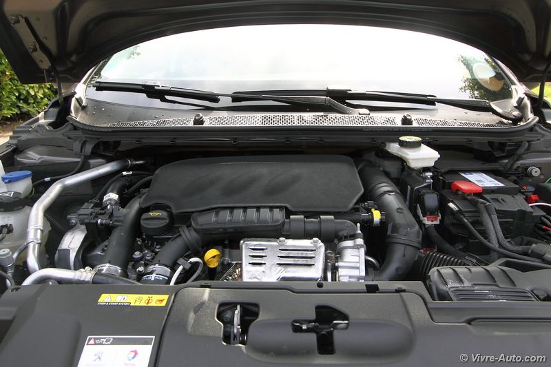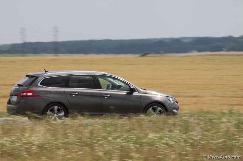 L’arrivée de la nouvelle 308 SW est l’occasion pour Peugeot d’ajouter au catalogue son nouveau moteur trois cylindres 1.2 PureTech 130, il équipe notre modèle d’essai. Avec une sonorité pas désagréable pour un trois cylindres, ce bloc moteur est très surprenant ! Développant 130 ch à 5.500 tr/mn et un couple de 230 Nm à 1.750 tr/mn, il est à la fois souple et offre de bonnes reprises même à bas régime. Mentions spéciale pour la boîte de vitesse qui, contrairement à certaines voitures, ne dispose pas de rapports trop longs. Proposé en option (280€), le Driver Sport Pack ajoute un bouton « Sport » sous le levier de vitesse, ce mode ne change en rien les performances du moteur, mais augmente la réponse de la pédale d’accélérateur et rend la direction plus ferme. Il amplifie également le son du moteur dans les haut parleurs pour plus de sensations et les compte-tours deviennent rouge. Après plusieurs centaines de kilomètres on constate vite que les ingénieurs n’ont pas chaumés en nous offrant un moteur très performant pour une si petite cylindrée. Et c’est pareil pour le poids, par rapport à l’ancienne génération, le 308 SW pèse 140 kg de