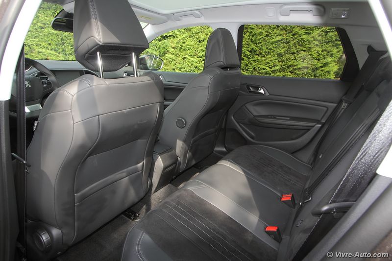 Contrairement aux générations précédentes, 307 SW et 308 SW, cette fois-ci le break compacte du lion ne sera pas haut perché. La raison ? La gamme comprend aujourd’hui des monospaces et SUV. Et ce n’est pas plus mal en fin de compte, un break restant un break. Le style reprend l’esprit de la berline, de l’avant jusqu’au début des portières arrière rien ne change. La partie arrière, très élégante, n’alourdit en rien la ligne globale. Les larges surfaces vitrées sont entourées de chrome comme sur la berline, mais en série. Enfin, de fines barres de toit complètent l’architecture. Le SW est plus long de 33 cm (4,58 m) et son empattement gagne 11 cm au profit de l’espace à bord. Une question importante se pose. Est-ce que ce design empiète sur l’habitabilité ?