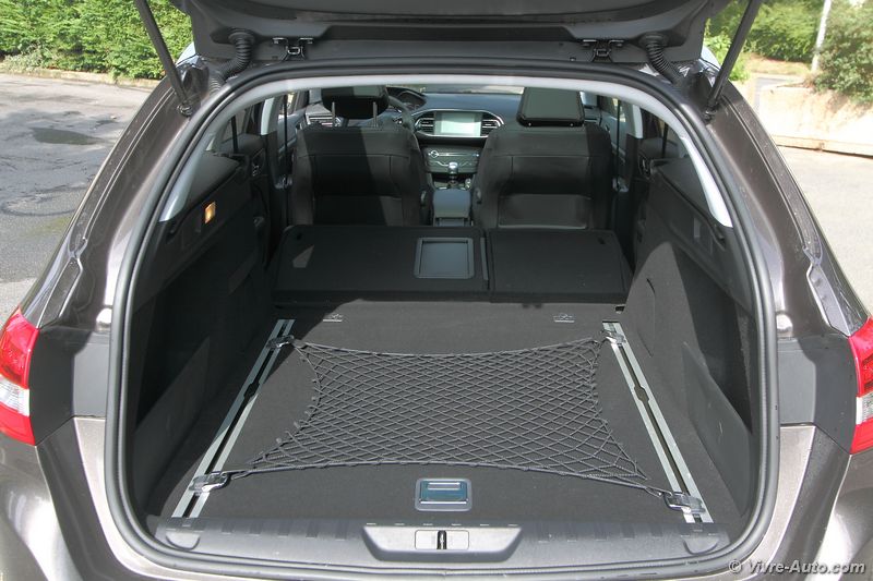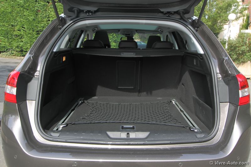 Et bien après avoir fait le tour du propriétaire et observer les caractéristiques techniques, la réponse est non ! Le Peugeot 308 SW est le break compacte le plus spacieux du marché, il détrône ainsi le Honda Civic Tourer (lire notre essai). Son volume de chargement est exceptionnellement vaste avec 660 litres (624 l chez Honda). Soit le même volume que la 508 SW. Vous l’aurez compris, le coffre était un des points importants du cahier des charges. Pour préserver la modularité, il n’existe pas de troisième rangée comme auparavant, les deux sièges supplémentaires n’étant que des sièges d’appoint ce n’est pas grave. La banquette se replie très facilement à l’aide de deux poignées et libère un plancher plat pour un volume total de 1.775 litres. Dommage que le siège passager avant ne se rabat pas ou encore l’absence d’un logement pour le cache bagage. Quand aux occupants arrière, ils bénéficient de 3 cm supplémentaires aux genoux.