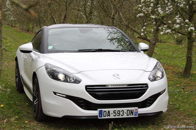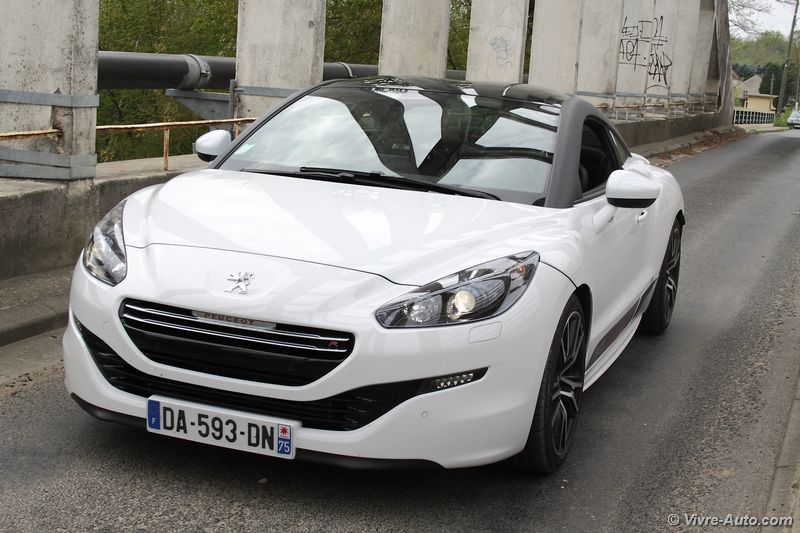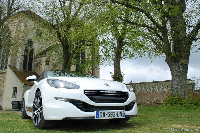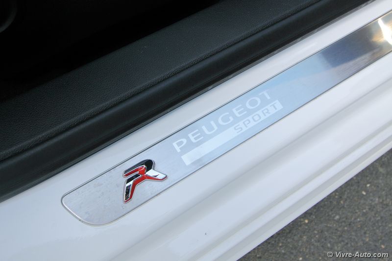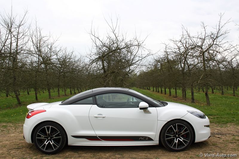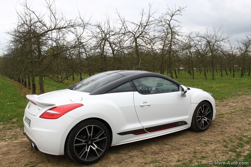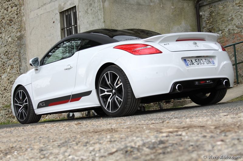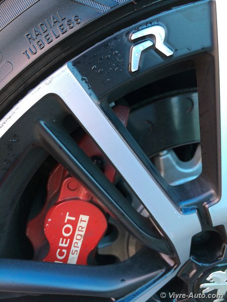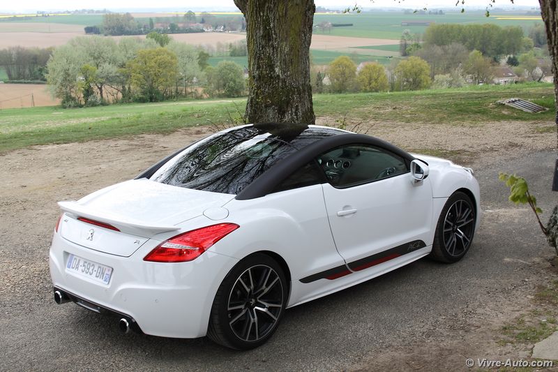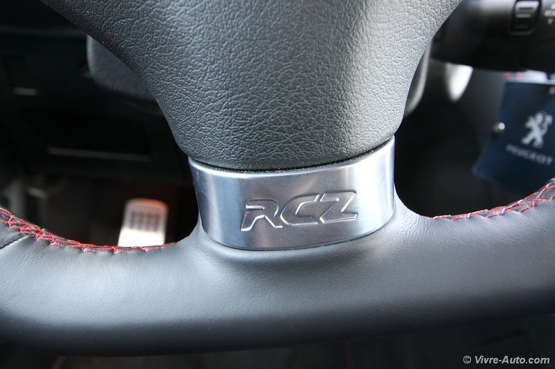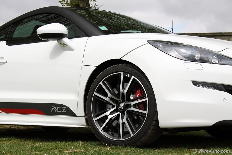 imposant et un nouveau diffuseur qui intègre deux sorties d’échappement symétriques. Les jantes de 19 pouces laissent apparaître des étriers de freins siglés Peugeot Sport peints en rouge, couleur que l’on retrouve sur les logos « R » apposés sur la grille de calandre et sur la malle arrière. Autre détail, les arches de toit sont en noires mates (en option habituellement) et les stickers que vous voyez sur notre modèle d’essai sont au catalogue des accessoires. Quatre teintes de carrosserie sont disponibles, blanc Opale, gris Sidobre, rouge Erythrée et noir Perla Nera. Enfin, la caisse est abaissée de 10 mm. La RCZ de base est déjà très réussie à l’extérieur, la version R ajoute quelques touches de bon goût et donne clairement le ton.