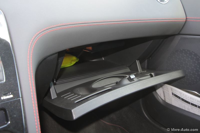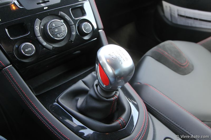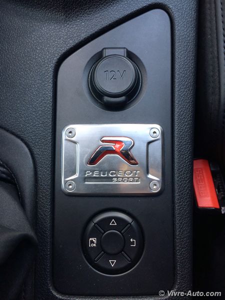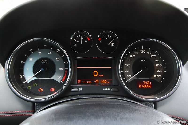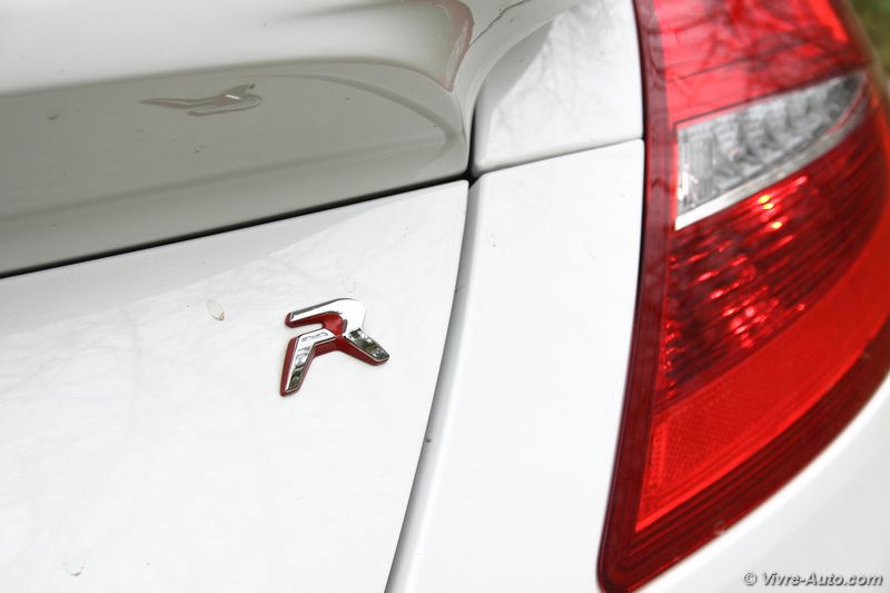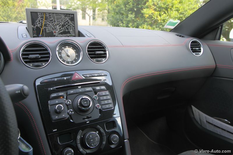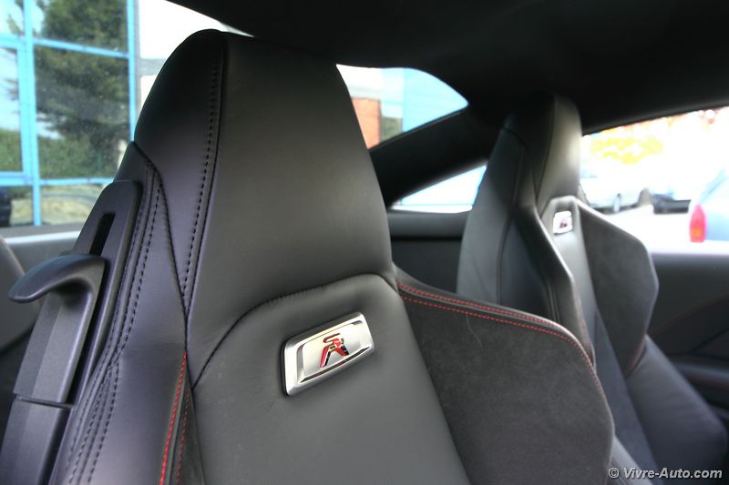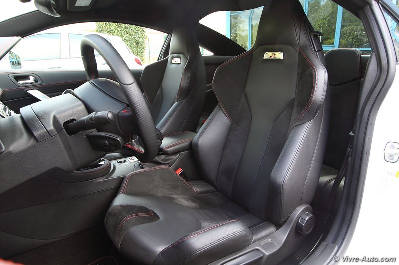 Une fois installés à bord, on se retrouve dans des beaux sièges baquets en cuir et alcantara au très bon maintien. Il est possible d’opter pour des sièges cuir plus traditionnelles en option (810€). Ce qui est le plus appréciable, c’est de pouvoir trouver sa position de conduite idéale grâce aux différents réglages du siège et du volant, qui, ce dernier, dispose d’un très grand débattement en hauteur. A sa base, se trouve le logo R, comme sur le levier de vitesse, spécifique. Pour le reste, la planche de bord est intégralement recouverte de cuir et de surpiqûres rouge du plus bel effet ! L’habitabilité reste inchangée dans ce coupé 2+2, bien sûr il ne faut pas considérer les places arrière comme des places ordinaires puisqu’elles ne serviront que d’appoint pour les adultes ou sinon réservées aux enfants en bas âges, c’est mieux que rien dira t-on. Quant au coffre, il offre un volume de 384 litres de chargement, suffisant pour des bagages. La RCZ R est très bien équipée puisqu’elle dispose de presque tous les équipements, seul les radars de stationnement avant/arrière (260€), le système HiFi JBL (510€) et l’alarme (310€) sont en option.