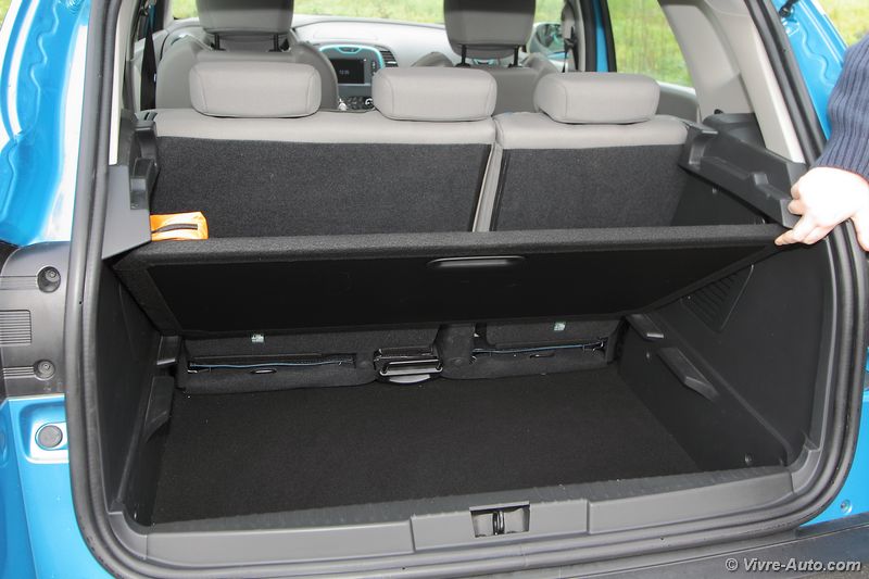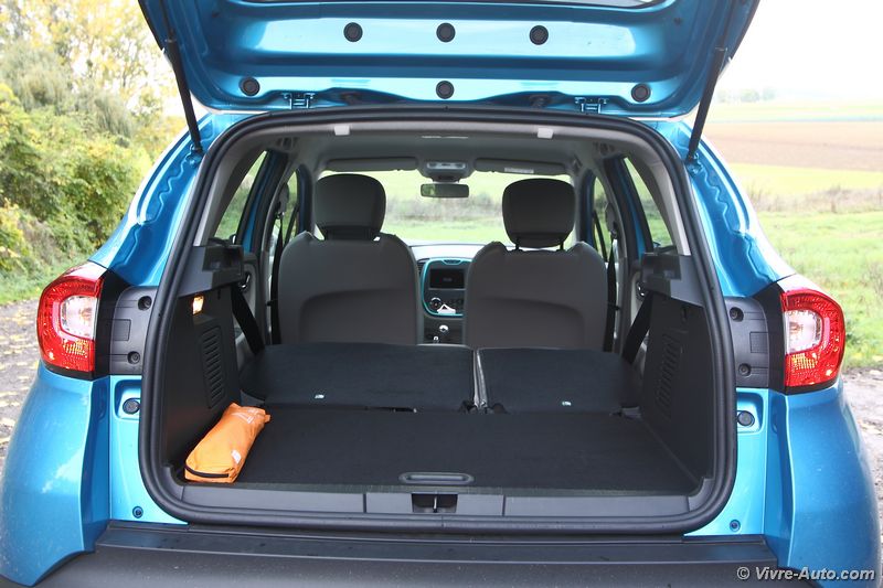 Et l’habitabilité ? Avec une position de conduite haute, comme dans un Scénic, on obtient une meilleure visibilité, une impression de sécurité et un accès à bord facile. Dommage que l’accoudoir central soit facturé 150€… Les passagers arrière profitent d’un espace aux jambes digne d’une berline grâce à une banquette coulissante sur 16 cm. Le volume du coffre est généreux avec 377 litres de chargement possible pouvant s’étendre à 455 litres selon l’avancement de la banquette. Une fois repliée (pas de plancher plat), on obtient un volume total de 1 235 litres. Les assises sont en revanche fixes. Enfin, sous le plancher se trouve un espace supplémentaire. C’est donc une bonne note face à la concurrence puisque le Peugeot 2008 (350 litres) et l’Opel Mokka (362 litres) sont en retrait.