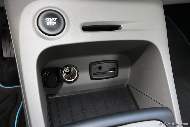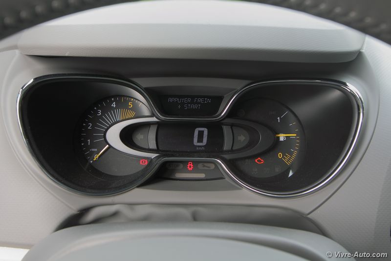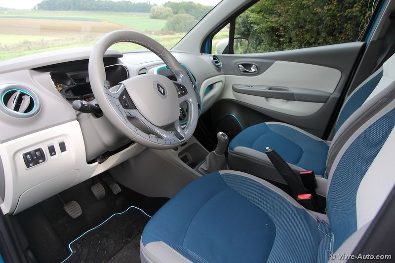 A bord, la planche de bord n’est pas identique à celle de la Clio, à l’inverse du 2008 et de la 208. On trouve ainsi un intérieur qui vise la personnalisation avec six teintes au choix. La console centrale, les aérateurs, les hauts parleurs et le dessus de la boîte à gants reçoivent des inserts en plastique bleu ou orange. Petit plus, qui s’avère utile, les housses des sièges peuvent s’enlever et ainsi être lavées en machine ! Si vous optez pour le « Pack Thème » facturé 350€, des motifs habilleront les sièges et le volant à votre goût. Les espaces de rangement sont nombreux, la boîte à gant se présente sous la forme d’un grand bac d’un volume de 11 litres. Globalement, l’intérieur est plutôt original et en accord avec l’extérieur, mais les matériaux employés ne sont pas spécialement de bonne facture avec des plastiques durs. Le dessin de la planche de bord reste agréable et nous fait oublier ce détail.