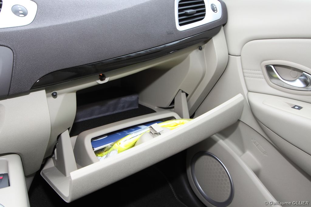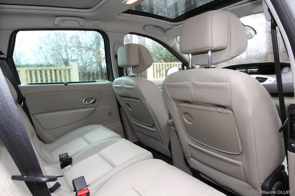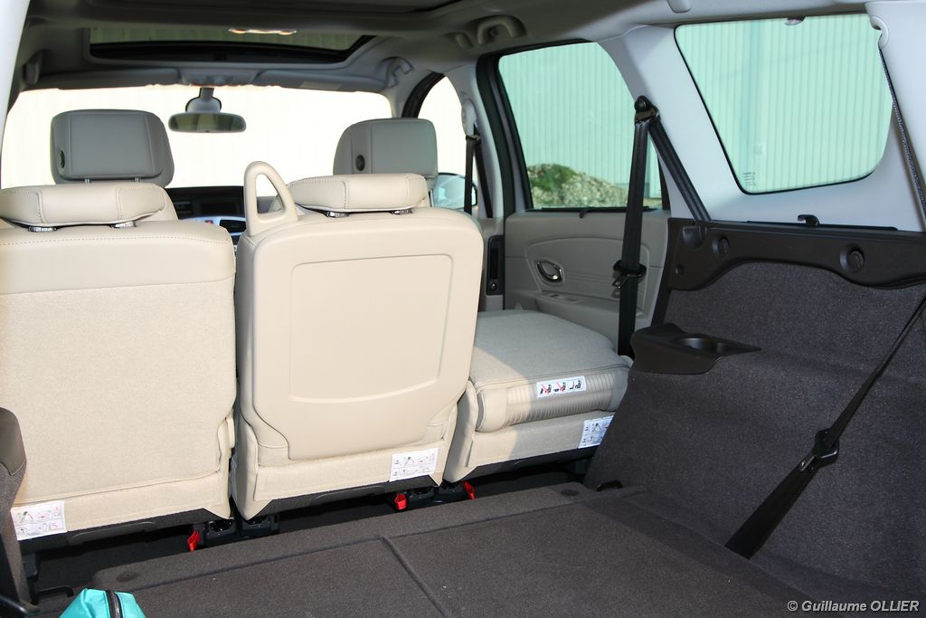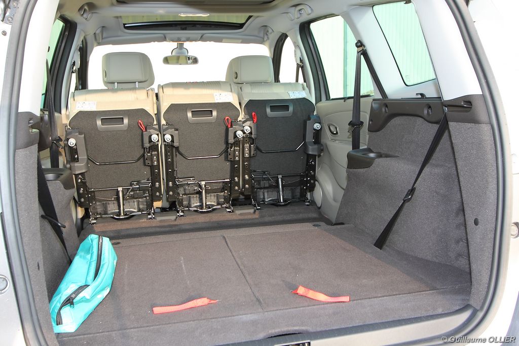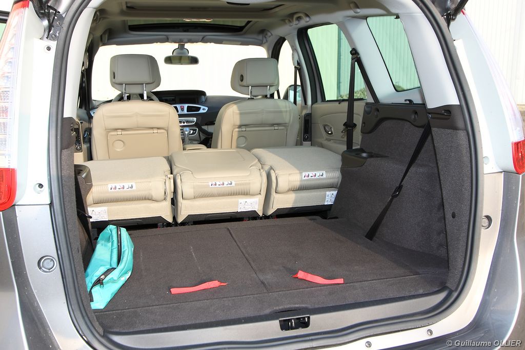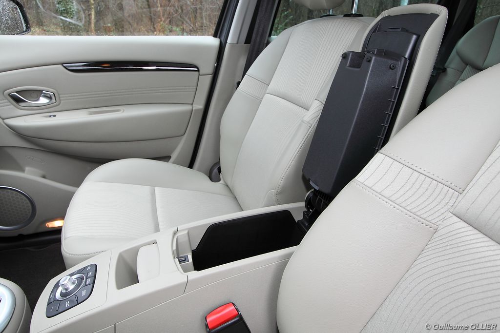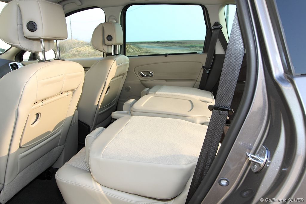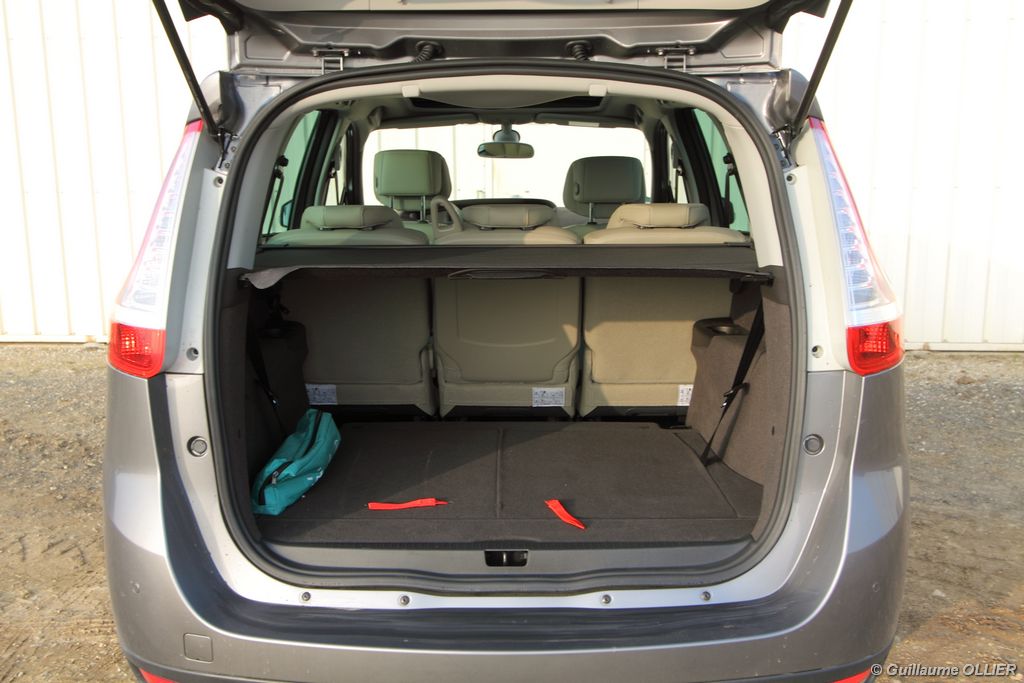 se montre lisible en toutes circonstances et très réactif notamment l’affichage du compte-tours. Nous avons apprécié la richesse des fonctionnalités tel que la personnalisation de l’affichage, la fonction de streaming audio Bluetooth, la compatibilité avec l’iPod ou encore la carte mains libres. Les équipements proposés sont assez nombreux, la carte mains libres, et le frein de parking automatique vous facilitent la vie au quotidien. Une caméra de recul est même disponible en option à 300€, c’est une première pour un monospace français ! Enfin, mention spéciale pour le système de navigation GPS Carminat TomTom. Celui-ci se révèle extrêmement intuitif et offre une ergonomie parfaite grâce à la commande située à l’extrémité de l’accoudoir. Au chapitre volume de chargement, le coffre affiche un espace important de 564 litres s’étendant jusqu’à 2 063 litres une fois les trois sièges arrière retirés. De largeur identique et coulissants, ils peuvent se rabattre indépendamment voire être retirés de l’habitacle. La modularité est un peu dépassée, chez certains concurrents les sièges se dissimulent par exemple dans le plancher. A noté que le siège avant passager peut se rabattre pour le transport d’objets longs. Les deux places arrière s’escamotent facilement, pour les longs trajets des enfants seront plus à l’aise que des adultes. Côté rangements à bord, le Scénic reste la référence avec un volume total impressionnant de 92 litres. La liste des emplacements est longue : quatre trappes sous plancher, deux tiroirs sous sièges à l’avant, 2 tiroirs aux places latérales arrière, une boîte à gants réfrigérée de plus de 11 litres, un rangement ouvert sur la console centrale et une console centrale de 9 litres de rangement en deux parties. Sans oublier les poches aumônières au dos des sièges et deux autres rangements dans le coffre.