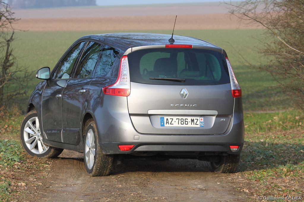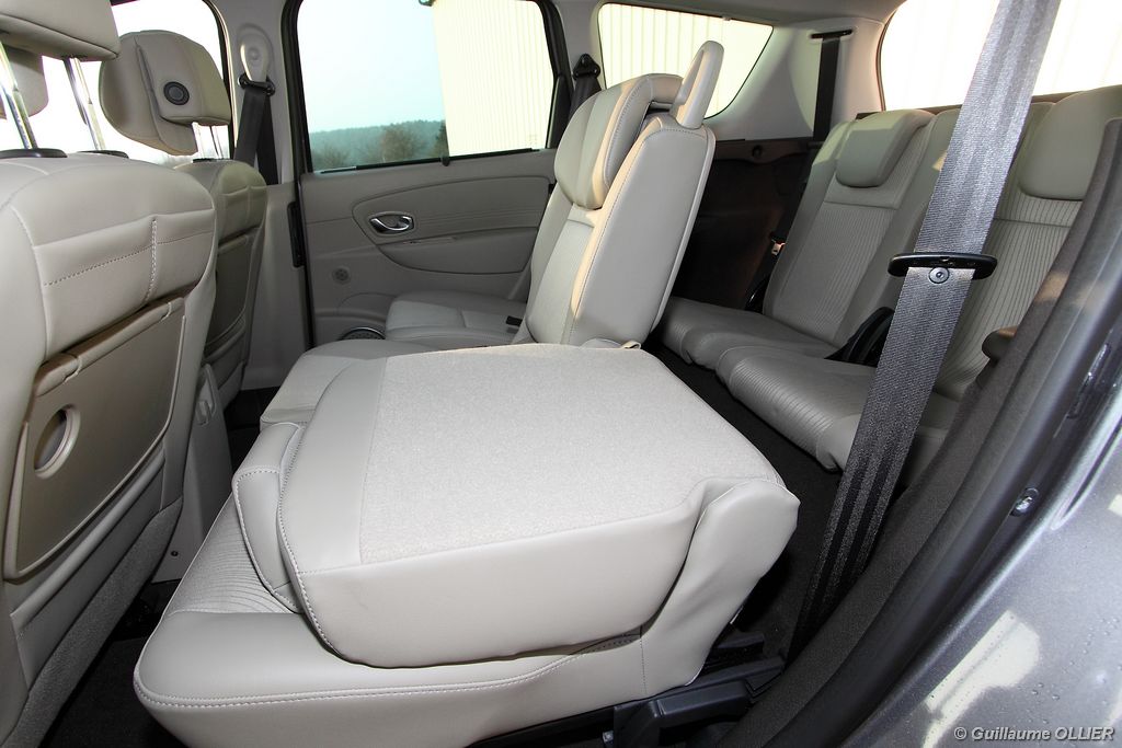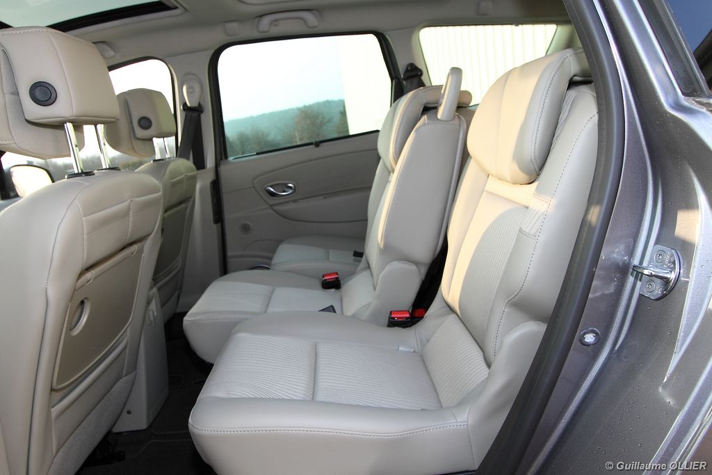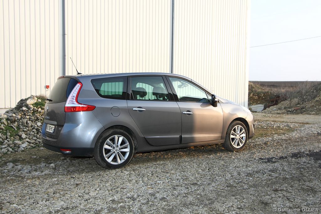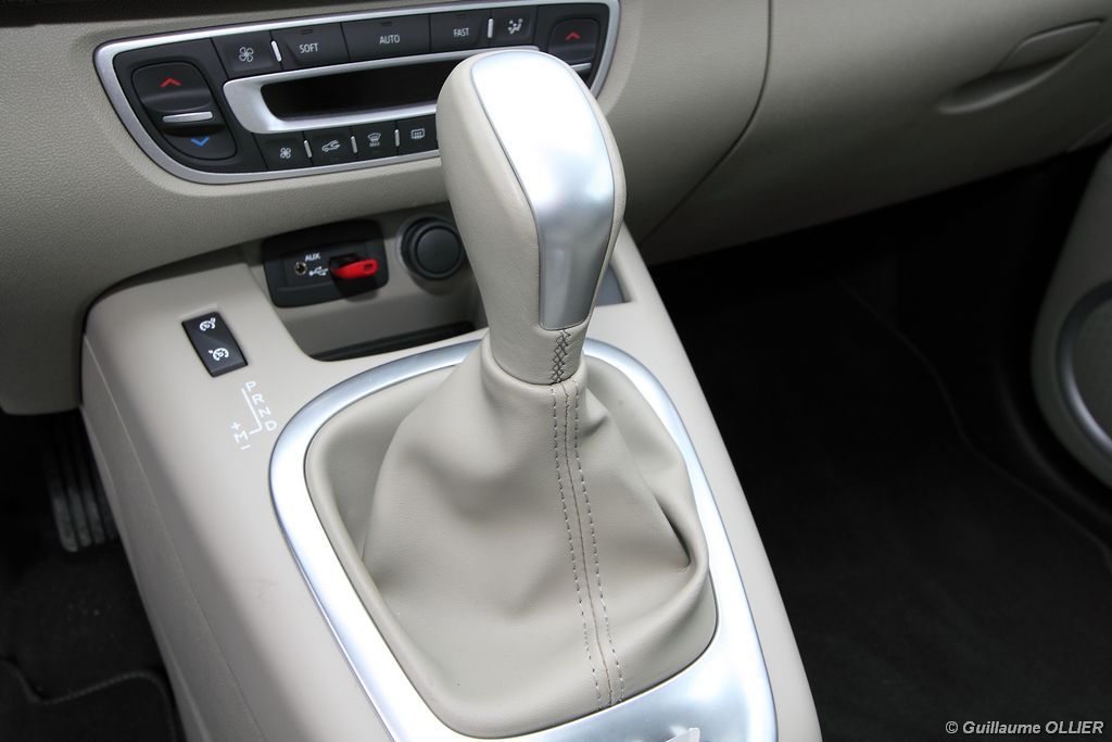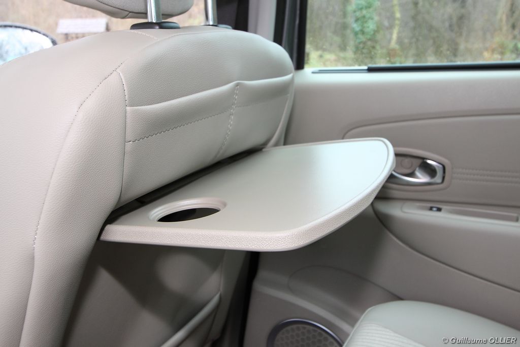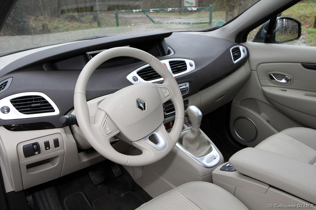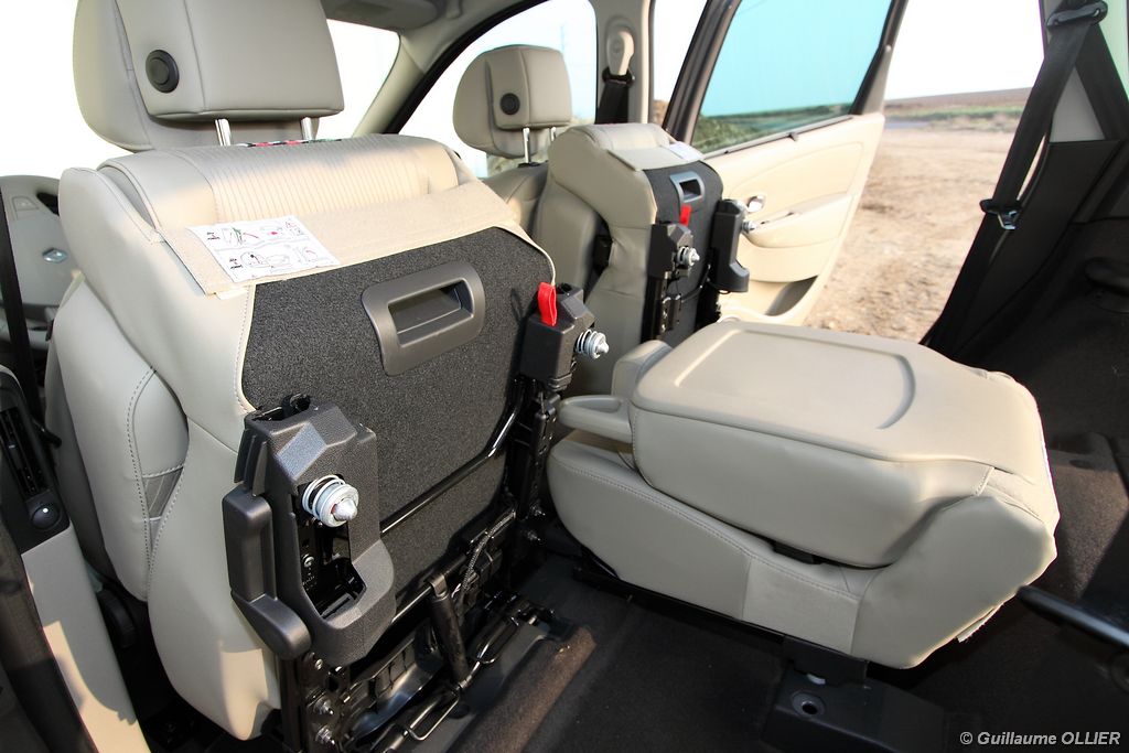 se montre lisible en toutes circonstances et très réactif notamment l’affichage du compte-tours. Nous avons apprécié la richesse des fonctionnalités tel que la personnalisation de l’affichage, la fonction de streaming audio Bluetooth, la compatibilité avec l’iPod ou encore la carte mains libres. Les équipements proposés sont assez nombreux, la carte mains libres, et le frein de parking automatique vous facilitent la vie au quotidien. Une caméra de recul est même disponible en option à 300€, c’est une première pour un monospace français ! Enfin, mention spéciale pour le système de navigation GPS Carminat TomTom. Celui-ci se révèle extrêmement intuitif et offre une ergonomie parfaite grâce à la commande située à l’extrémité de l’accoudoir. Au chapitre volume de chargement, le coffre affiche un espace important de 564 litres s’étendant jusqu’à 2 063 litres une fois les trois sièges arrière retirés. De largeur identique et coulissants, ils peuvent se rabattre indépendamment voire être retirés de l’habitacle. La modularité est un peu dépassée, chez certains concurrents les sièges se dissimulent par exemple dans le plancher. A noté que le siège avant passager peut se rabattre pour le transport d’objets longs. Les deux places arrière s’escamotent facilement, pour les longs trajets des enfants seront plus à l’aise que des adultes. Côté rangements à bord, le Scénic reste la référence avec un volume total impressionnant de 92 litres. La liste des emplacements est longue : quatre trappes sous plancher, deux tiroirs sous sièges à l’avant, 2 tiroirs aux places latérales arrière, une boîte à gants réfrigérée de plus de 11 litres, un rangement ouvert sur la console centrale et une console centrale de 9 litres de rangement en deux parties. Sans oublier les poches aumônières au dos des sièges et deux autres rangements dans le coffre.