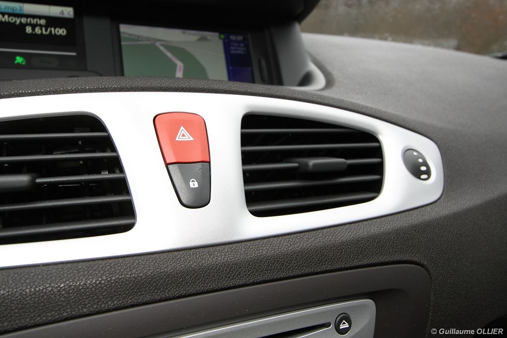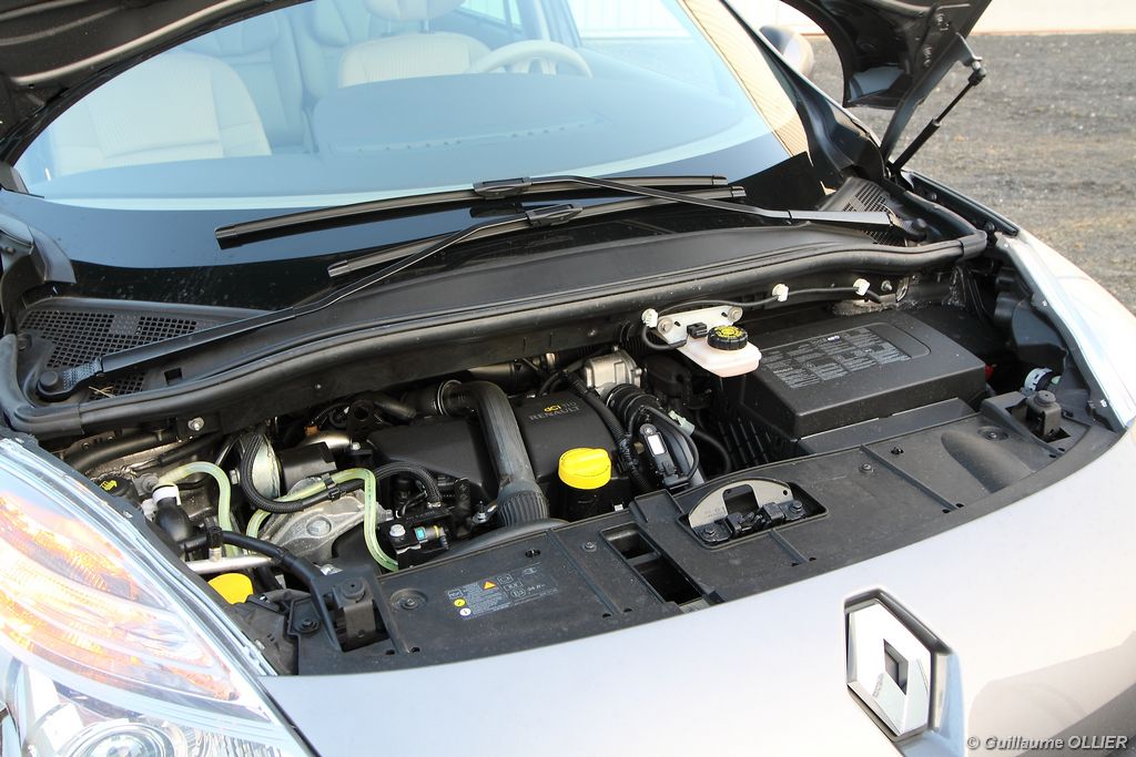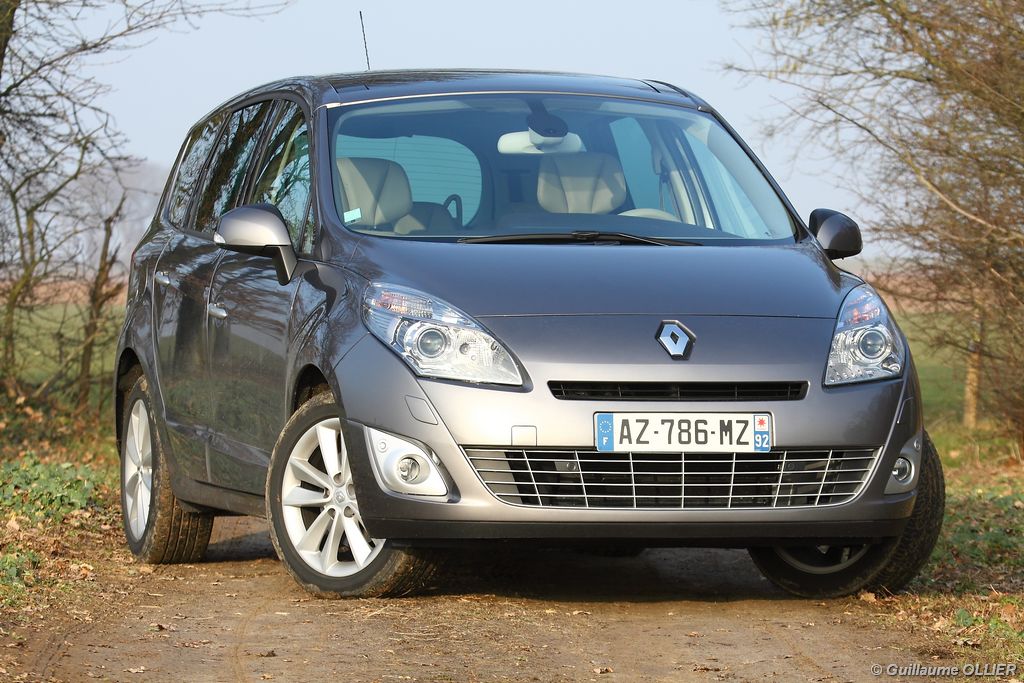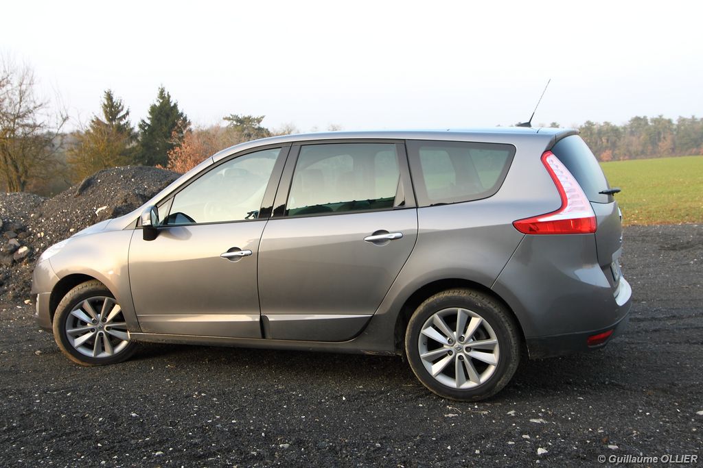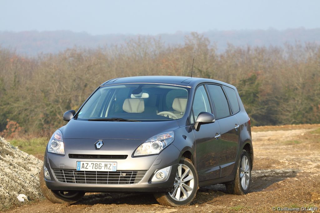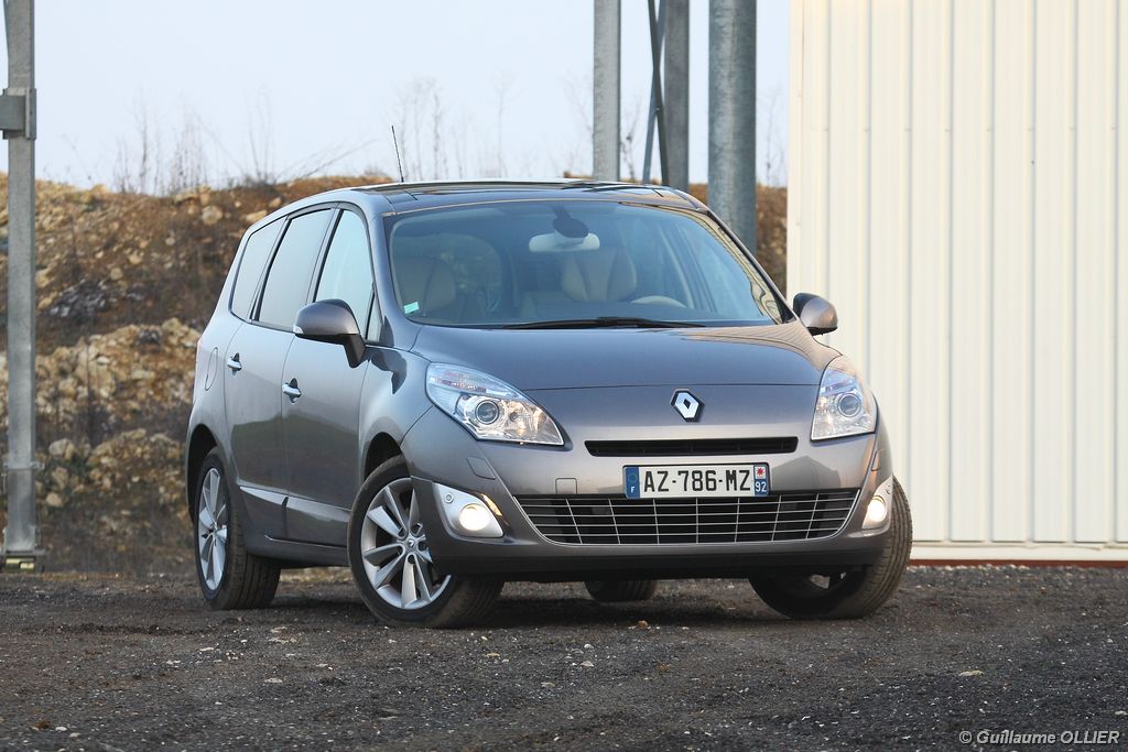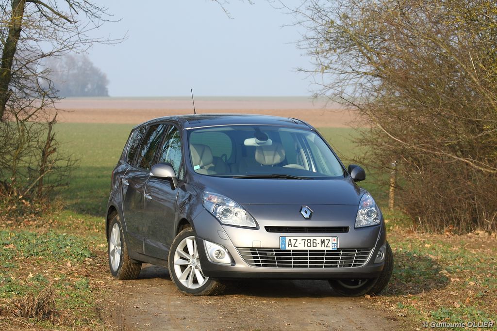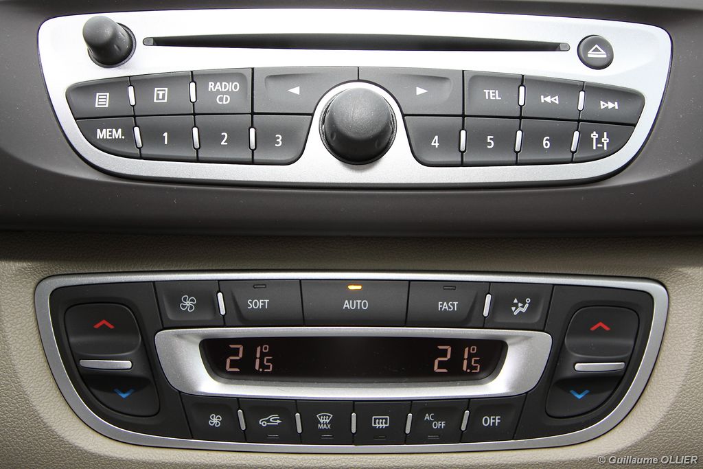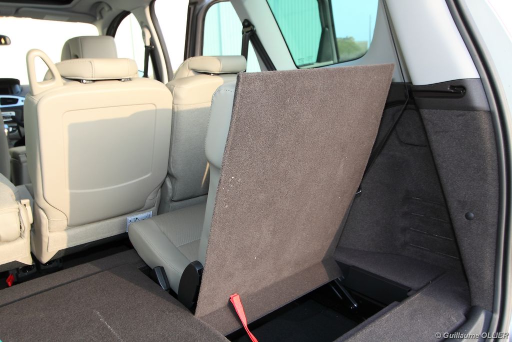 se montre lisible en toutes circonstances et très réactif notamment l’affichage du compte-tours. Nous avons apprécié la richesse des fonctionnalités tel que la personnalisation de l’affichage, la fonction de streaming audio Bluetooth, la compatibilité avec l’iPod ou encore la carte mains libres. Les équipements proposés sont assez nombreux, la carte mains libres, et le frein de parking automatique vous facilitent la vie au quotidien. Une caméra de recul est même disponible en option à 300€, c’est une première pour un monospace français ! Enfin, mention spéciale pour le système de navigation GPS Carminat TomTom. Celui-ci se révèle extrêmement intuitif et offre une ergonomie parfaite grâce à la commande située à l’extrémité de l’accoudoir. Au chapitre volume de chargement, le coffre affiche un espace important de 564 litres s’étendant jusqu’à 2 063 litres une fois les trois sièges arrière retirés. De largeur identique et coulissants, ils peuvent se rabattre indépendamment voire être retirés de l’habitacle. La modularité est un peu dépassée, chez certains concurrents les sièges se dissimulent par exemple dans le plancher. A noté que le siège avant passager peut se rabattre pour le transport d’objets longs. Les deux places arrière s’escamotent facilement, pour les longs trajets des enfants seront plus à l’aise que des adultes. Côté rangements à bord, le Scénic reste la référence avec un volume total impressionnant de 92 litres. La liste des emplacements est longue : quatre trappes sous plancher, deux tiroirs sous sièges à l’avant, 2 tiroirs aux places latérales arrière, une boîte à gants réfrigérée de plus de 11 litres, un rangement ouvert sur la console centrale et une console centrale de 9 litres de rangement en deux parties. Sans oublier les poches aumônières au dos des sièges et deux autres rangements dans le coffre.