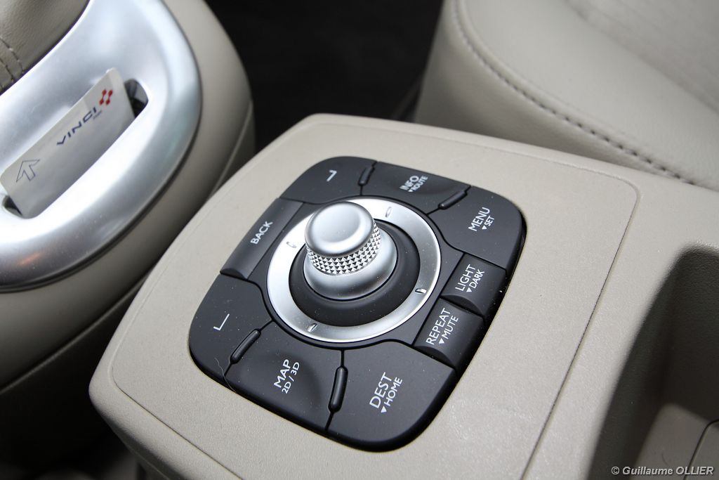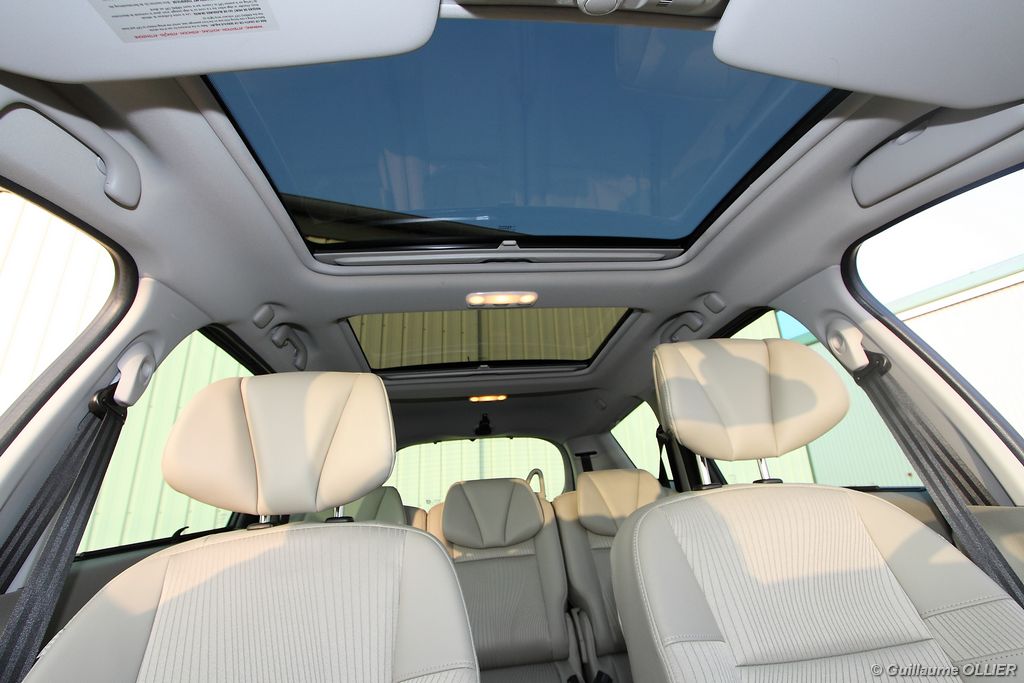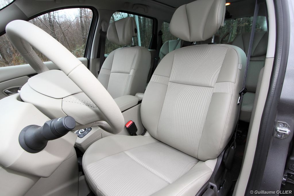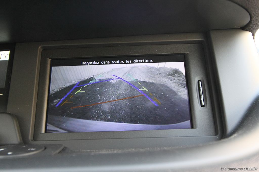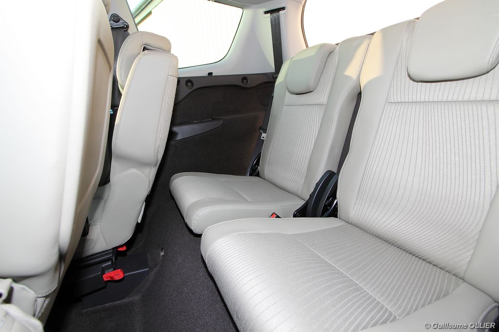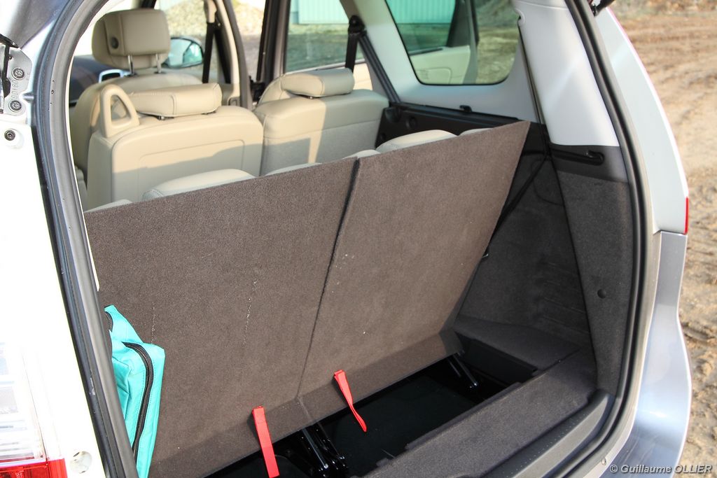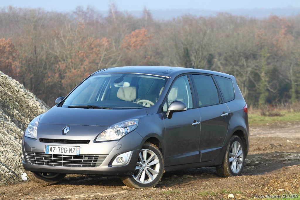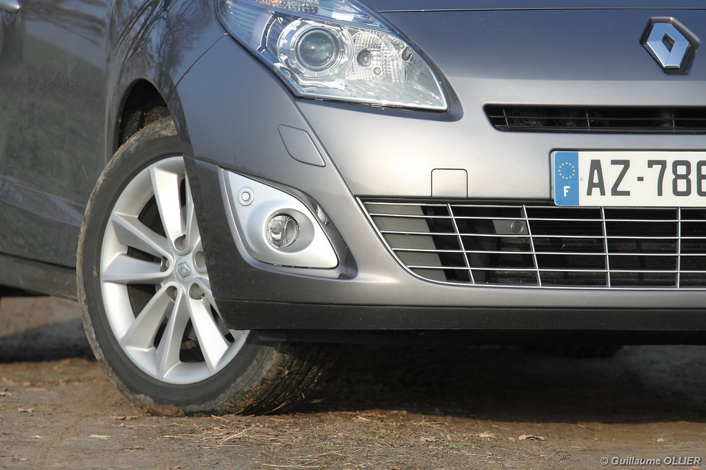 se montre lisible en toutes circonstances et très réactif notamment l’affichage du compte-tours. Nous avons apprécié la richesse des fonctionnalités tel que la personnalisation de l’affichage, la fonction de streaming audio Bluetooth, la compatibilité avec l’iPod ou encore la carte mains libres. Les équipements proposés sont assez nombreux, la carte mains libres, et le frein de parking automatique vous facilitent la vie au quotidien. Une caméra de recul est même disponible en option à 300€, c’est une première pour un monospace français ! Enfin, mention spéciale pour le système de navigation GPS Carminat TomTom. Celui-ci se révèle extrêmement intuitif et offre une ergonomie parfaite grâce à la commande située à l’extrémité de l’accoudoir. Au chapitre volume de chargement, le coffre affiche un espace important de 564 litres s’étendant jusqu’à 2 063 litres une fois les trois sièges arrière retirés. De largeur identique et coulissants, ils peuvent se rabattre indépendamment voire être retirés de l’habitacle. La modularité est un peu dépassée, chez certains concurrents les sièges se dissimulent par exemple dans le plancher. A noté que le siège avant passager peut se rabattre pour le transport d’objets longs. Les deux places arrière s’escamotent facilement, pour les longs trajets des enfants seront plus à l’aise que des adultes. Côté rangements à bord, le Scénic reste la référence avec un volume total impressionnant de 92 litres. La liste des emplacements est longue : quatre trappes sous plancher, deux tiroirs sous sièges à l’avant, 2 tiroirs aux places latérales arrière, une boîte à gants réfrigérée de plus de 11 litres, un rangement ouvert sur la console centrale et une console centrale de 9 litres de rangement en deux parties. Sans oublier les poches aumônières au dos des sièges et deux autres rangements dans le coffre.