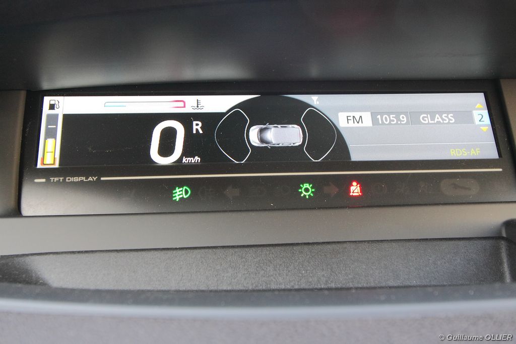 A l’intérieur du Scénic, on retrouve l’esprit des monospaces du losange. La planche de bord en forme de vague s’inspire de celle de la Mégane. La finition est globalement satisfaisante et l’harmonie des couleurs est très plaisante. La position de conduite en hauteur se montre agréable, mais le volant reste trop incliné à notre goût. L’espace aux places avant est dégagé avec les informations de conduite orientées vers tous les occupants. Au centre, sous une niche, un écran couleur haute résolution affiche la vitesse, l’état du limiteur/régulateur de vitesse, le dépassement de la vitesse de consigne, l’alerte des ouvrants, la pression des pneumatiques, l’aide au parking et la température. L’ensemble peut être personnalisé par le conducteur à l’aide d’un menu accessible par le biais d’une commande devant le tableau de bord. Ce dispositif d’affichage des informations de conduite