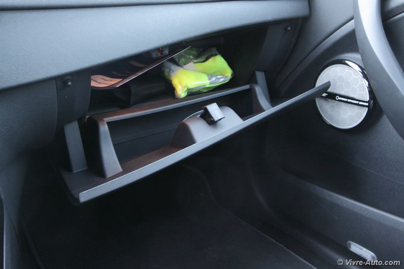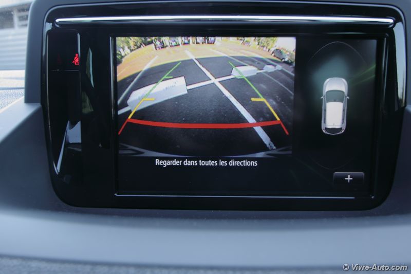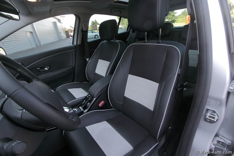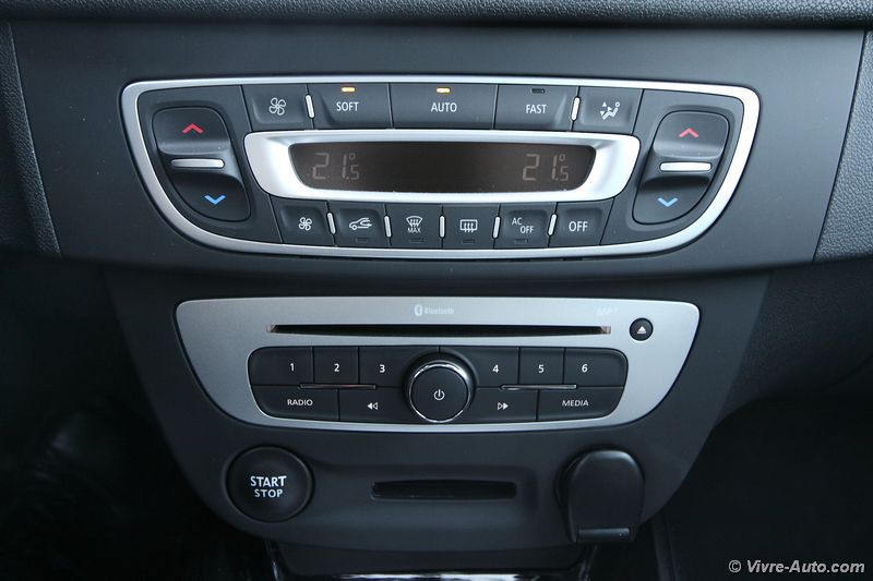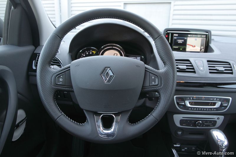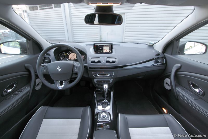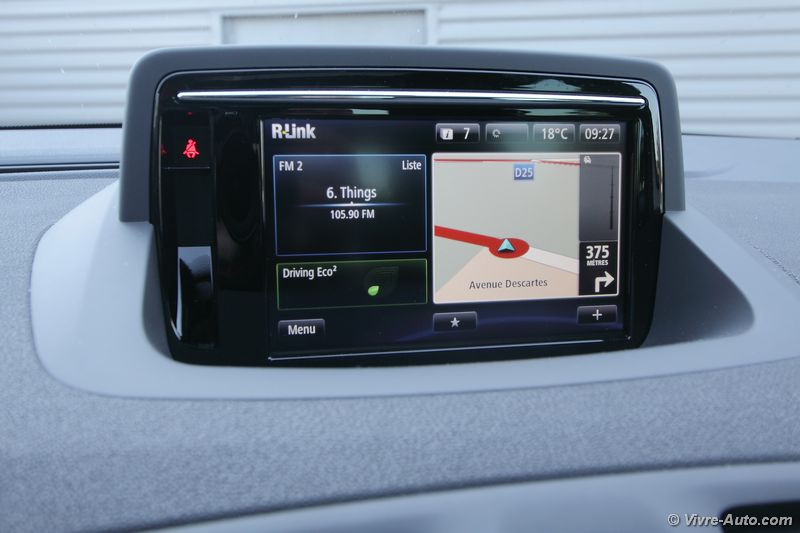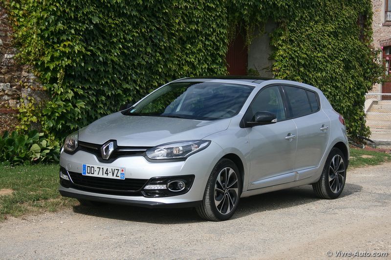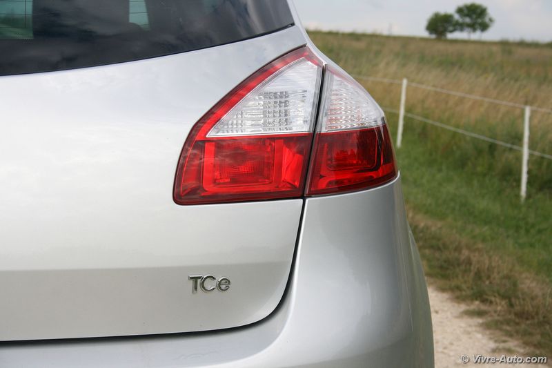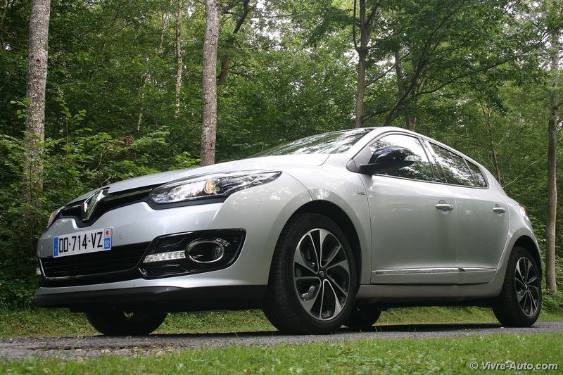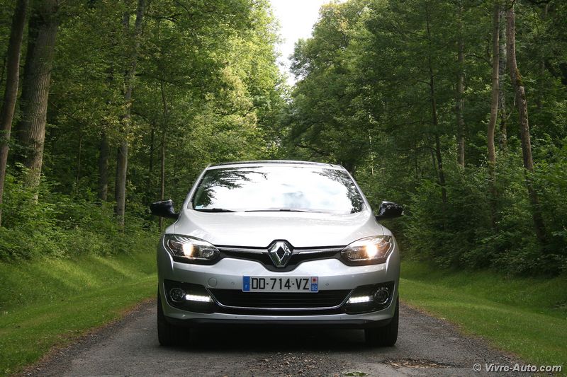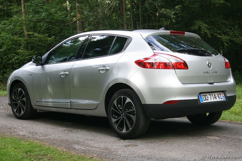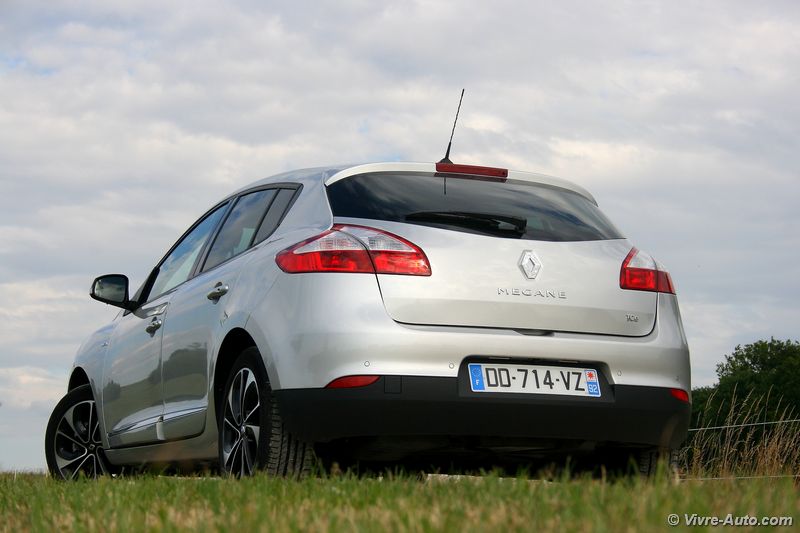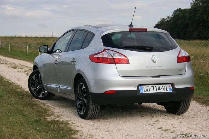 Renault Mégane TCe 130 - essai Vivre AutoA bord, les actuelles propriétaire de la Mégane ne verront pas de différence, rien à changé. Seul le système multimédia a été remplacé par le R-Link et sa tablette de 7 pouces qui regroupe le GPS, la téléphonie, le Bluetooth et une cinquantaine d’applications téléchargeables (mail, météo, Coyotte, Tweeter…). Cette interface est toujours pilotée vie la molette multifonction et très ergonomique située entre les deux sièges. Renault a également ajouté des équipements, l’aide au démarrage en côte, une  caméra de recul, les feux de route automatiques et l’alerte de franchissement de ligne (250€). L’habitabilité est toujours aussi bonne à l’avant avec une bonne position de conduite, mais les passagers arrière souffrent toujours d’un manque de place aux jambes. Le coffre est volumineux avec 405 litres de chargement. Notre modèle d’essai était en finition Bose, la plus haute. Elle comprend par exemple de série le volant cuir, la climatisation automatique bi-zone, la carte main libre, le système Hifi Bose, le GPS Europe, le Coyotte, la caméra de recul et le frein à main électrique.