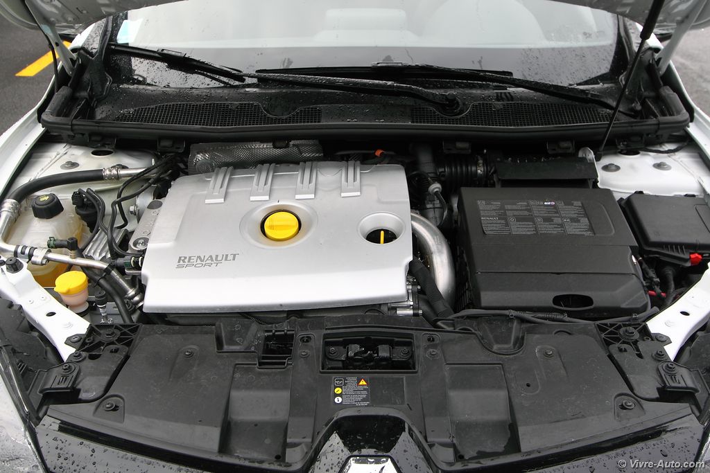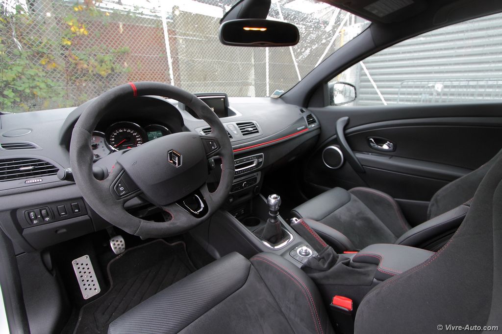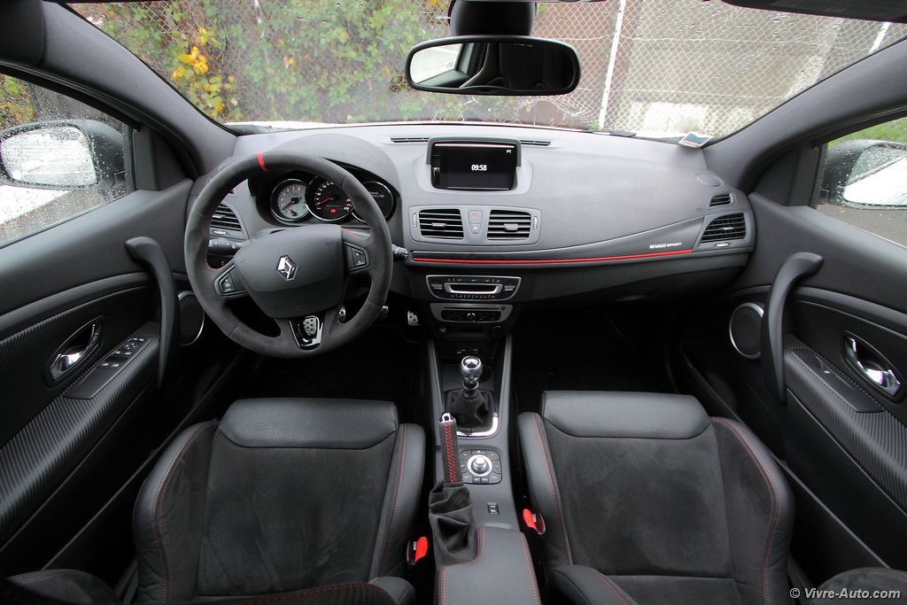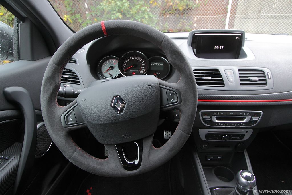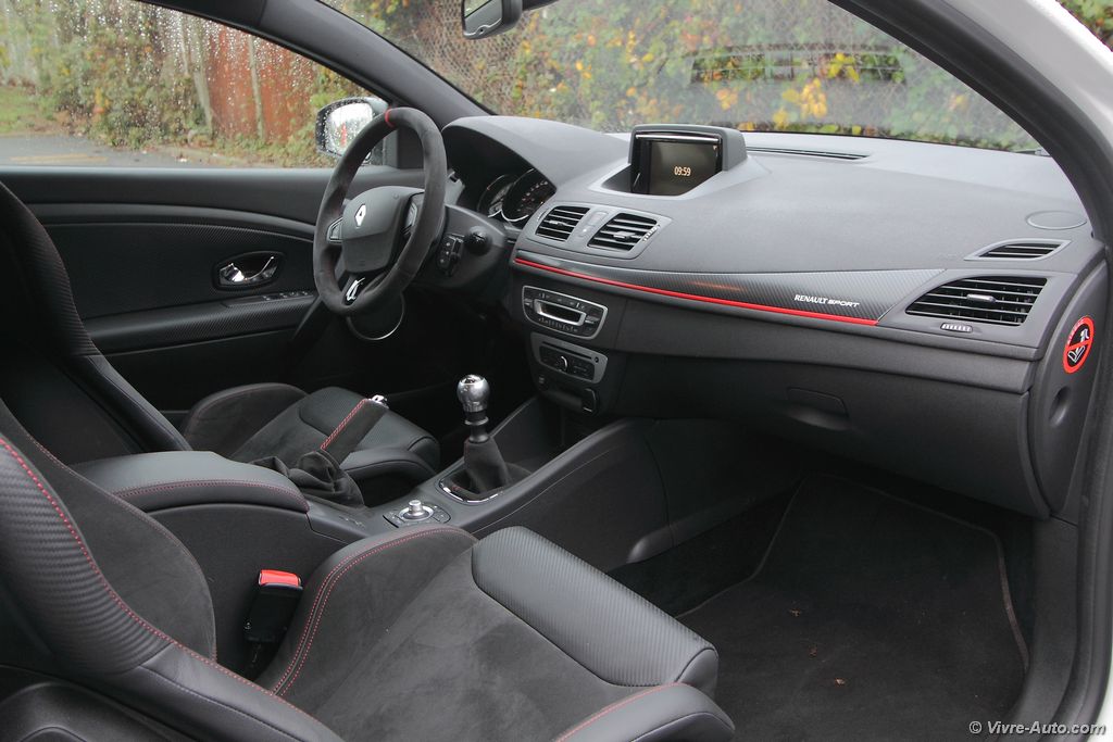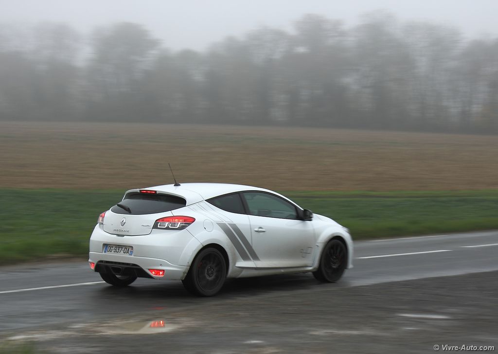 pétarade à la décélération. Le différentiel à glissement limité permet d’encaisser sans aucun souci le couple sur les roues avant et la Trophy passe très rapidement en courbe sans sous-virer. La direction est très précise et quasiment aucune remontée de couple ne se fait ressentir. La boîte de vitesses à six rapports remplit bien son rôle avec un bon étagement, notons que le rupteur a été reculé de quelques centaines de tours. En résumé, cette Mégane n’attend qu’une chose, qu’on l’emmène sur un circuit ! Mais en plus, elle offre aussi la possibilité de rouler au quotidien sans désagrément. Ce qui n’est pas le cas de la version Trophy-R dépourvue de banquette arrière et de climatisation.