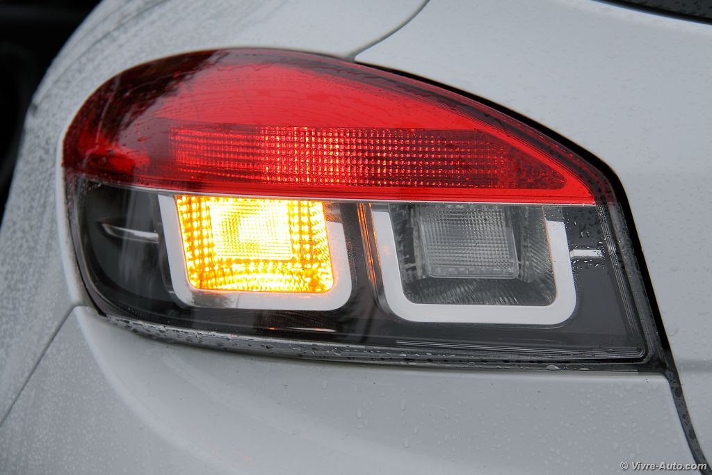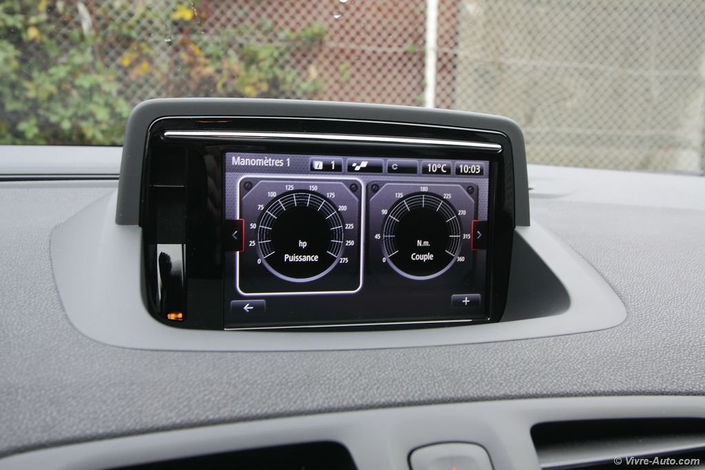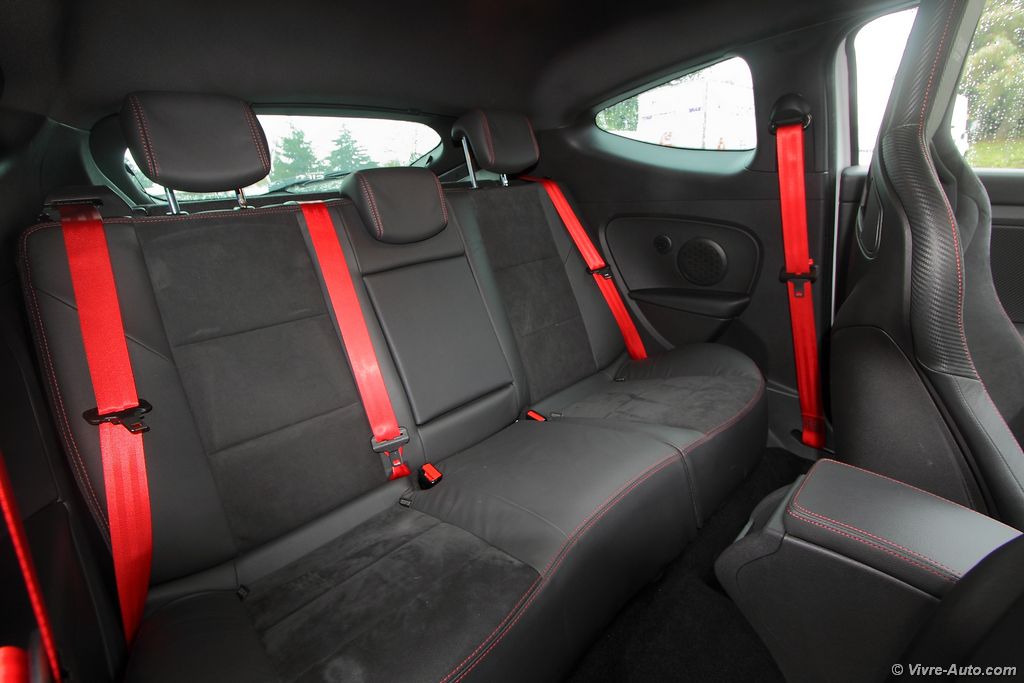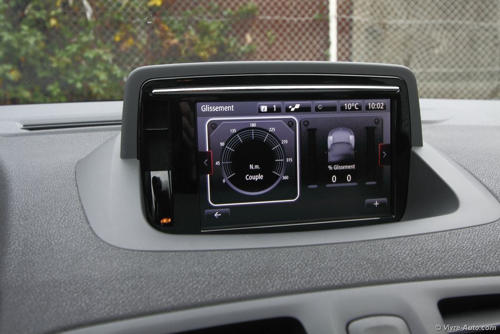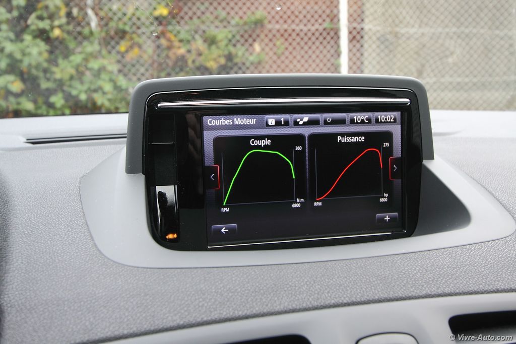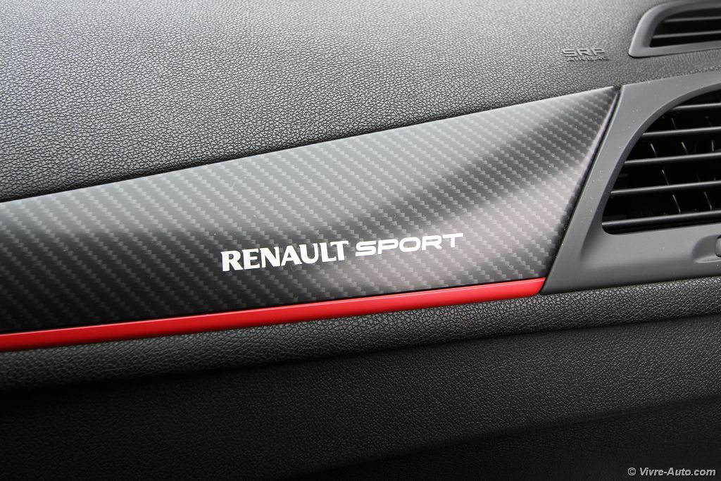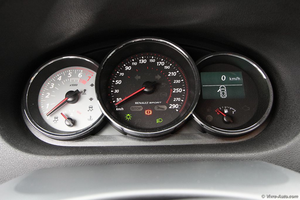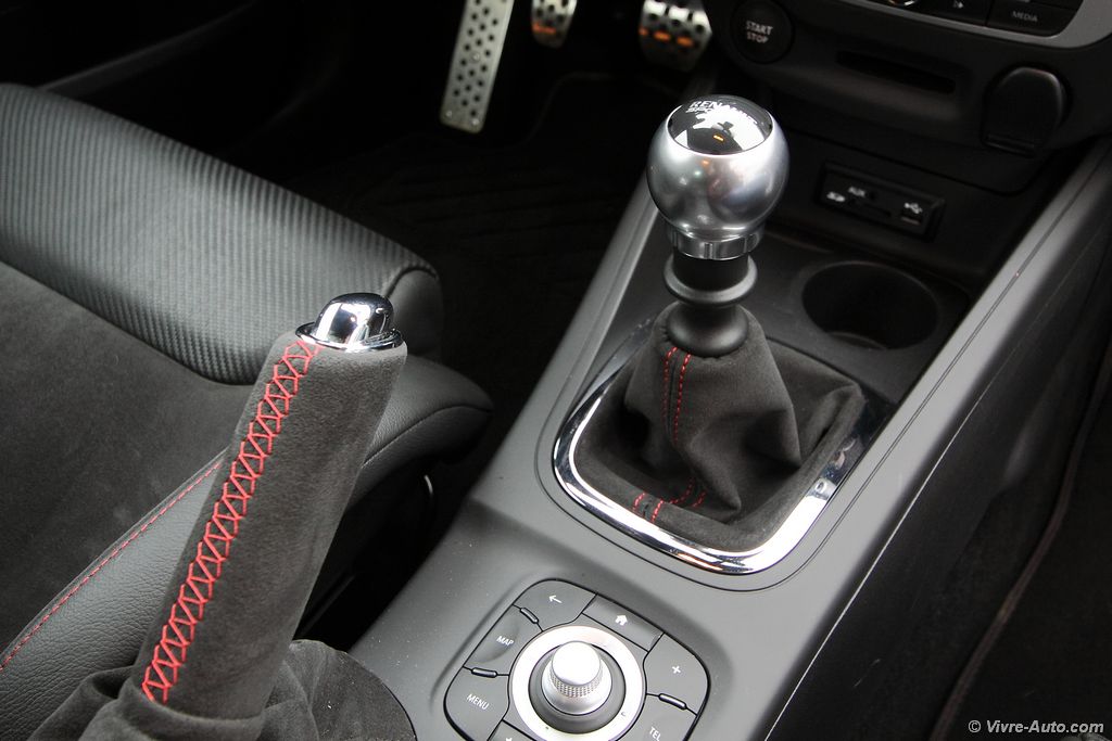 A bord, la Trophy 275 propose des sièges baquets Recaro en cuir alcantara avec des surpiqûres rouge, que l’on retrouve aussi sur le volant et le soufflet de frein à main. Le volant en alcantara est particulièrement agréable au toucher et la position de conduite est excellente pour un usage sportif. Le système multimédia R-Link dispose du R.S. Moniteur, une application qui regroupe l’ensemble des informations du véhicule telles que le régime moteur, le couple, la puissance, l’angle du volant, l’odomètre, la température d’huile et l’air collecteur. Mais également des outils pour le pilotage sur circuit avec un chronomètre pour le 0 à 50 km/h ou 100 km/h. Il permet aussi de charger des cartes de circuits et ainsi de connaître son temps au tour. L’ensemble des paramètres peut être enregistré sur une clé USB. Pour le reste, le catalogue des équipements est assez complet avec tout le nécessaire : carte mains libres, caméra de recul, Bluetooth, GPS, régulateur/limitateur de vitesse, au passage très utile sur ce modèle pour garder son permis.
