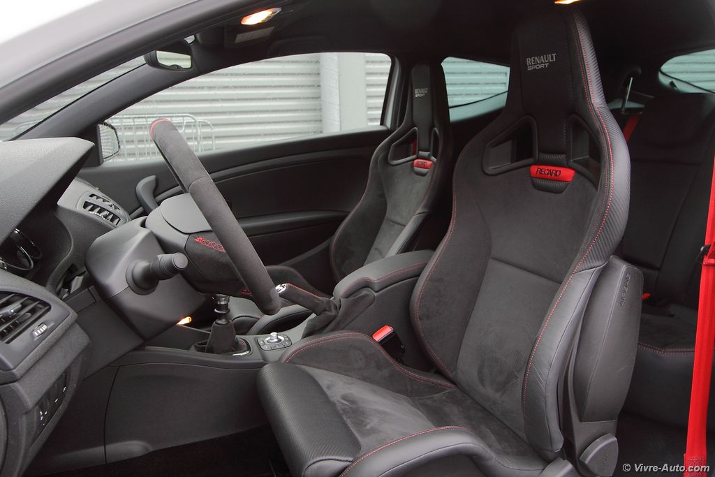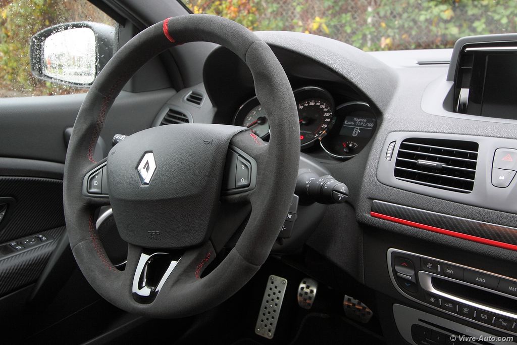 Une fois installé confortablement dans les sièges, l’accès à bord n’étant pas particulièrement difficile malgré les Recaro, on démarre le moteur. Le son est assez proche de la Mégane R.S. classique. Comme son nom l’indique, la Trophy 275 ajoute 10 ch supplémentaires au 2.0L turbo. Les 275 ch sont atteints à 5.500 tr/mn quant au couple, il reste inchangé, 360 Nm entre 3.000 et 5.000 tr/mn. C’est aussi le cas pour la consommation, toujours annoncée à 7,5 l/100 km et 174 g de CO². Sur le papier, la Trophy 275 est dotée du châssis Cup, on s’attend donc à ressentir quelques douleurs dans le dos après plusieurs kilomètres. Et bien non, malgré la fermeté de la suspension, les irrégularités de la route sont plutôt bien filtrées et les longs trajets ne posent ainsi pas de problème !